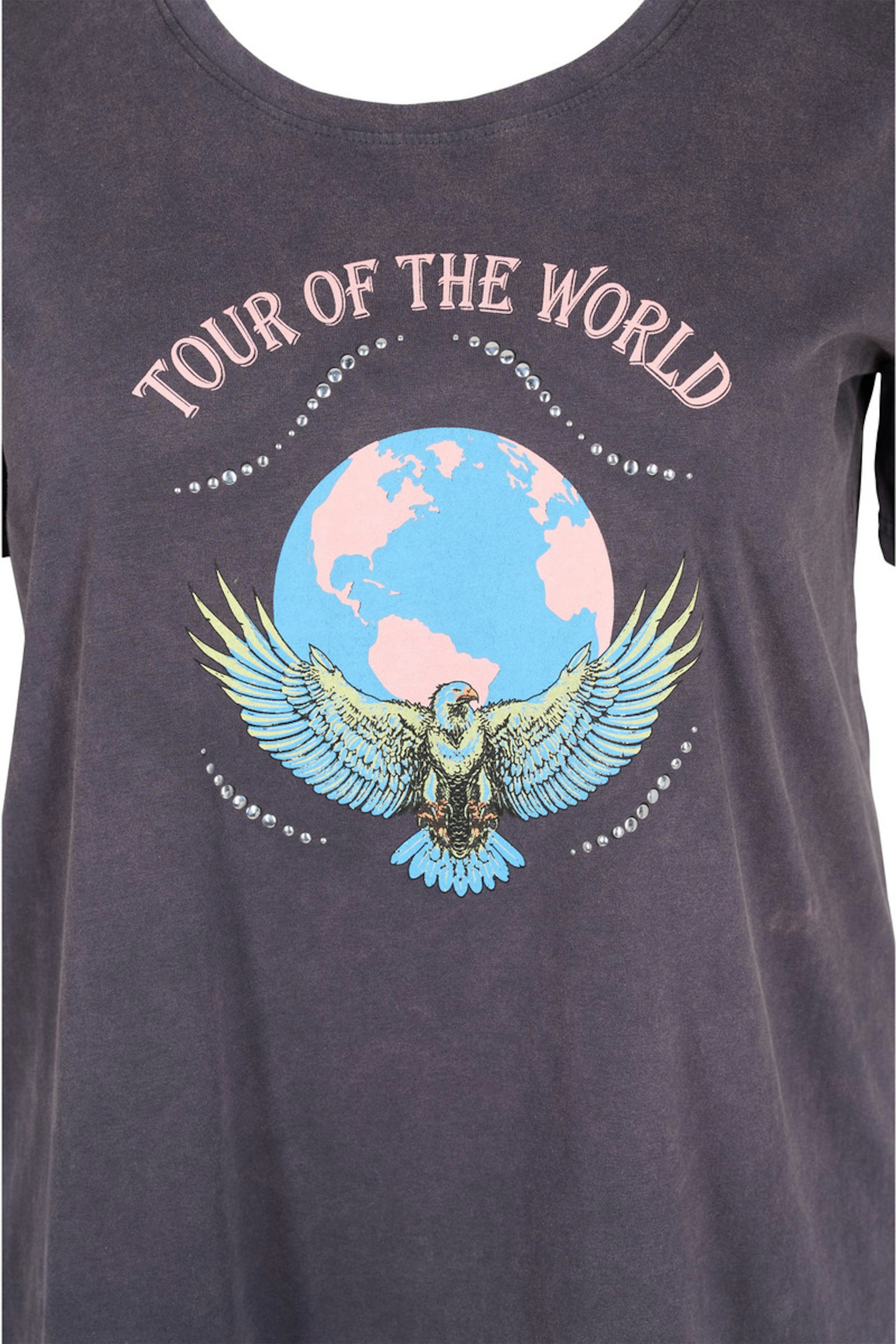 โข T-shirt gris ร imprimรฉ โข Style vintage โข Manches courtes โข Col rond โข Tissu contenant 50% de coton biologique