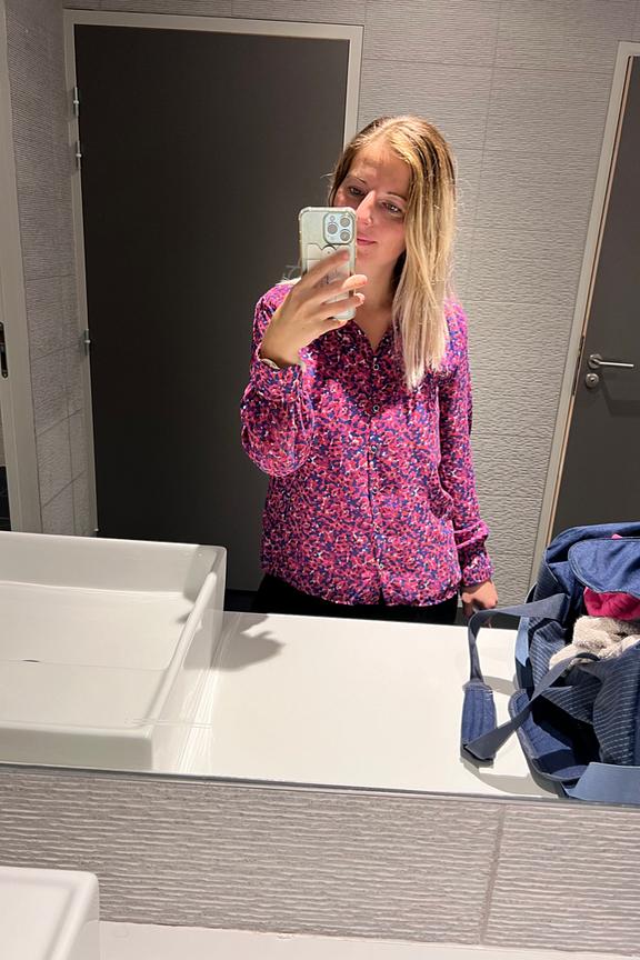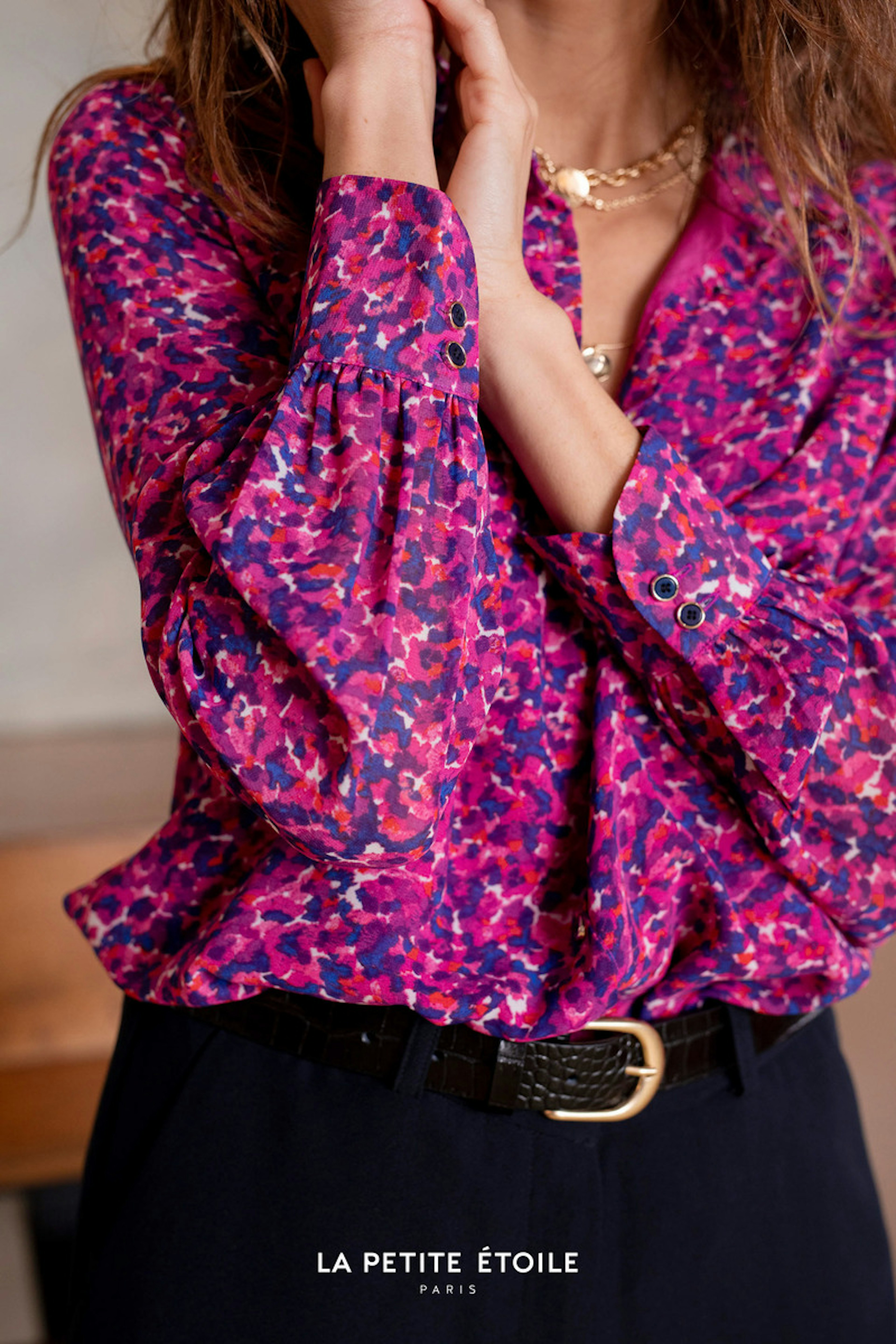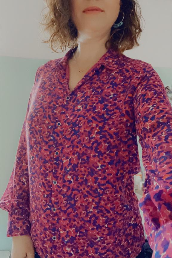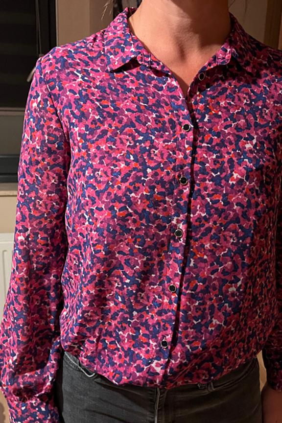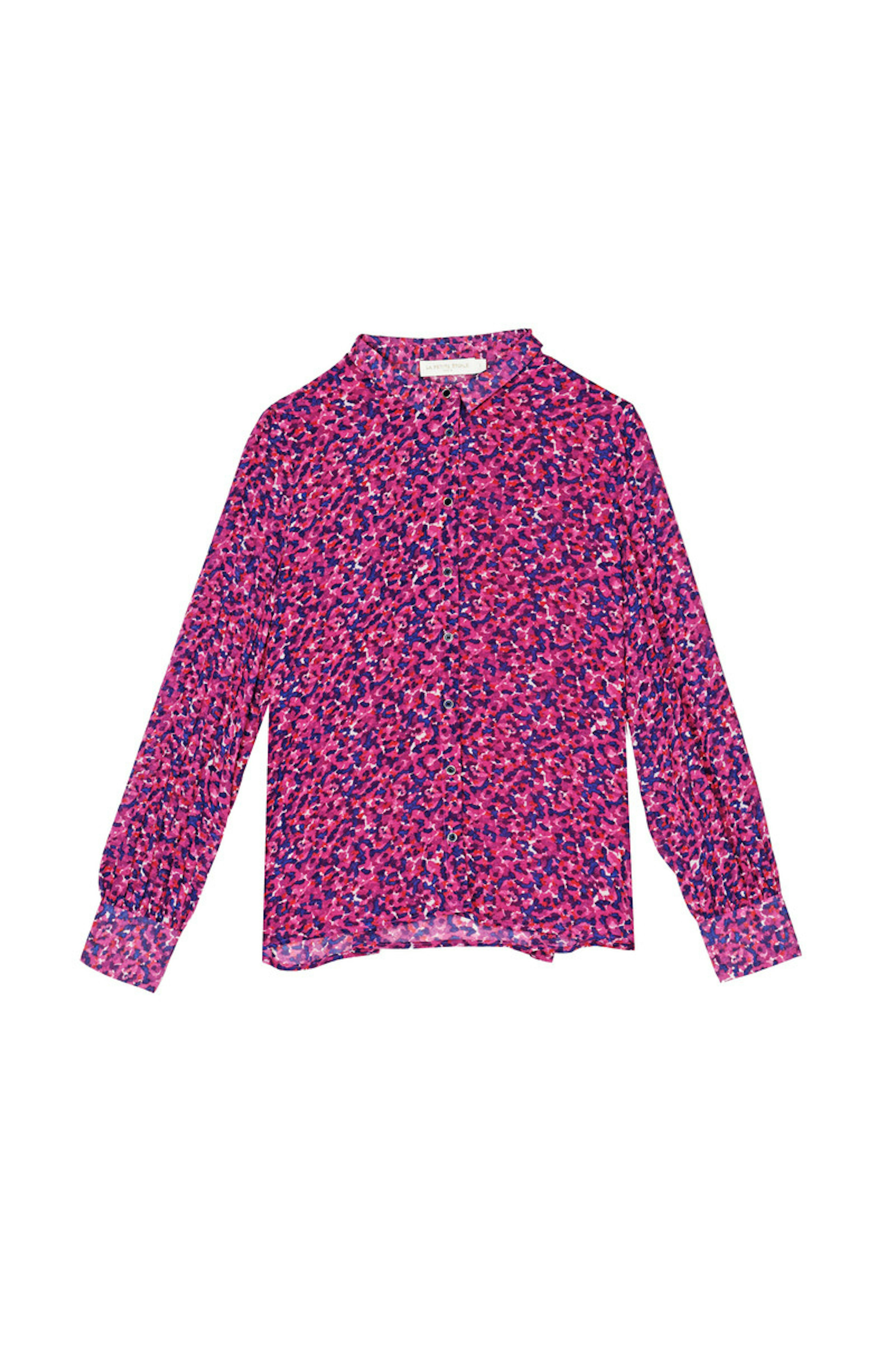 โ€ข Blouse ร  manches longues imprimรฉe rose โ€ข Imprimรฉ abstrait rose et violet โ€ข Patte de boutonnage sur le devant โ€ข Col chemise