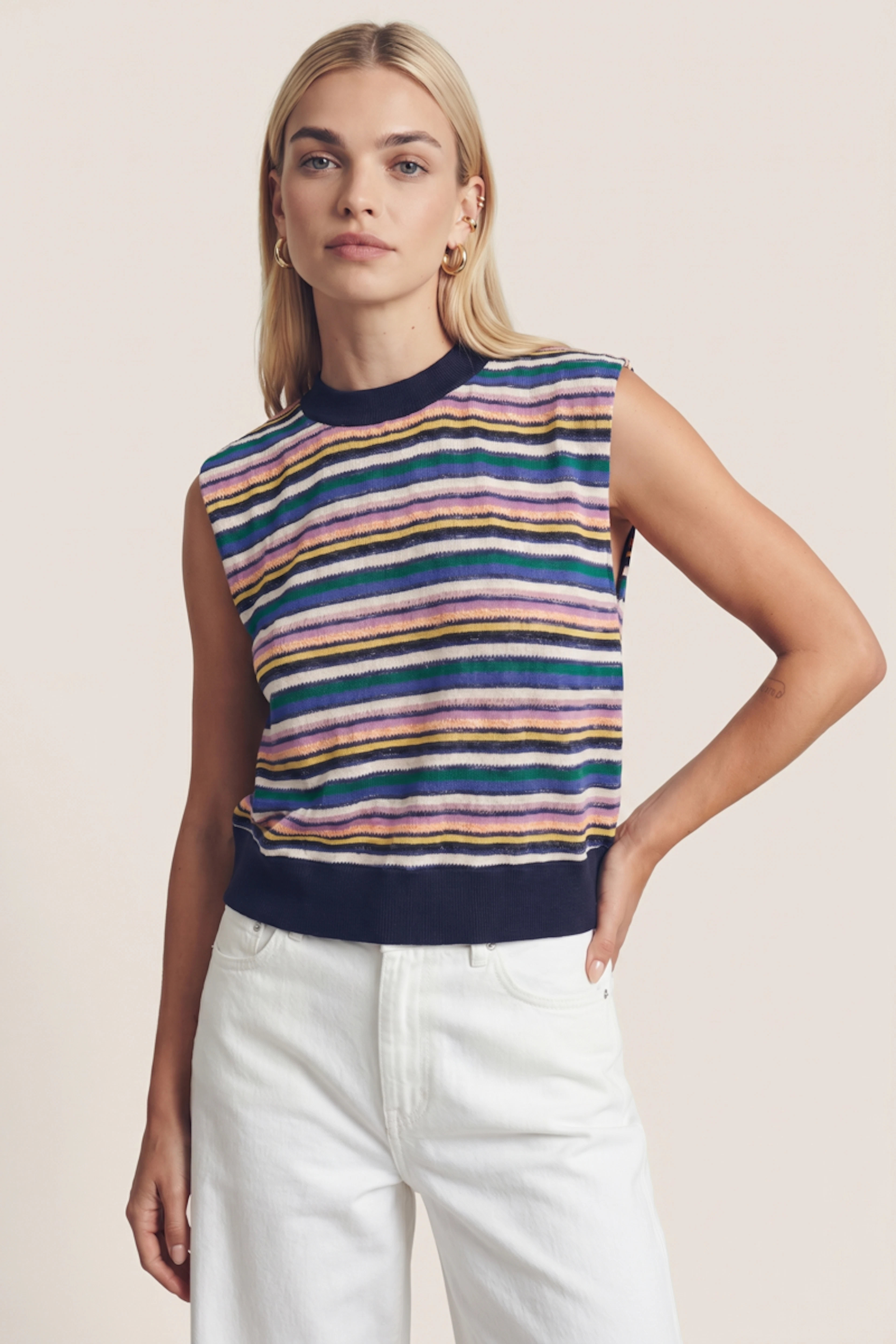 Associez ce haut à un pantalon beige et des mocassins pour un look estival élégant. • Haut sans manches • Coupe droite • Col rond • Motif rayé • Ourlet contrastant