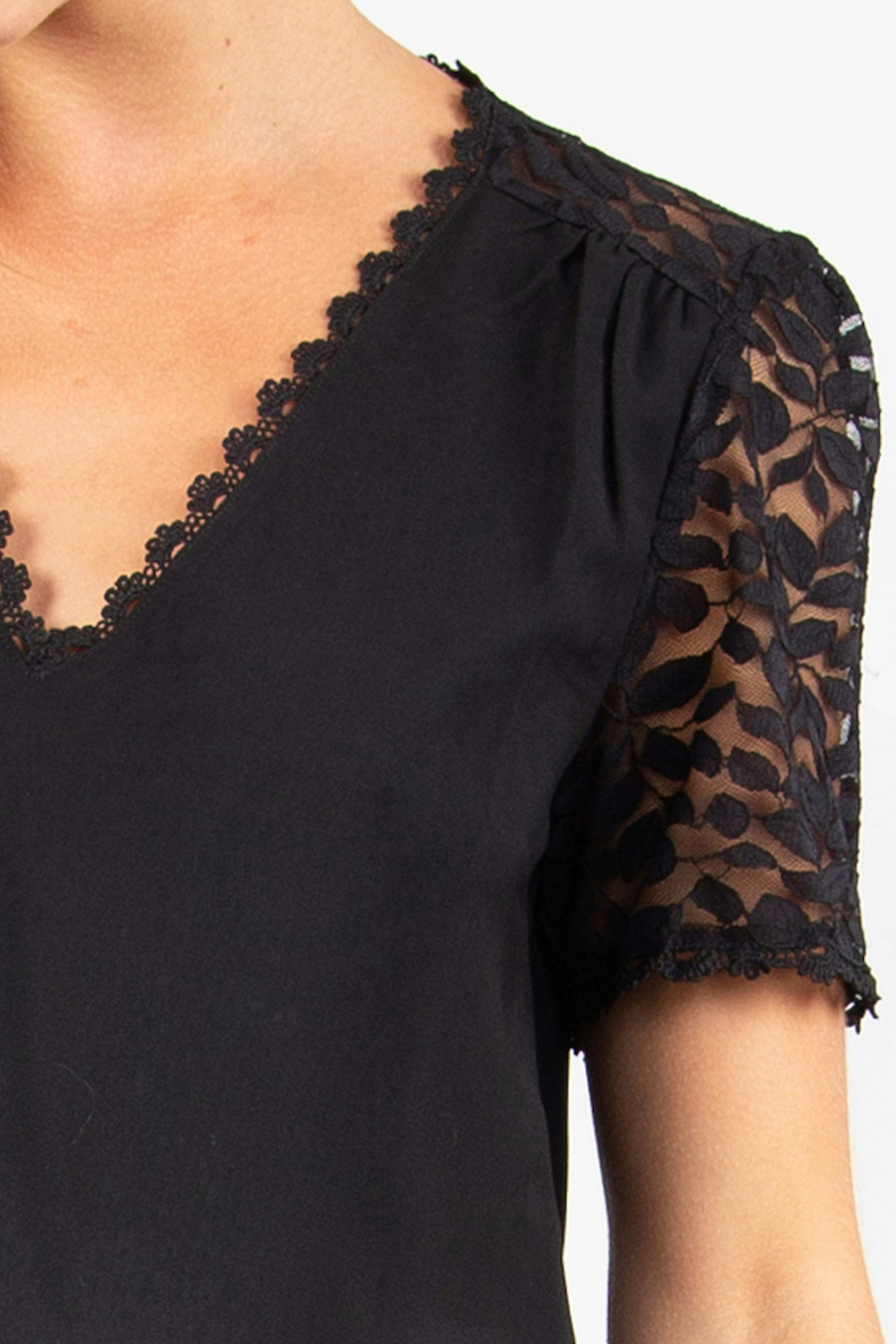 โข Top noir ร manches courtes โข Encolure en v โข Manches courtes transparentes โข Empiรจcements en dentelle au niveau du dรฉcolletรฉ, des manches et dans le haut du dos โข Fermeture via goutte dans le haut du dos
