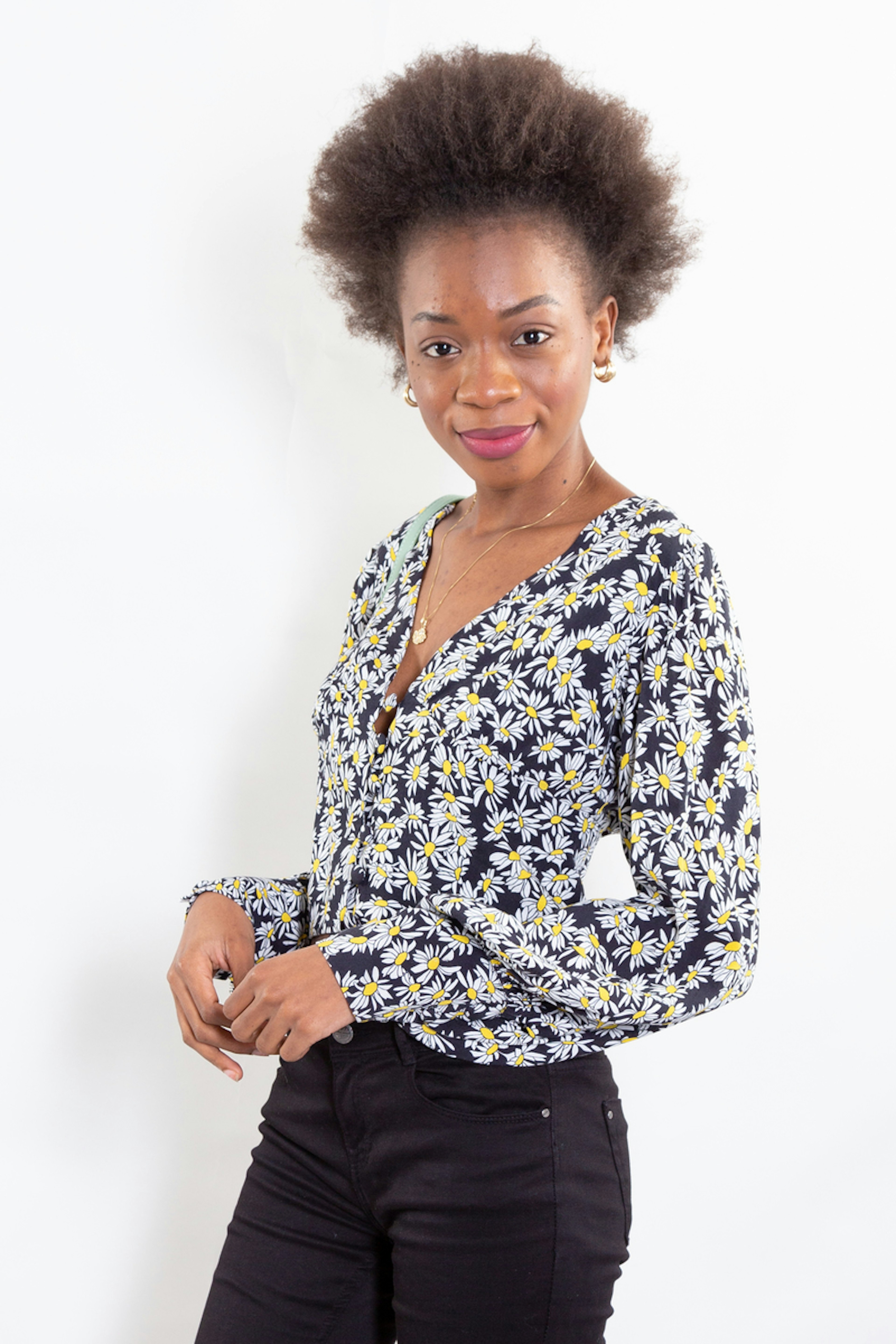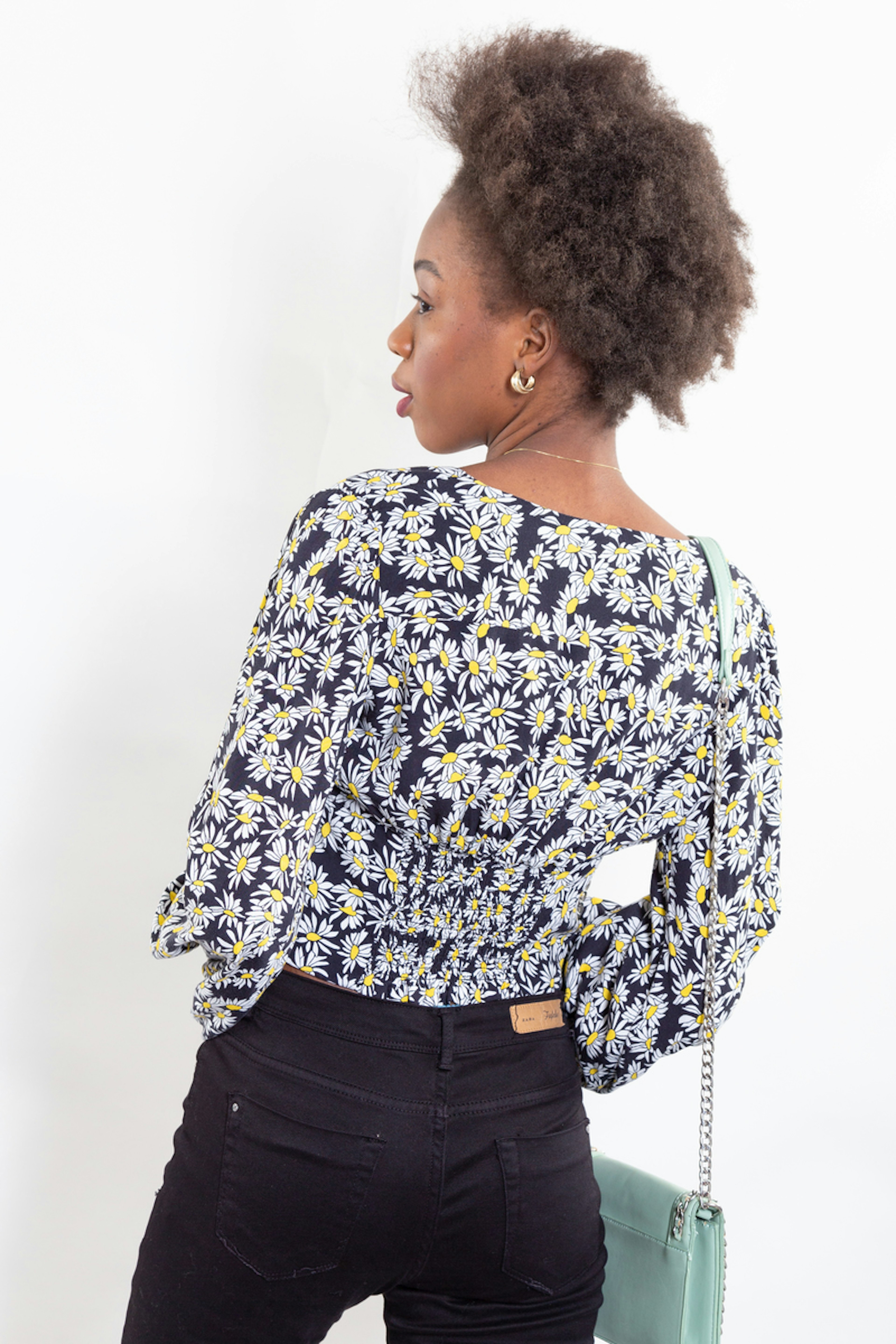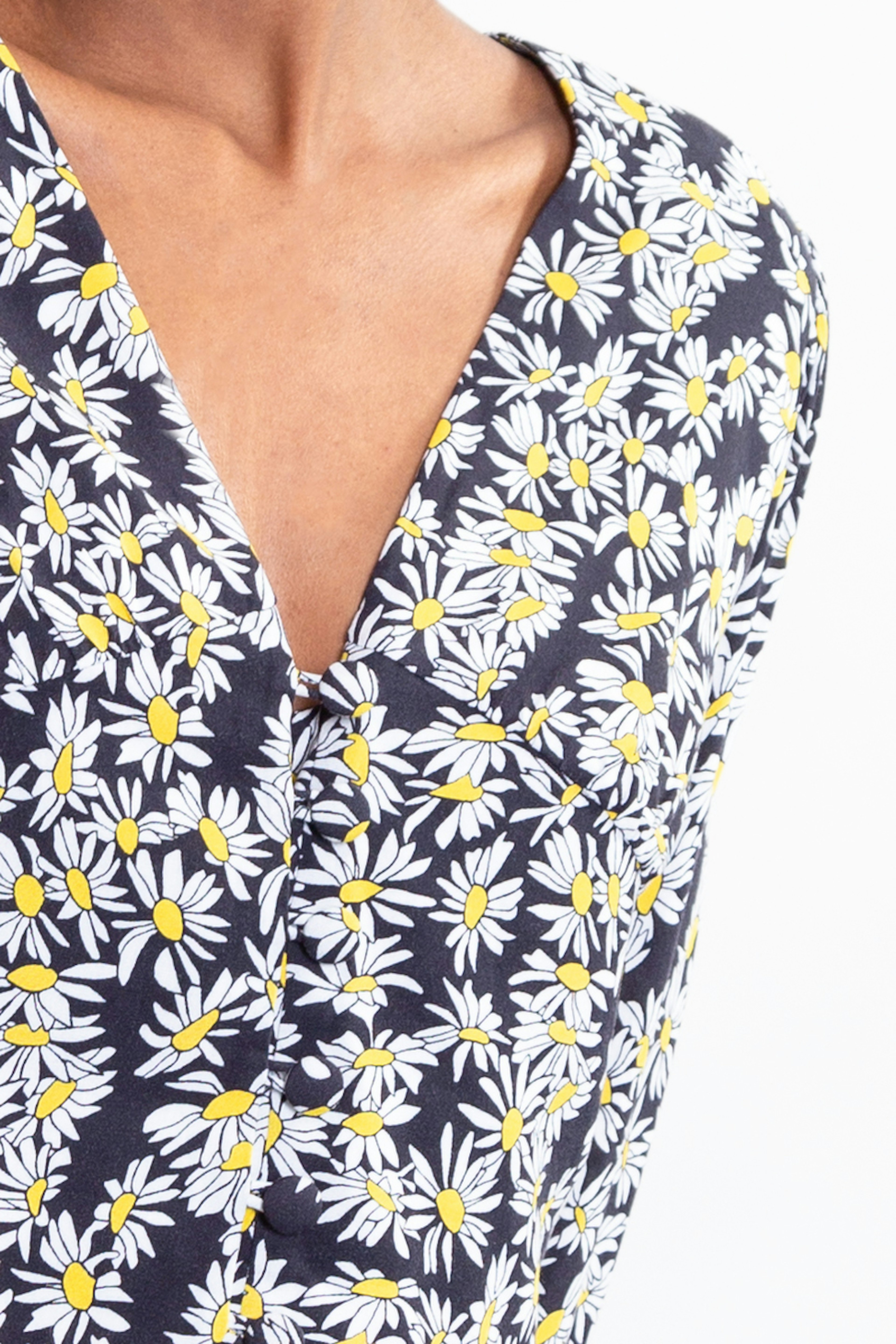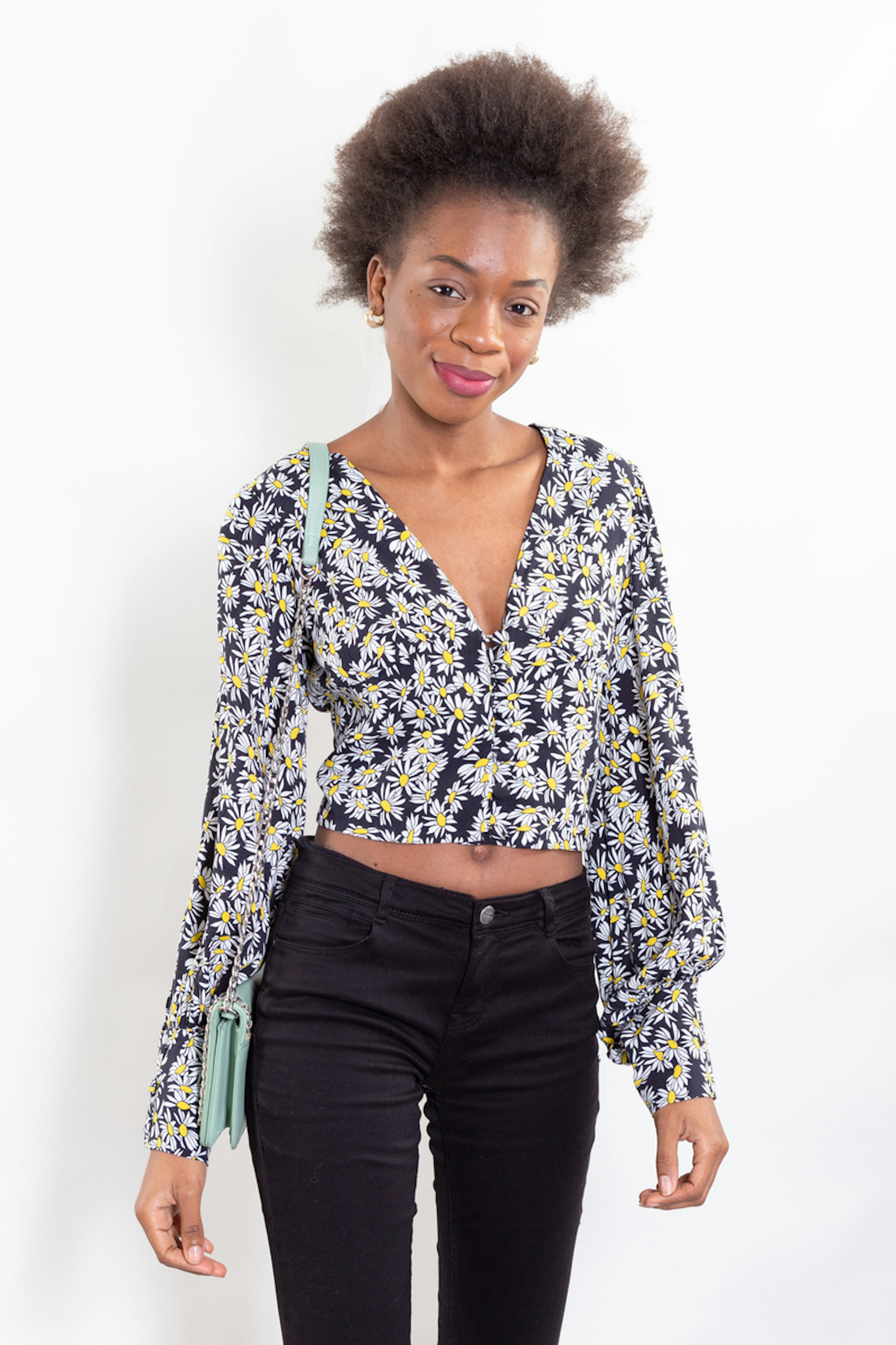 Le top parfait pour prolonger l'รฉtรฉ ! โ€ข Haut court ร  manches longues โ€ข Imprimรฉ marguerite blanc et jaune sur fond noir โ€ข A porter avec un jean taille haute noir