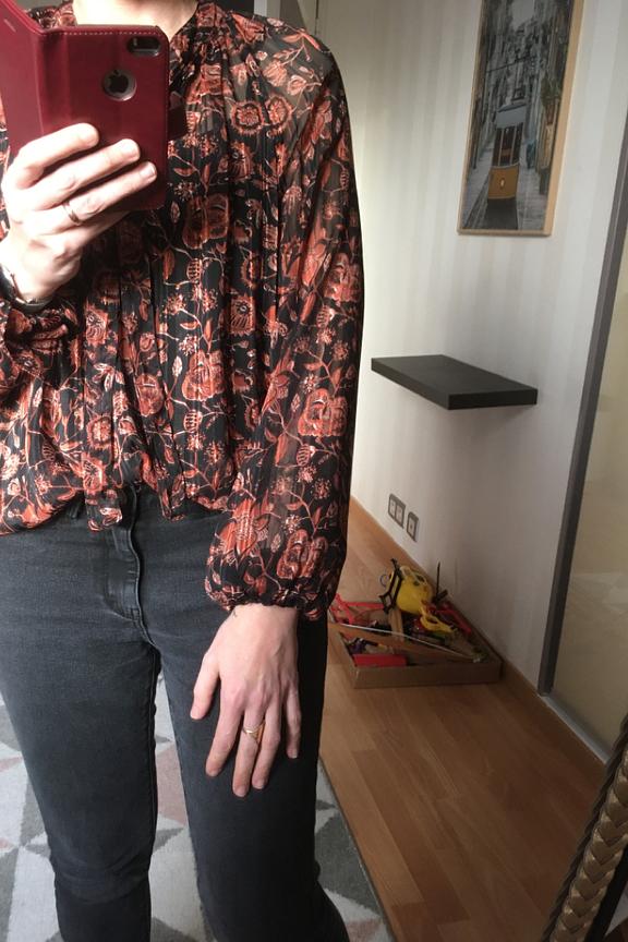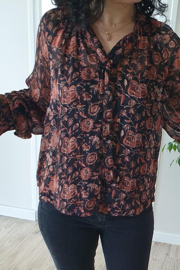 โข Blouse fluide noire et brique โข Ouverture boutonnรฉe avec Lavalliรจre โข Bas des manches volantรฉ โข Transparent โข Conรงu en polyester recyclรฉ