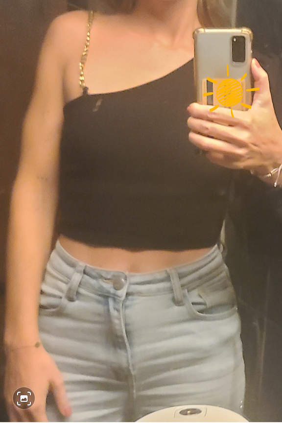 Associez ce top one shoulder avec un jean skinny et des talons pour un look chic, idéal en toute saison. • Top one shoulder • Chaîne dorée épaule • Manche boutonnée • Zip latéral • Noir uni