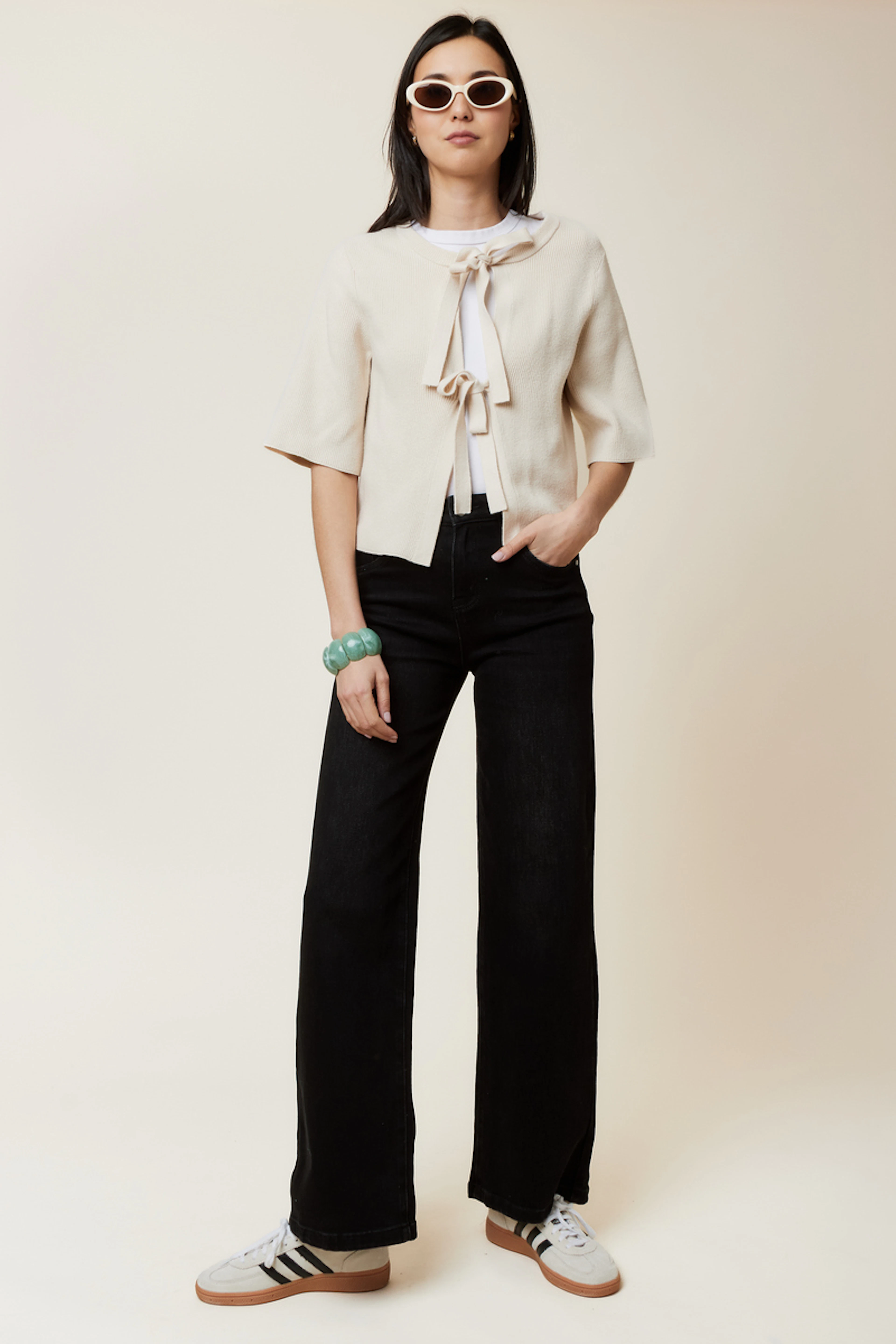 Ajoutez une touche sophistiquée avec ce haut beige délicat. Associez-le à un jean taille haute ou une jupe fluide pour un look chic et intemporel. Parfait pour toutes les saisons. • Haut noué • Manches courtes • Ouvert sur le devant • Col rond • Texture côtelée