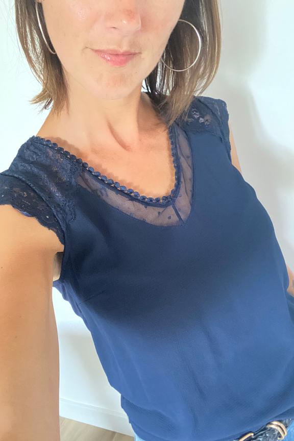 โข Top ร manches courtes volantรฉes marine โข Col V avec dรฉtails de transparence โข Intemporel de la garde-robe
