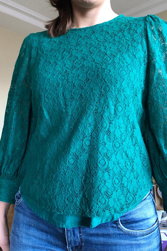 โข Blouse en dentelle fleurie et ajourรฉe verte โข Jeu de transparence sur les manches โข Manches longues lรฉgรจrement en ballon โข Poignets bishop avec deux boutons dorรฉs โข Fronces aux รฉpaules et aux poignets โข Goutte dans le dos fermรฉe par un bouton