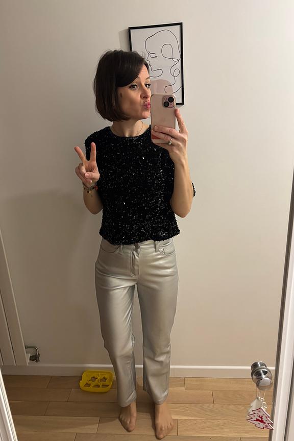 Ajoutez une touche de glamour ร votre tenue avec ce haut. Associez-le ร un pantalon taille haute pour un look chic d'hiver. โข Haut ร sequins โข Coupe droite โข Ouverture dans le dos โข Manches courtes โข Effet scintillant