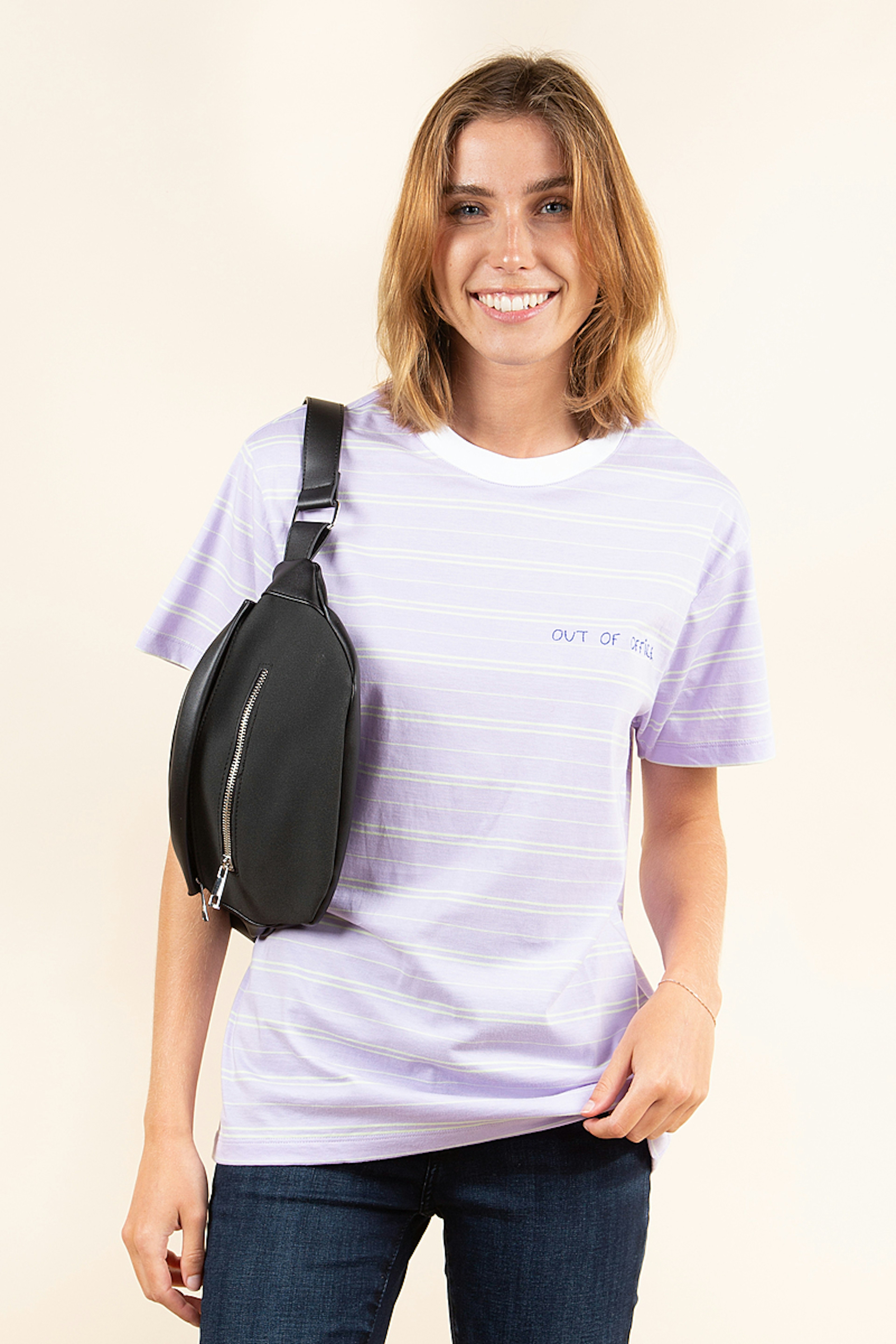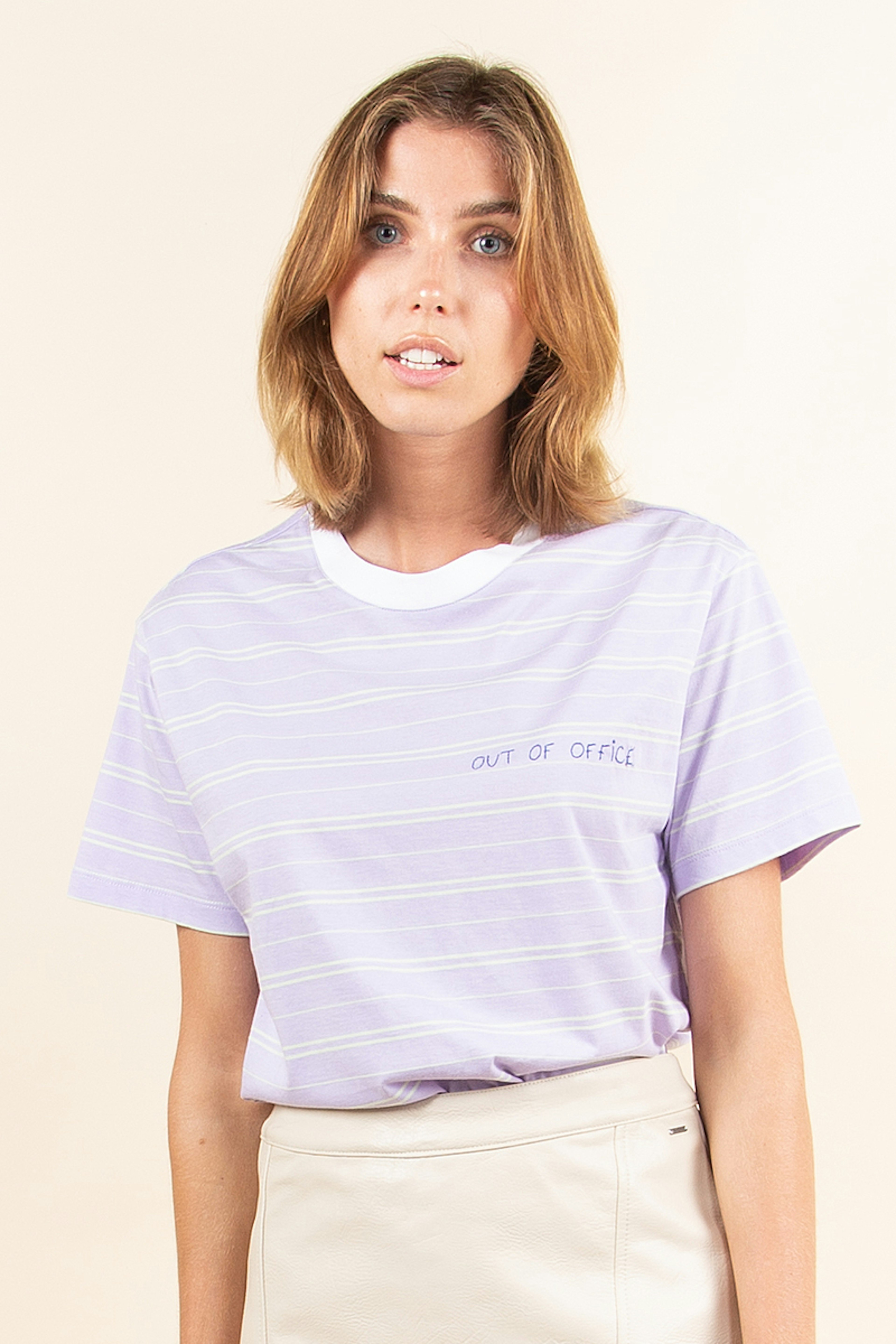 Optez le haut Popincourt ร la coupe unisexe dans ce lilas rayรฉ original. โข Dรฉtail broderie "out of office" โข Manches courtes โข Coupe droite unisexe โข Coton bio certifiรฉ GOTS โข Fabrication au Portugal