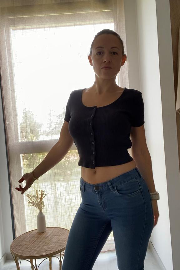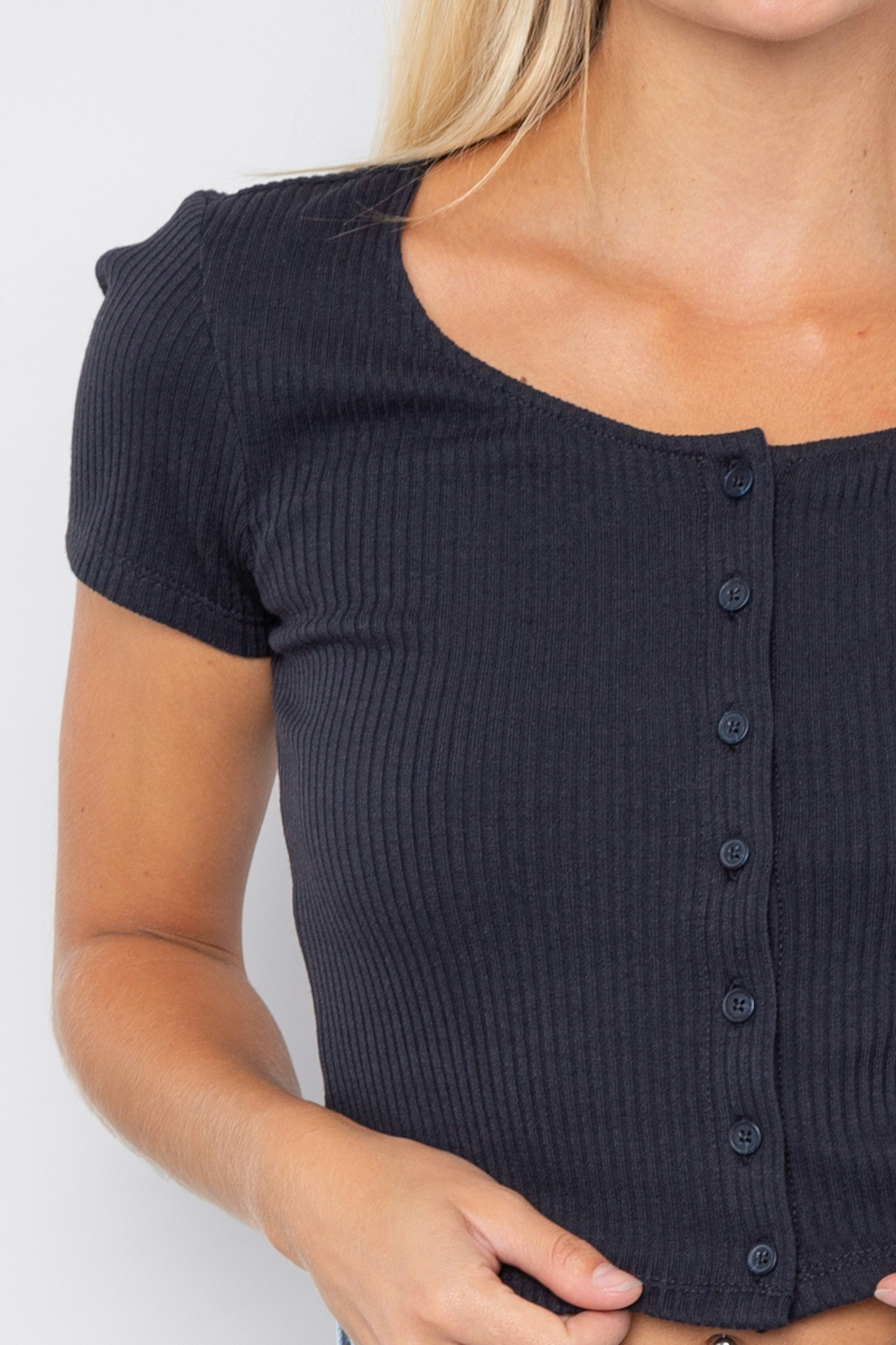 โข Crop top ร manches courtes noir โข Col rond avec boutons fantaisie โข A porter avec un jean taille haute โข Contient du tencel