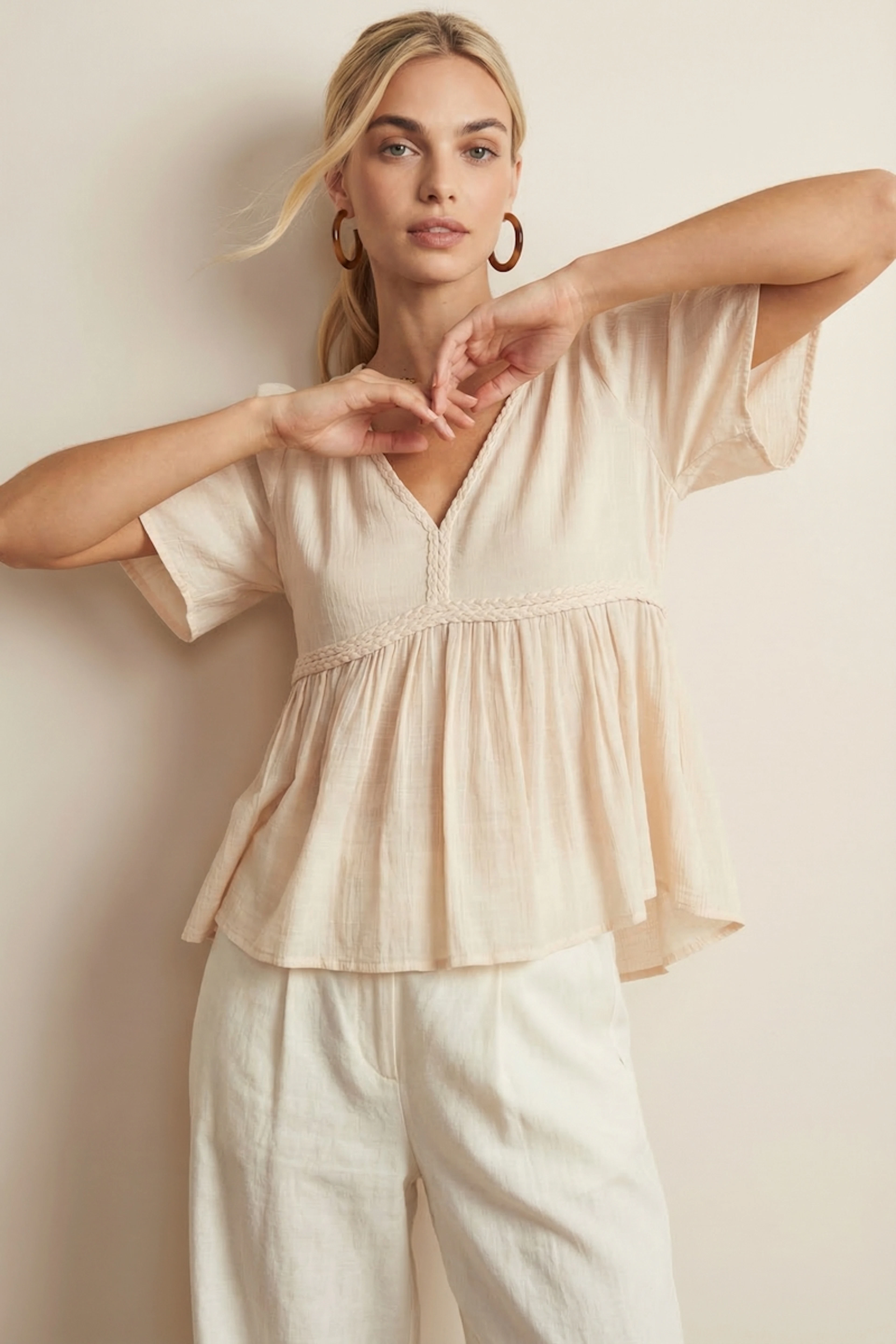 Associez-le à un jean taille haute et des sandales dorées pour une allure estivale rafraîchissante. • Top ample • Décolleté en V • Manches courtes évasées • Taille empire tressée • Ourlet volanté
