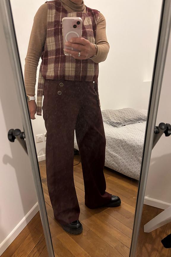 “Je l’ai porté avec un pantalon bordeau et un col roulé beige. Coloris conforme”