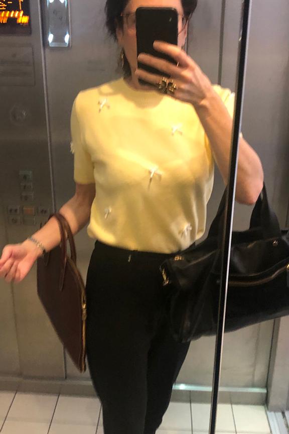 Ajoutez une jupe crayon pour un style élégant ou un jean pour un look décontracté. Idéal pour les journées d'été ensoleillées. • Haut manches courtes • Col rond classique • Coupe ajustée flatteuse • Motif nœuds délicats • Tissu léger et confortable