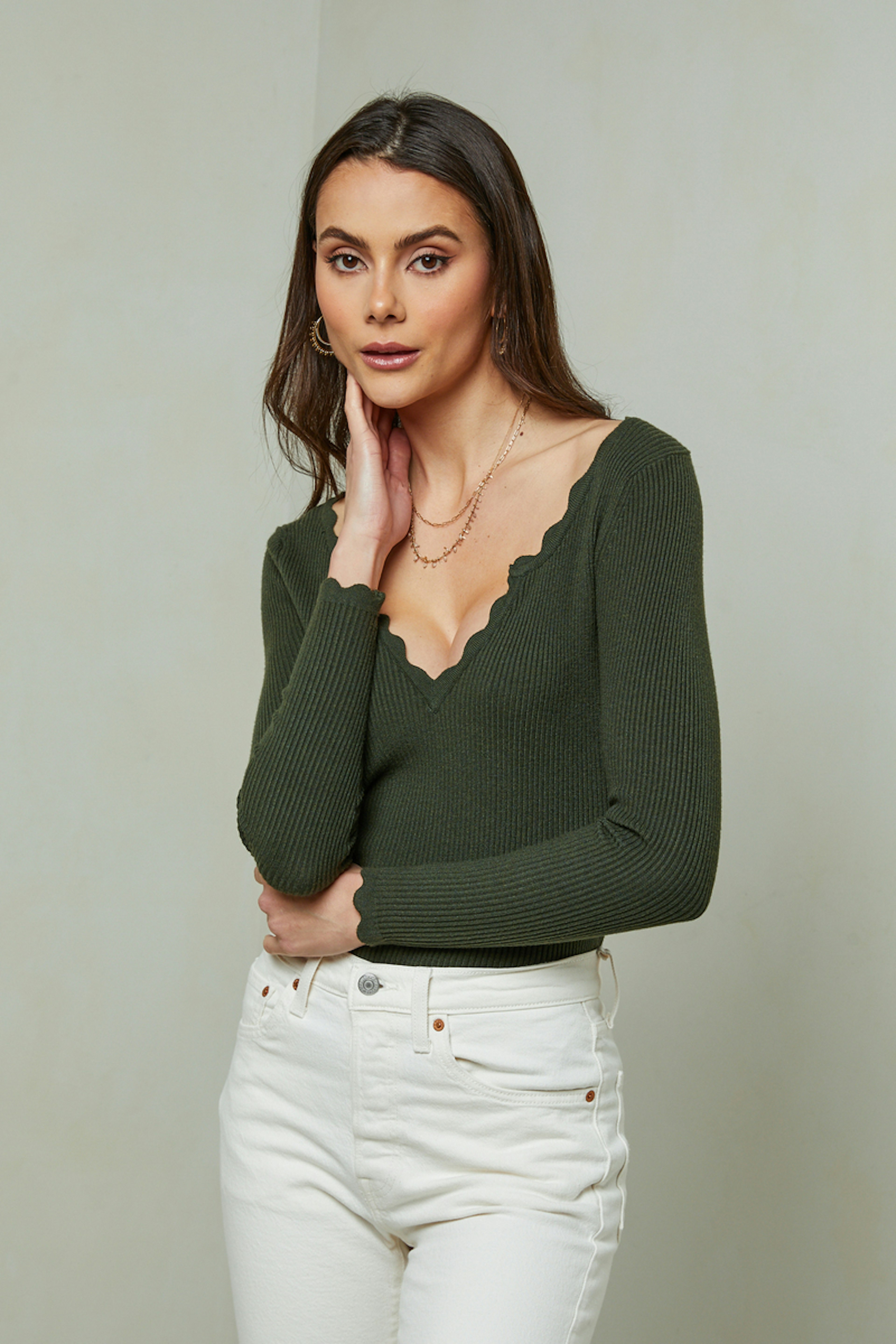 โPull a porter avec pantalon taille haute car assez court. Fait un trรจs beau dรฉcolletรฉ en portant un petit dรฉbardeur en dessous pour pas montrer toute sa poitrineโ