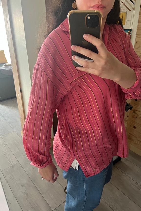 โข Blouse manches longues โข Poignets boutonnรฉs โข Col tunisien โข Poche passepoilรฉe sur poitrine โข Fentes en base โข Rayures horizontales au dos โข Rayures Fresia : des rayures en Lurex sur un fond orange dynamisant