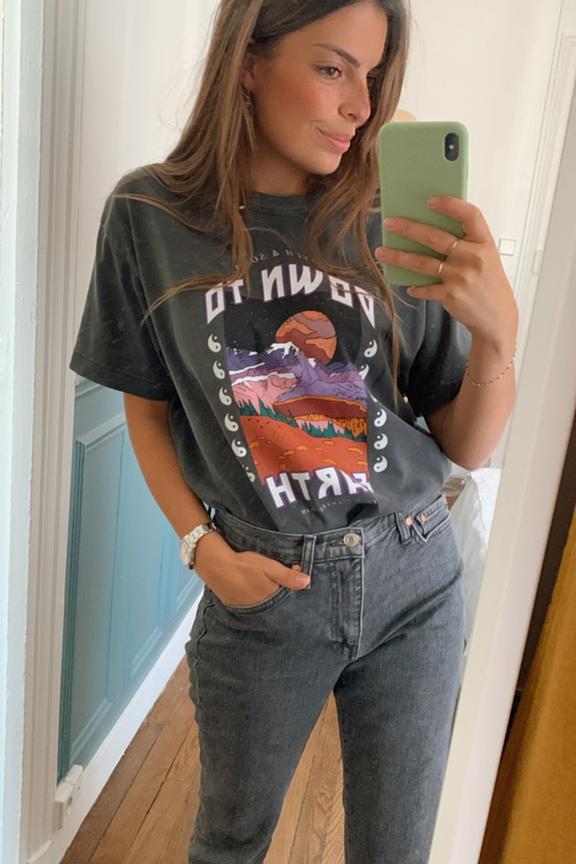 โข T-shirt ร manches courtes uni noir dรฉlavรฉ โข Coupe droite oversize โข Sรฉrigraphie "Down to earth" sur le devant โข Look vintage