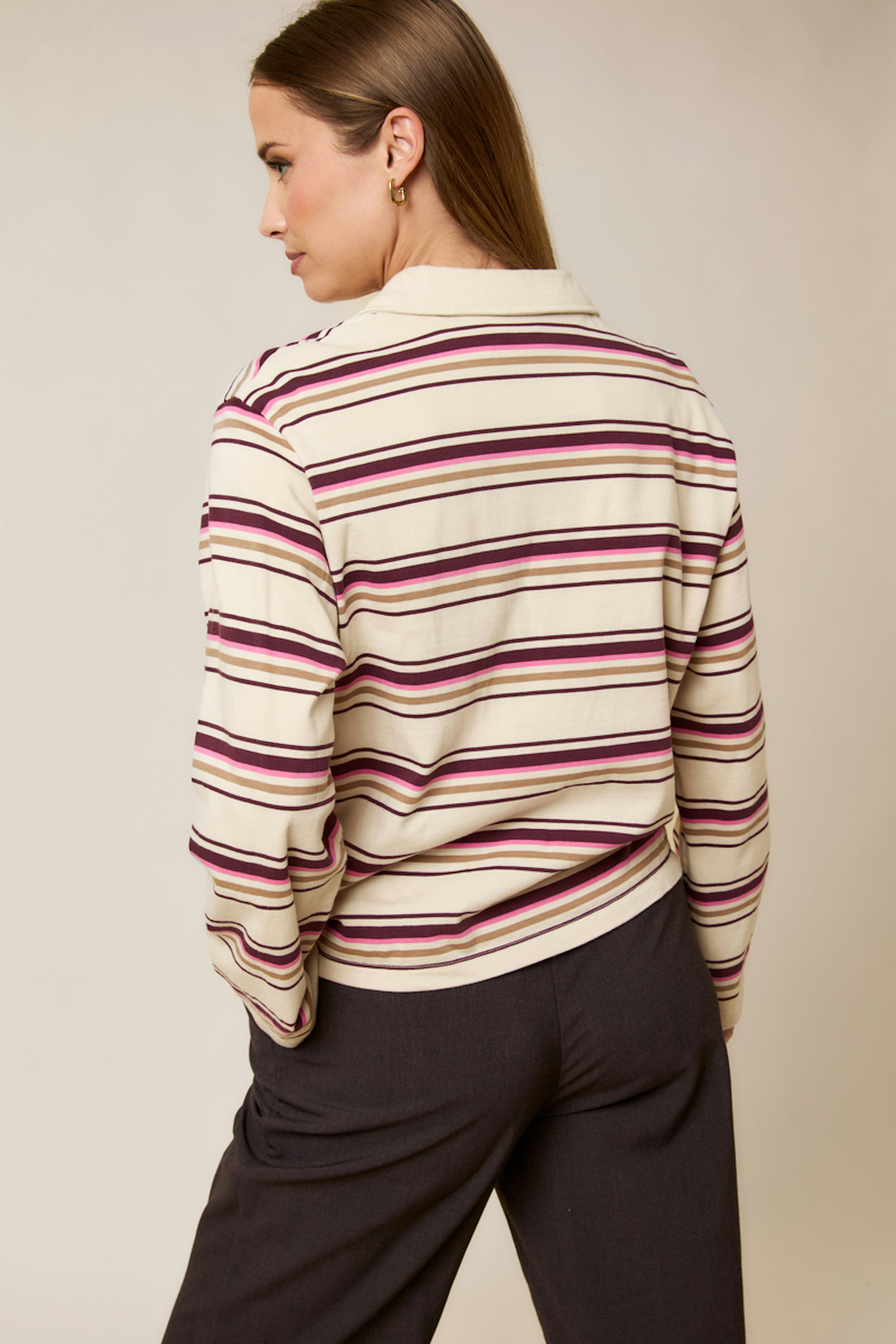 Optez pour une allure rétro en associant ce haut à des jeans évasés. Ajoutez des baskets blanches pour un look moderne et décontracté, parfait en toute saison. • Haut à rayures • Col chemise • Manches longues • Coupe ample • Boutons contrastés