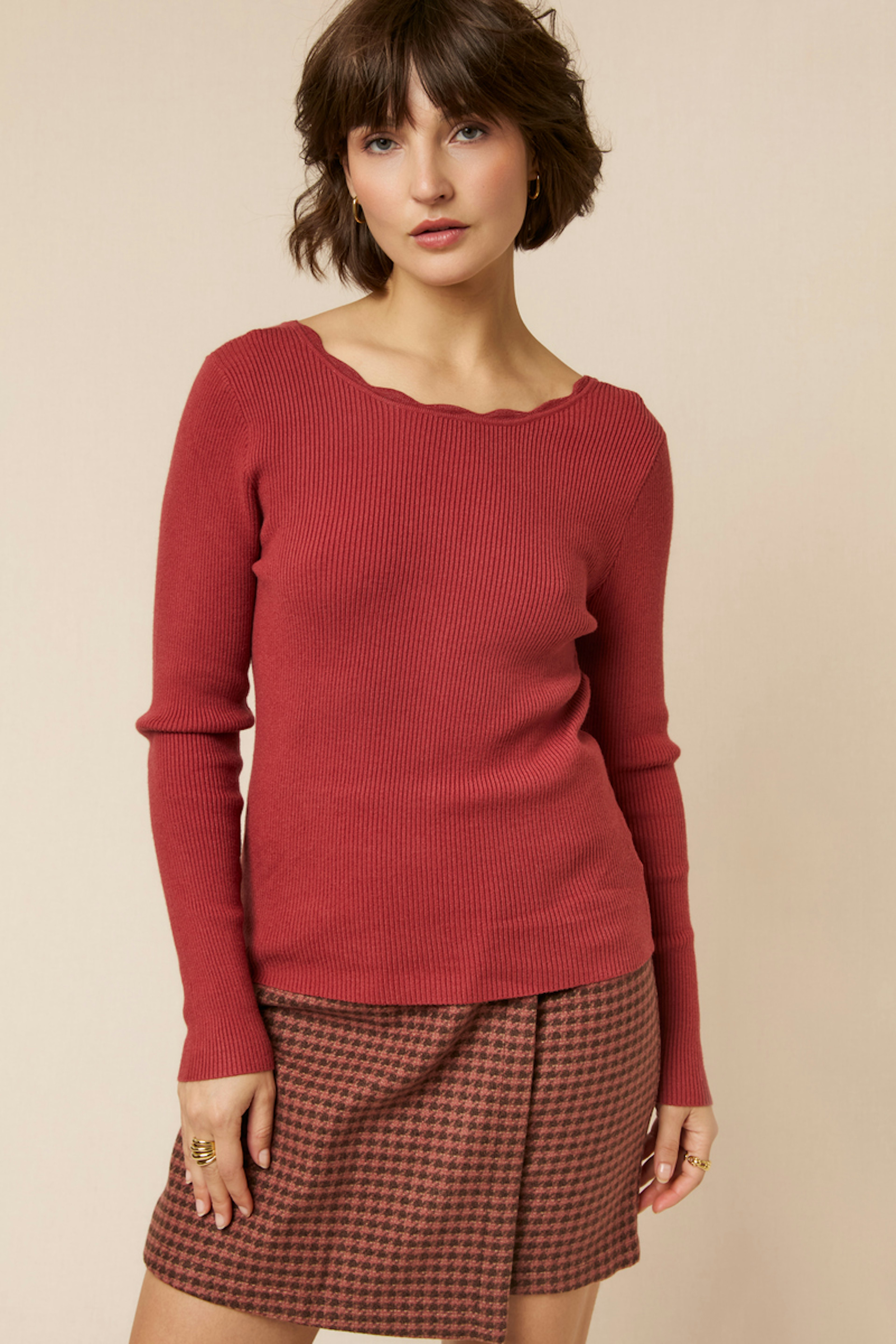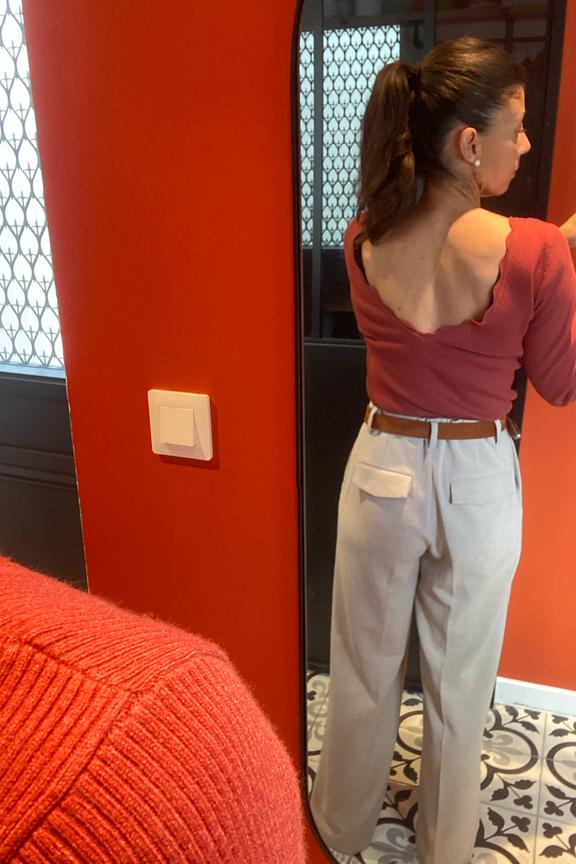 Associez ce haut élégant à une jupe en cuir pour une allure chic d'hiver. • Pull dos nu • Manches longues • Échancrure dos • Coupe près du corps • Finitions festonnées