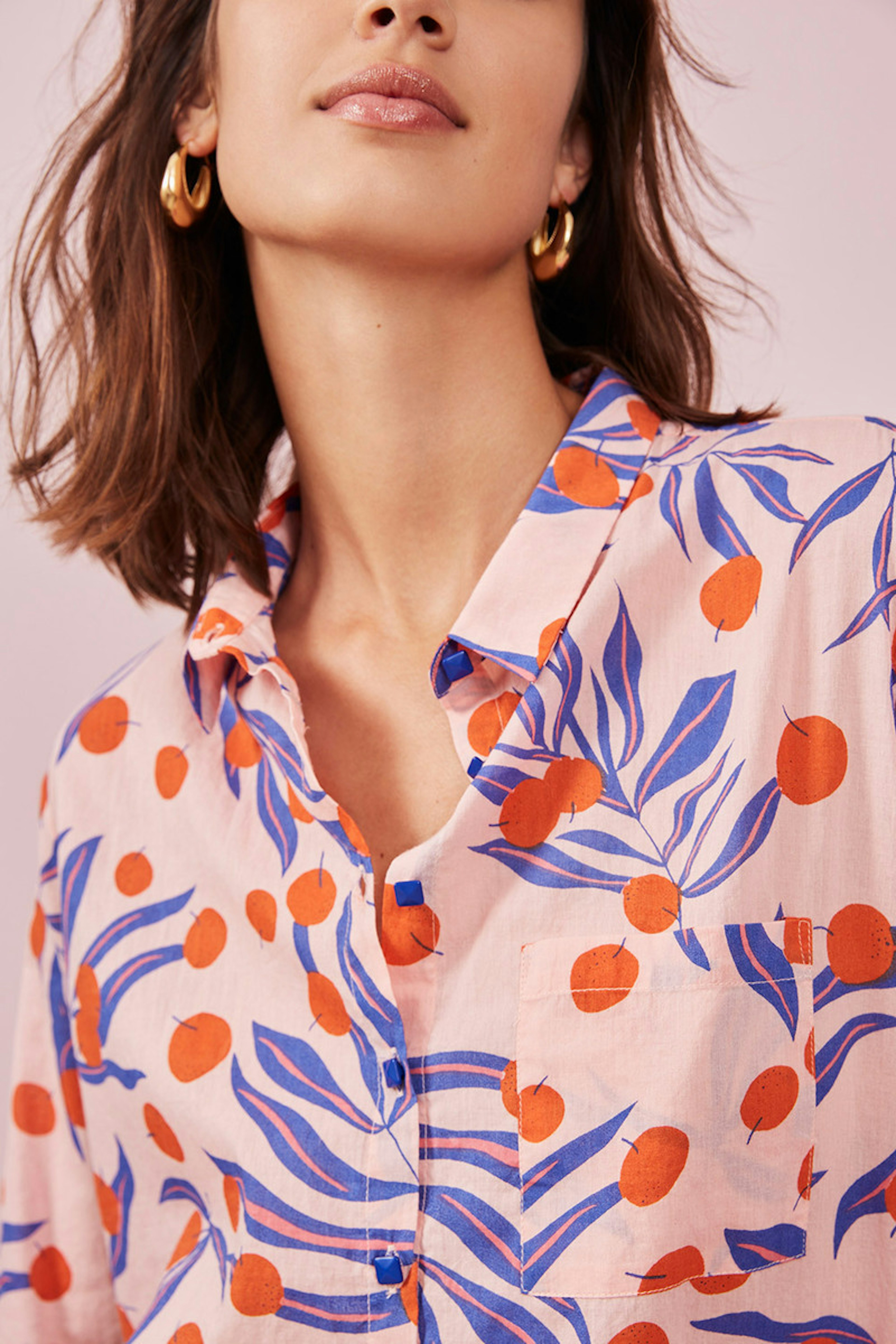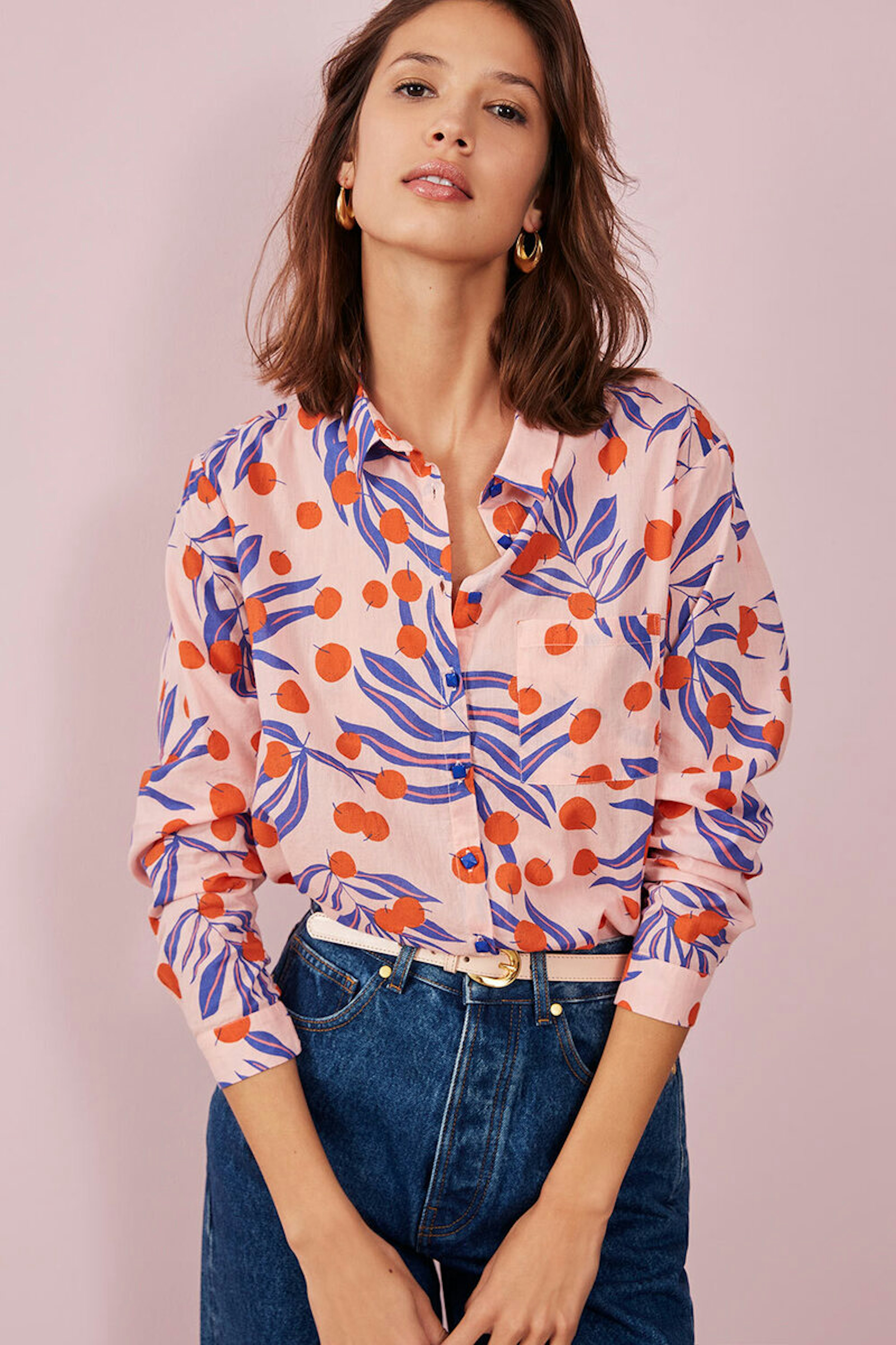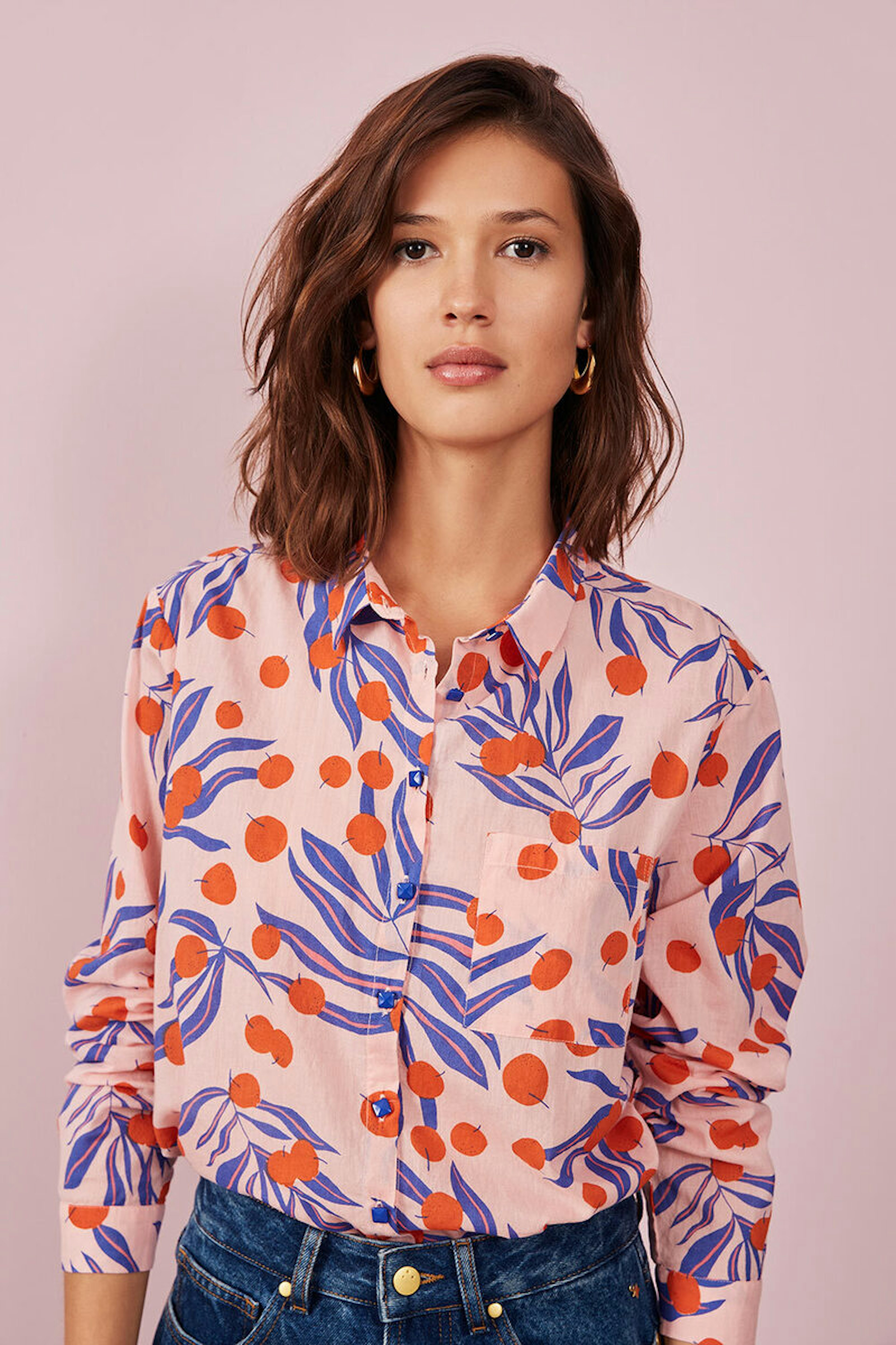โข Chemise manches longues rose clair imprimรฉe kumquats โข Empiรจcement รฉpaules devant et dos โข Poche poitrine โข Poignet boutonnรฉ