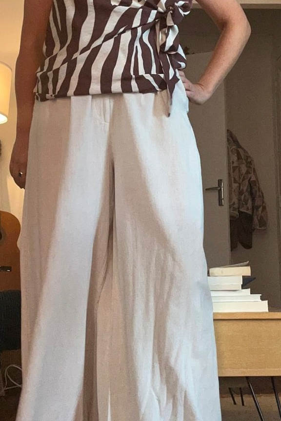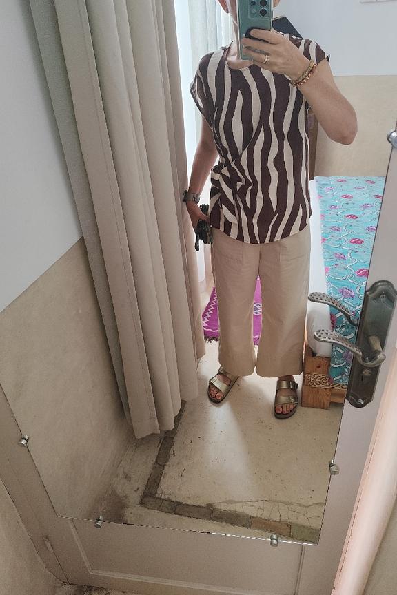 Associez ce haut à motif avec un pantalon beige fluide et des sandales pour un look estival chic et décontracté. • Haut asymétrique • Coupe ajustée • Manches courtes • Nœud sur le côté • Motif imprimé
