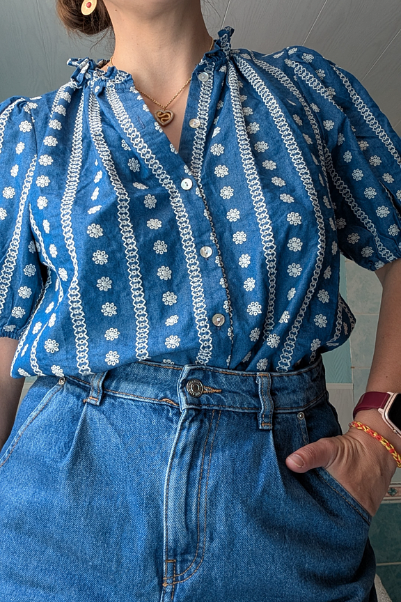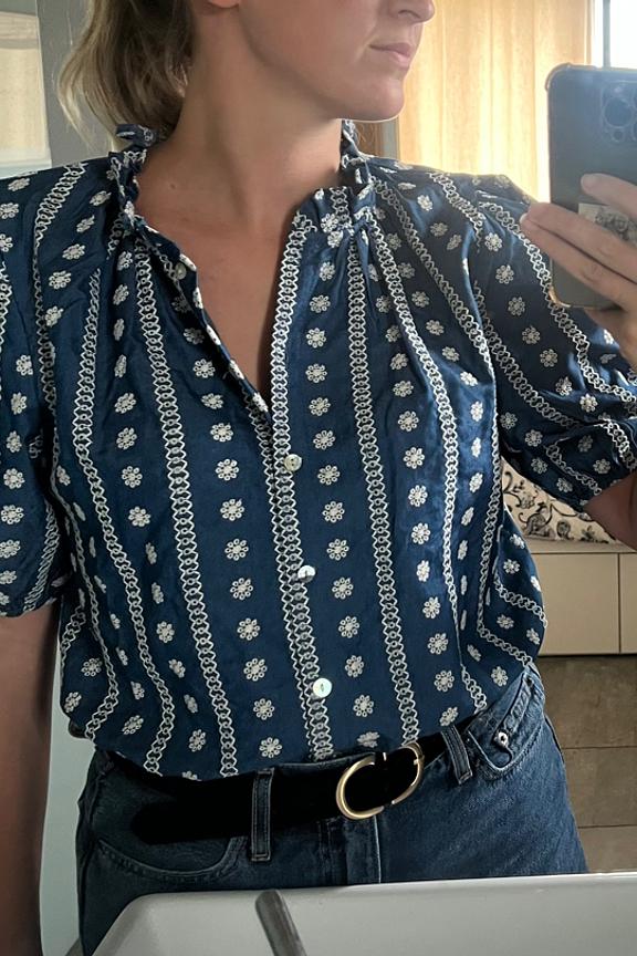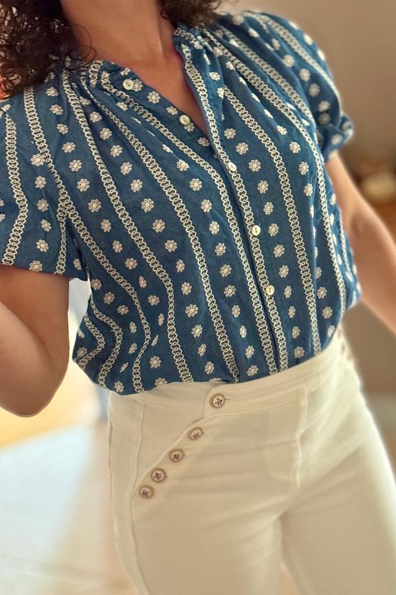Optez pour un look bohème en associant ce haut à des sandales en cuir et un jean blanc. Idéal pour un pique-nique estival. • Chemise en coton • Manches courtes bouffantes • Col Mao structuré • Fermeture boutonnée • Motif fleuri et rayures