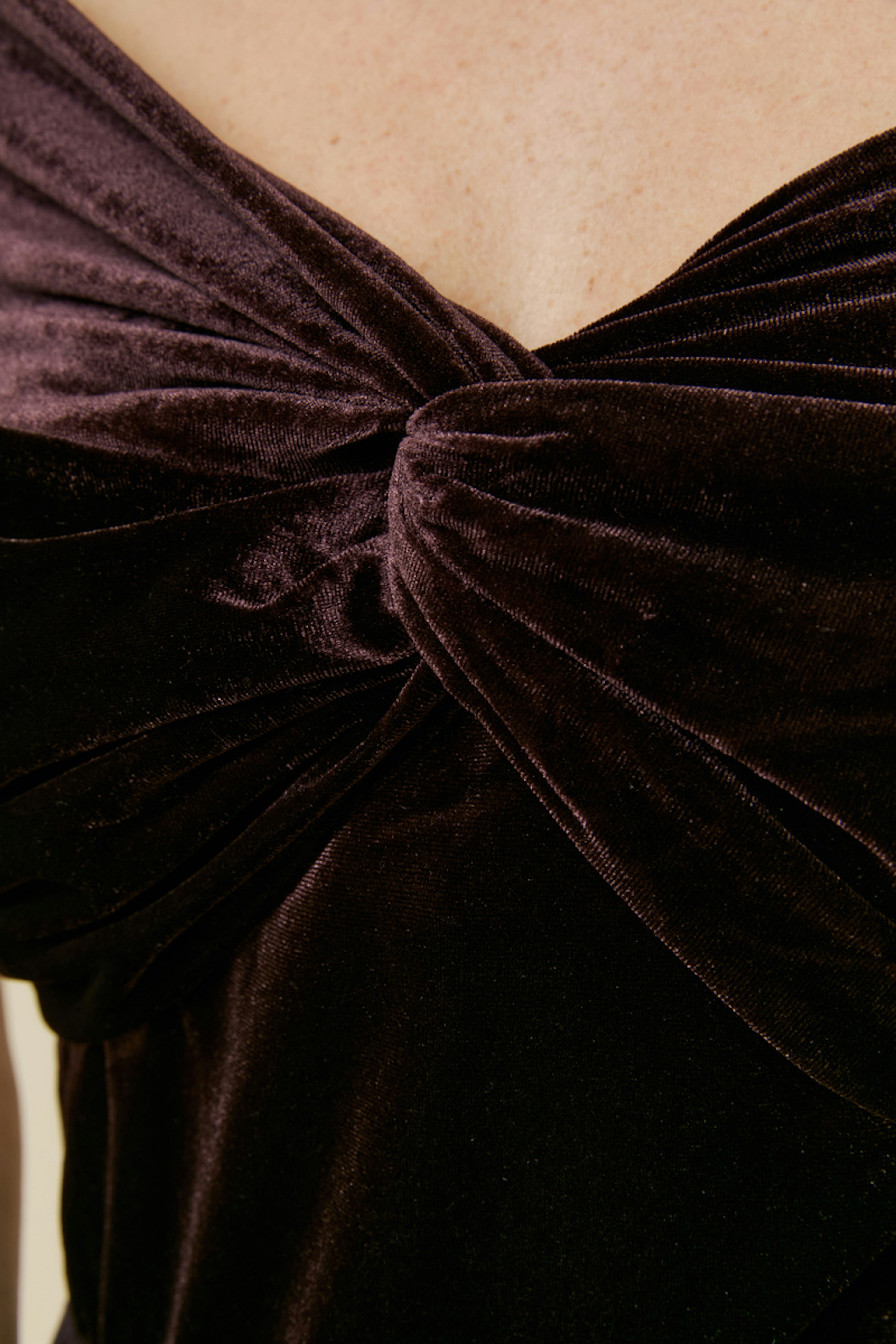 Associez ce haut avec un pantalon taille haute et des bottines pour un look chic hivernal. • Haut en velours • Encolure bardot élégante • Manches courtes • Plissé croisé à la poitrine • Tissu doux et stretch