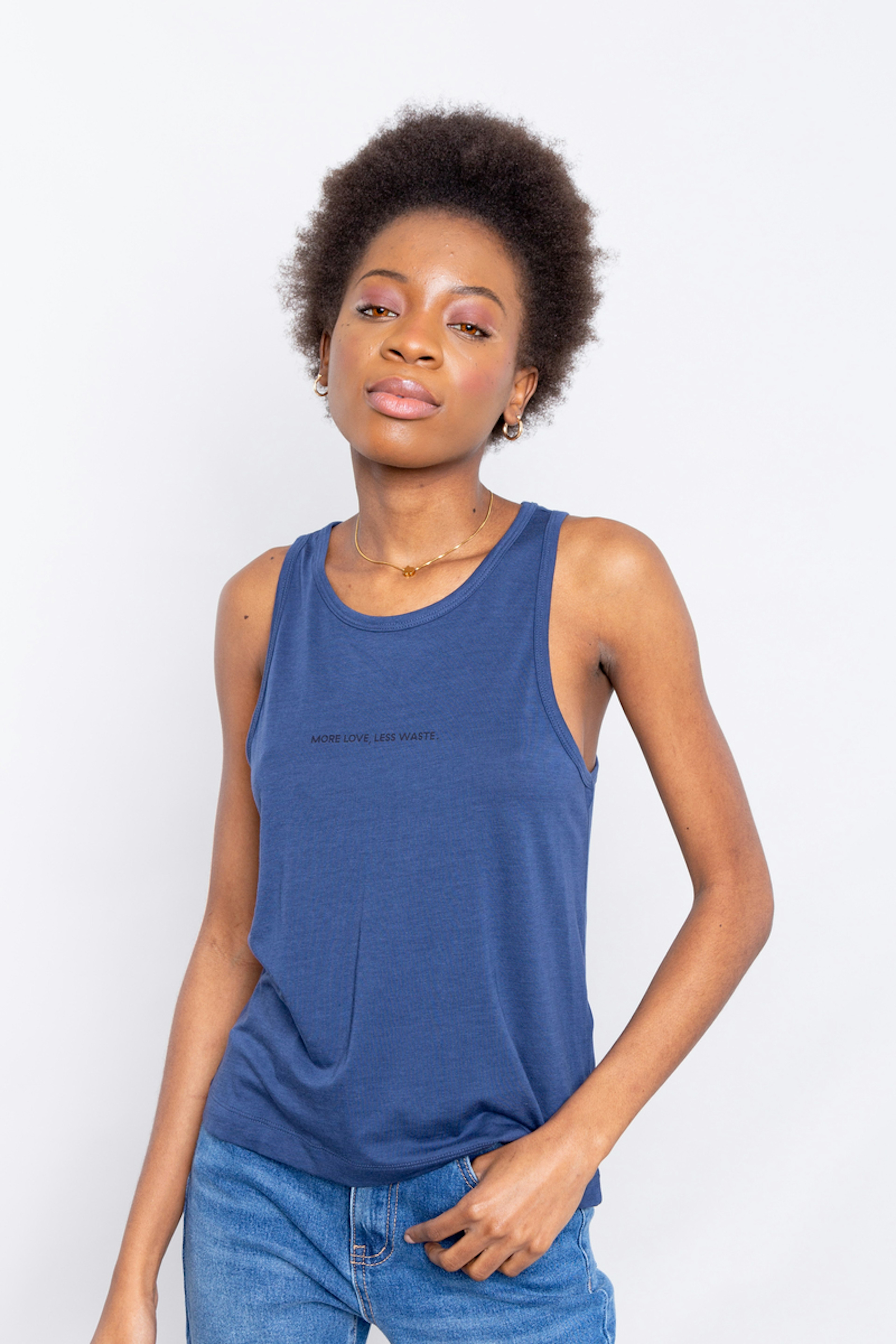โข Dรฉbardeur bleu indigo โข Sรฉrigraphiรฉ "More love, less waste" en petit sur le devant โข Col rond โข Fabriquรฉ dans un tissu en coton biologique et en coton recyclรฉ