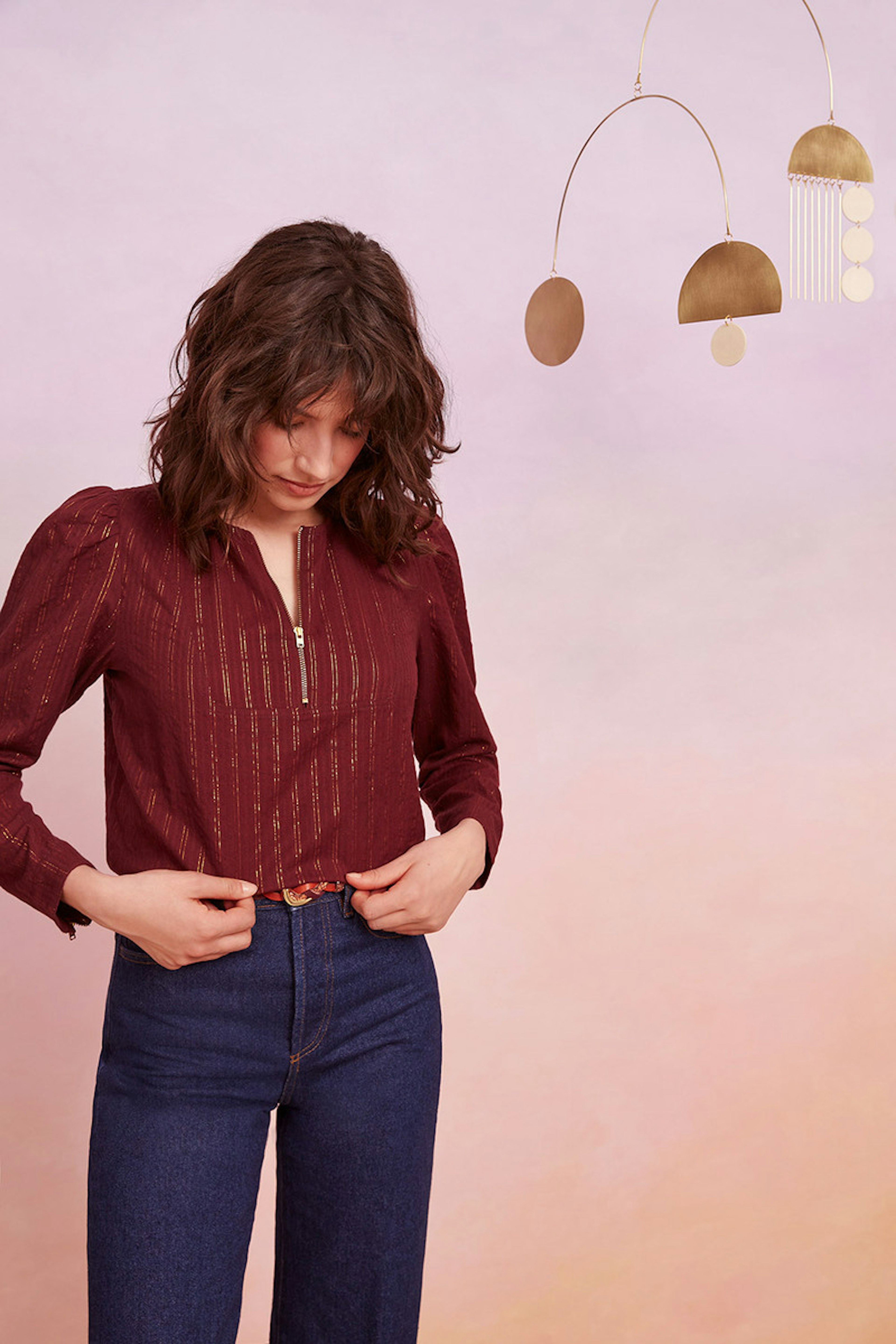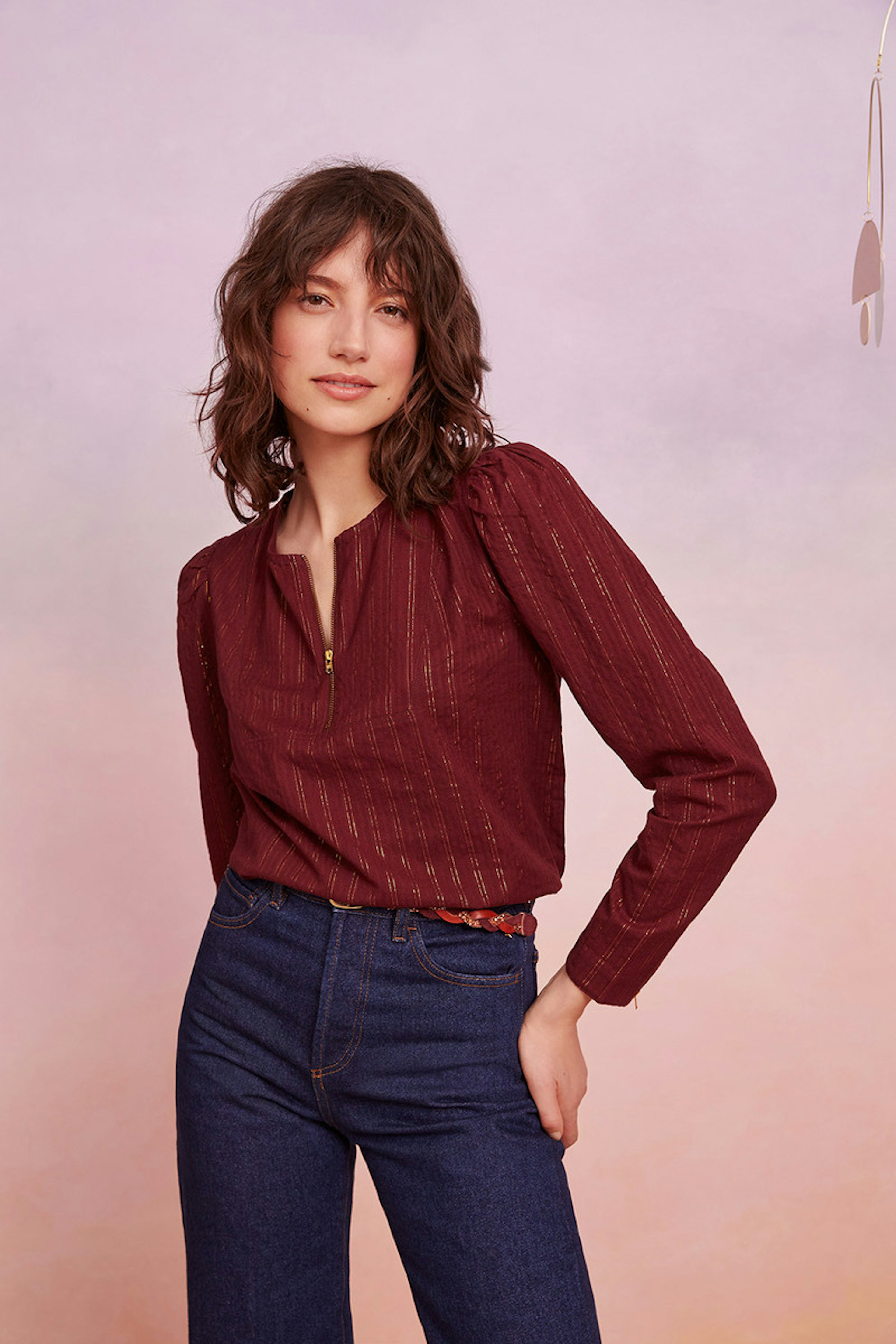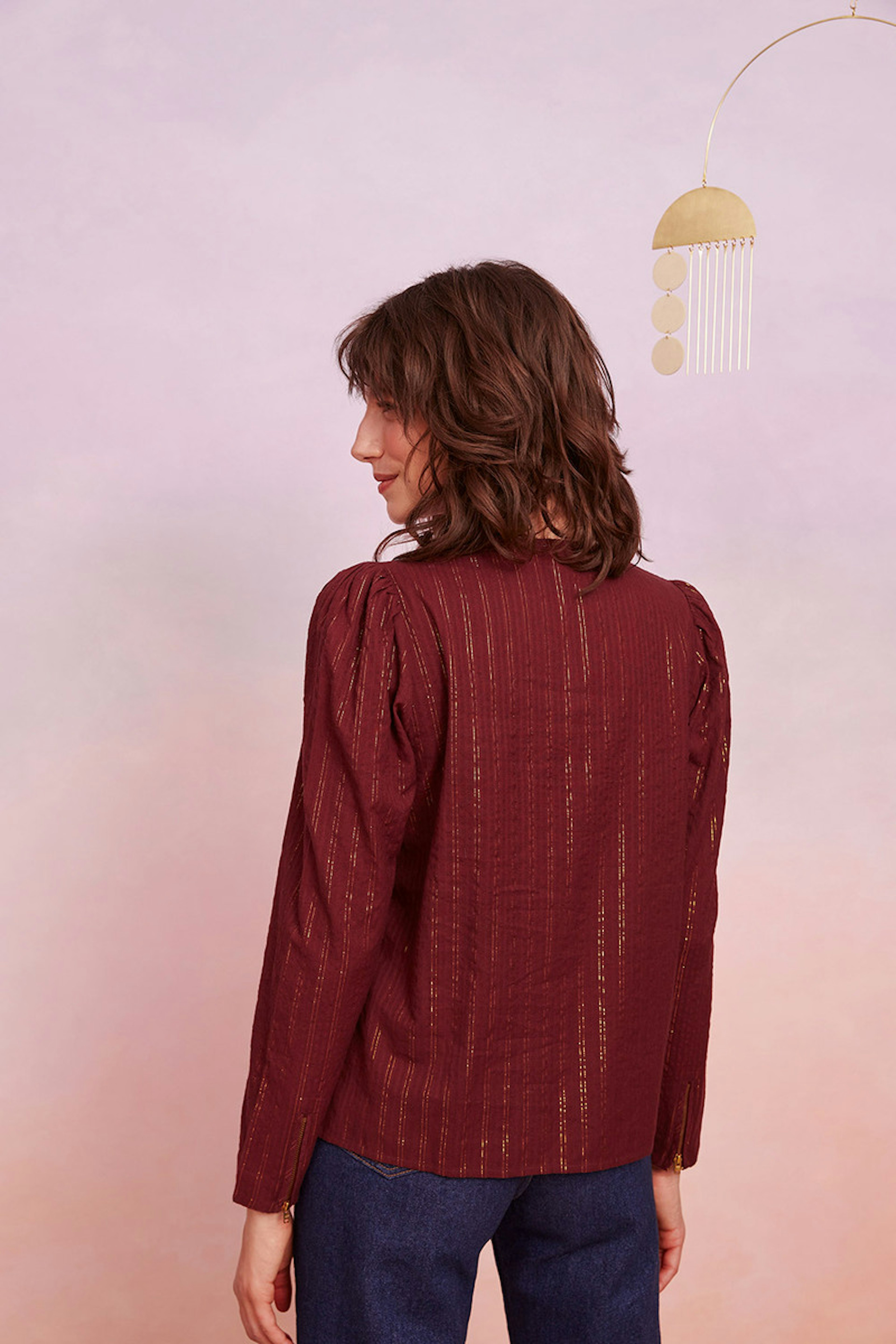 โข Petite blouse couleur prune avec dรฉtails dorรฉs โข Manches longues marquรฉes par de petites รฉpaulettes โข Col rond avec ouverture zippรฉe โข Fermeture zippรฉe sur les poignets