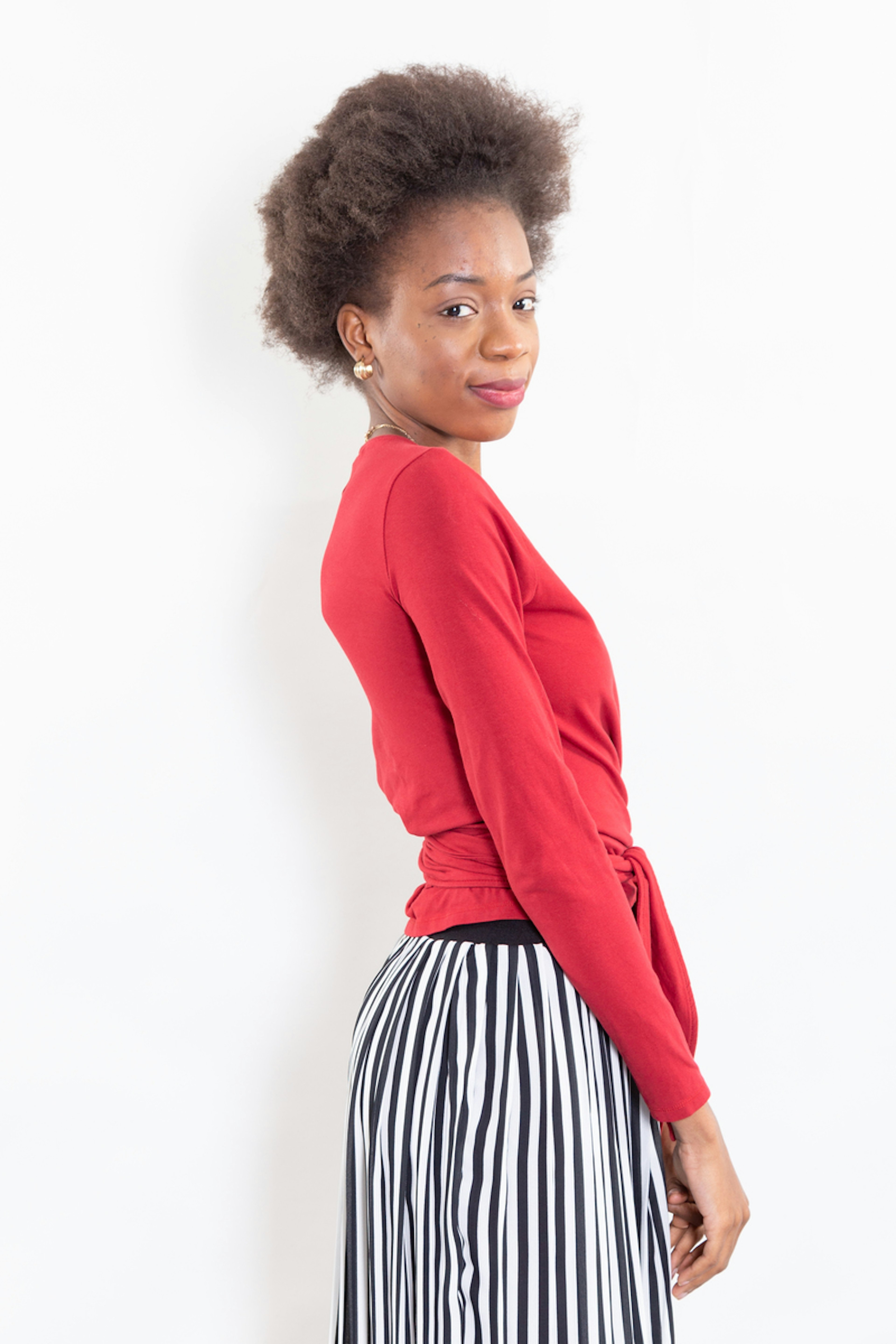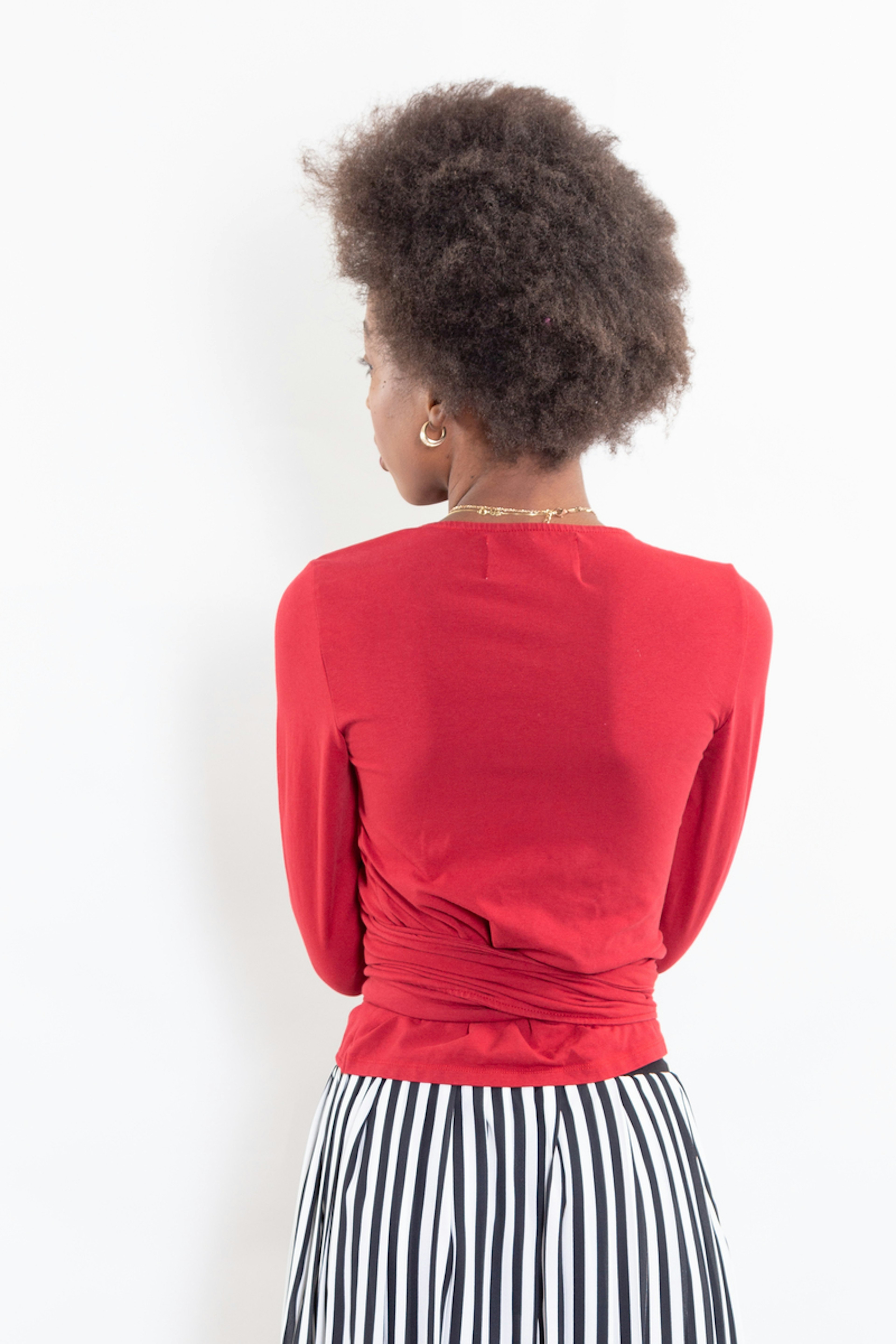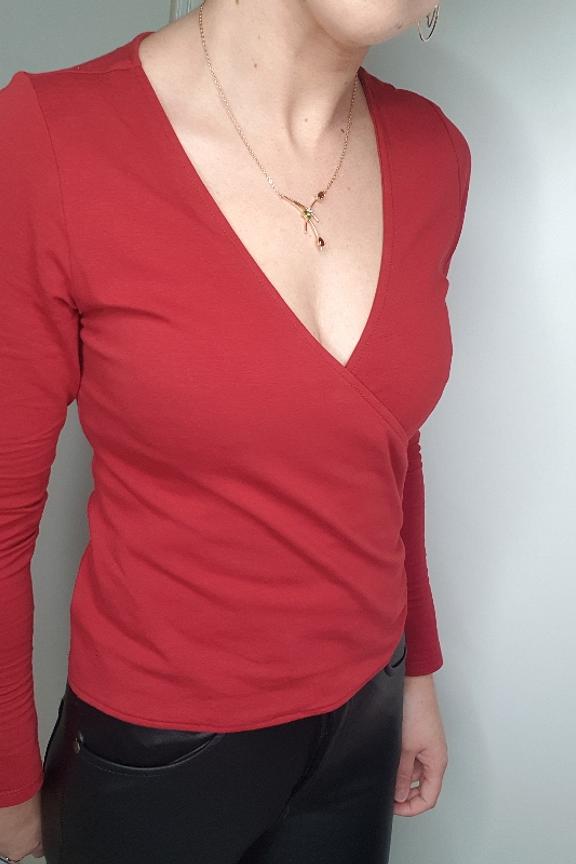 โข Top cache-cลur manches bien longues โข Encolure V โข Croisure devant se terminant par 2 longues bandes ร nouer ร la taille.