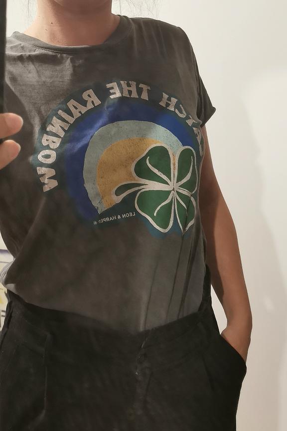 โข T-shirts noir ร l'esprit vintage de la femme Leon & Harper avec son trรจfle ร 4 feuilles printรฉ โข Manches courtes โข Col rond โข Coupe droite โข Print craquelรฉ โข Composรฉ ร 100% de coton biologique