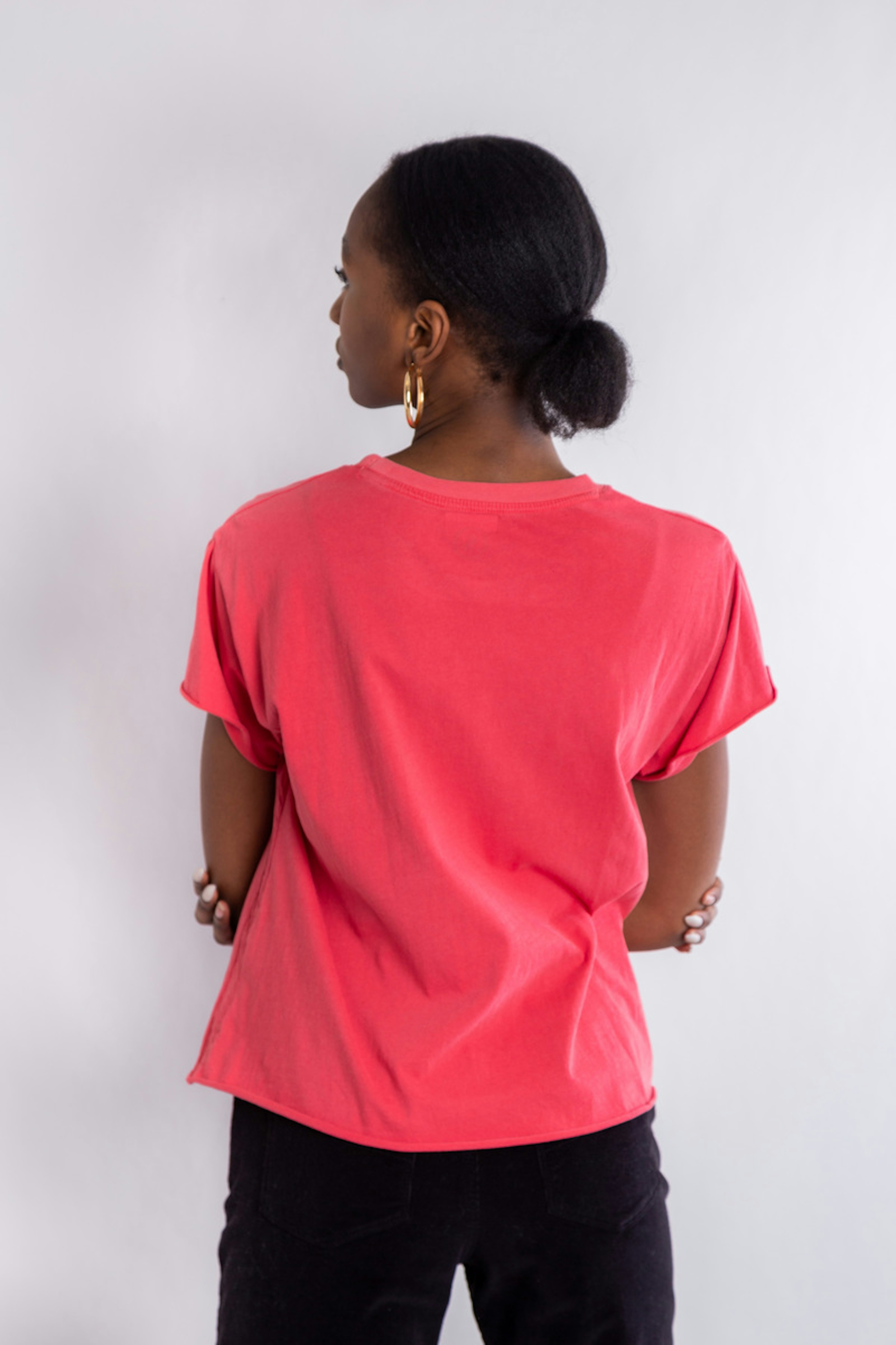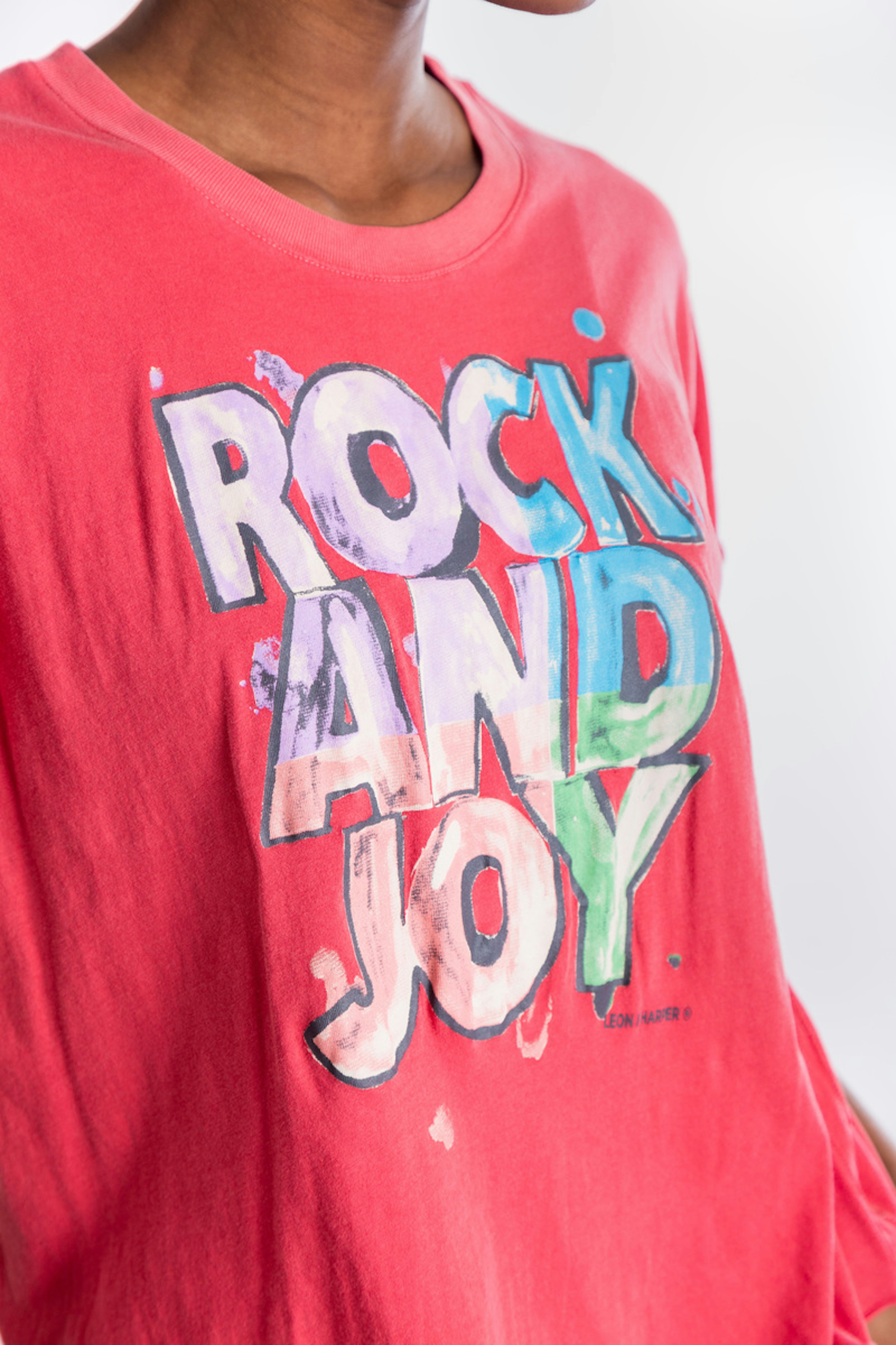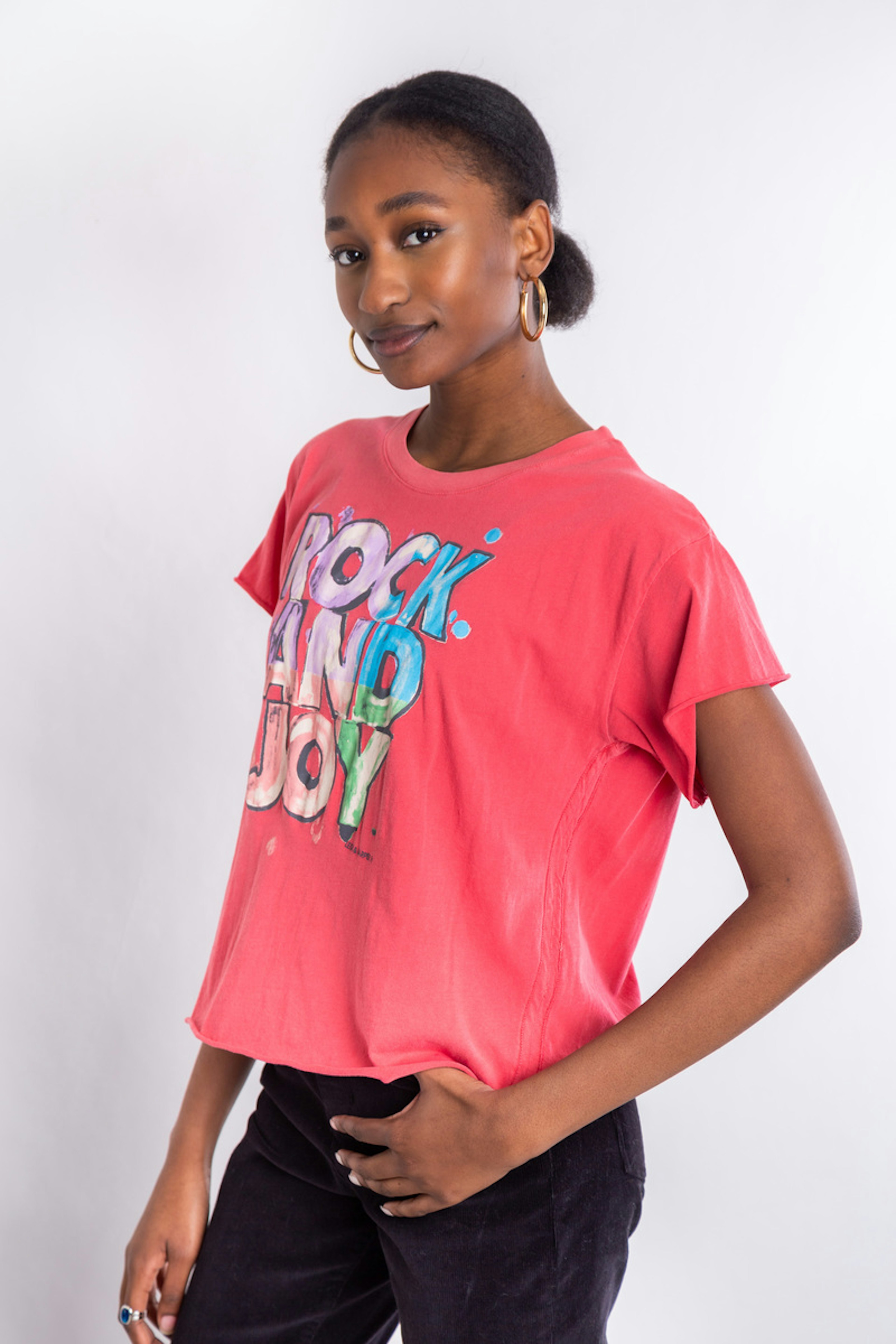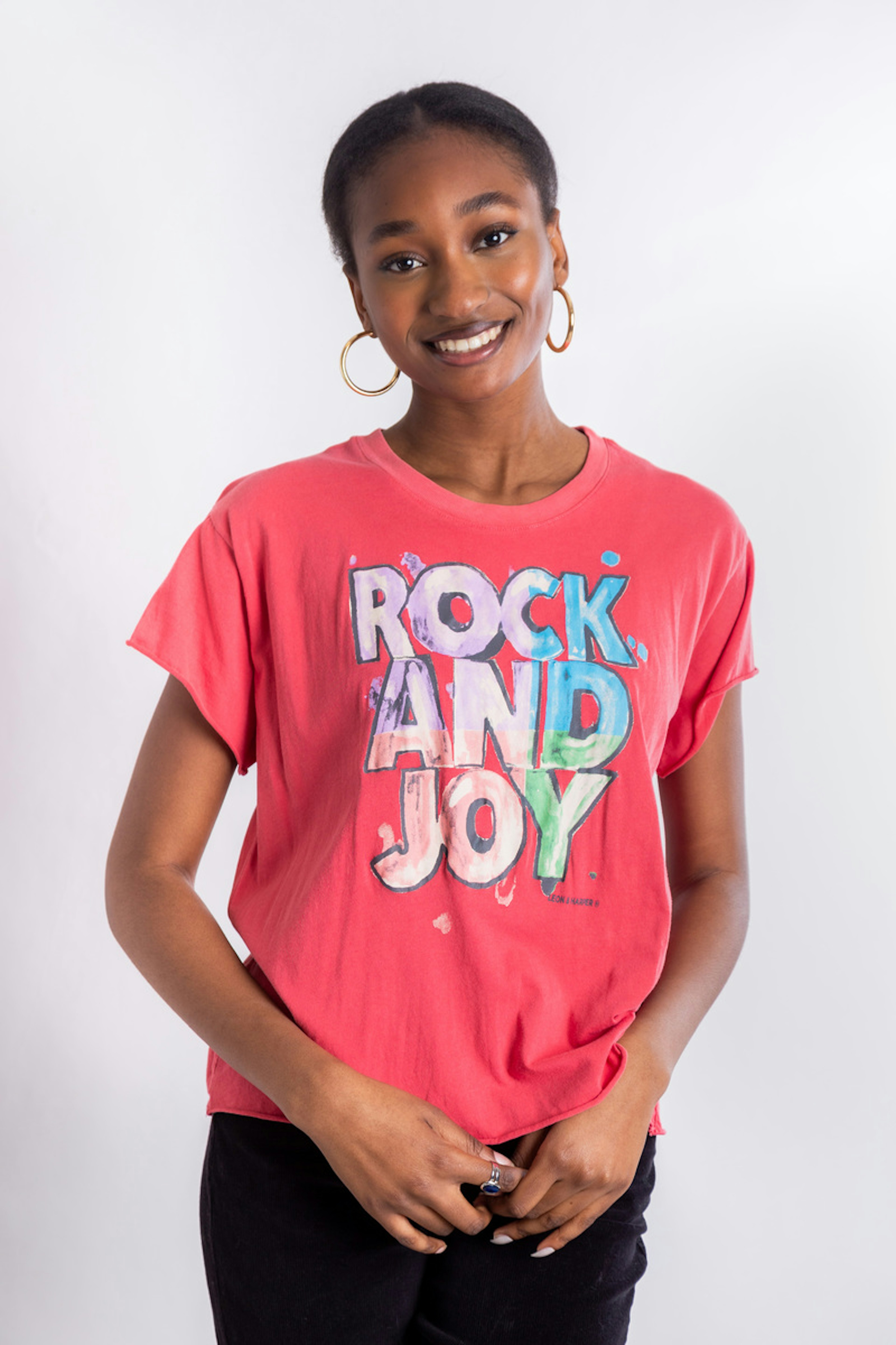 โข T-shirt manches courtes rouge โข Col rond โข Print "Rock and Joy" โข Coupe lรฉgรจrement oversize โข Composรฉ ร 100% de coton biologique