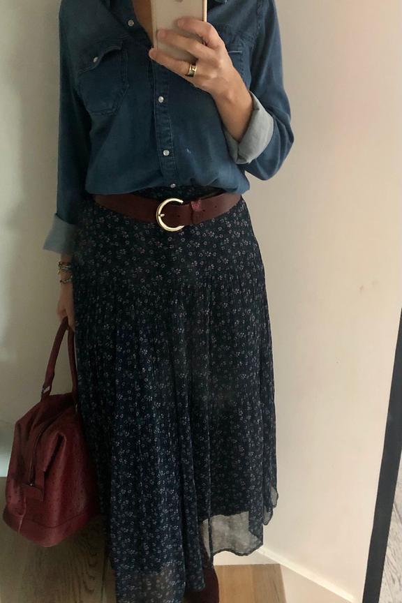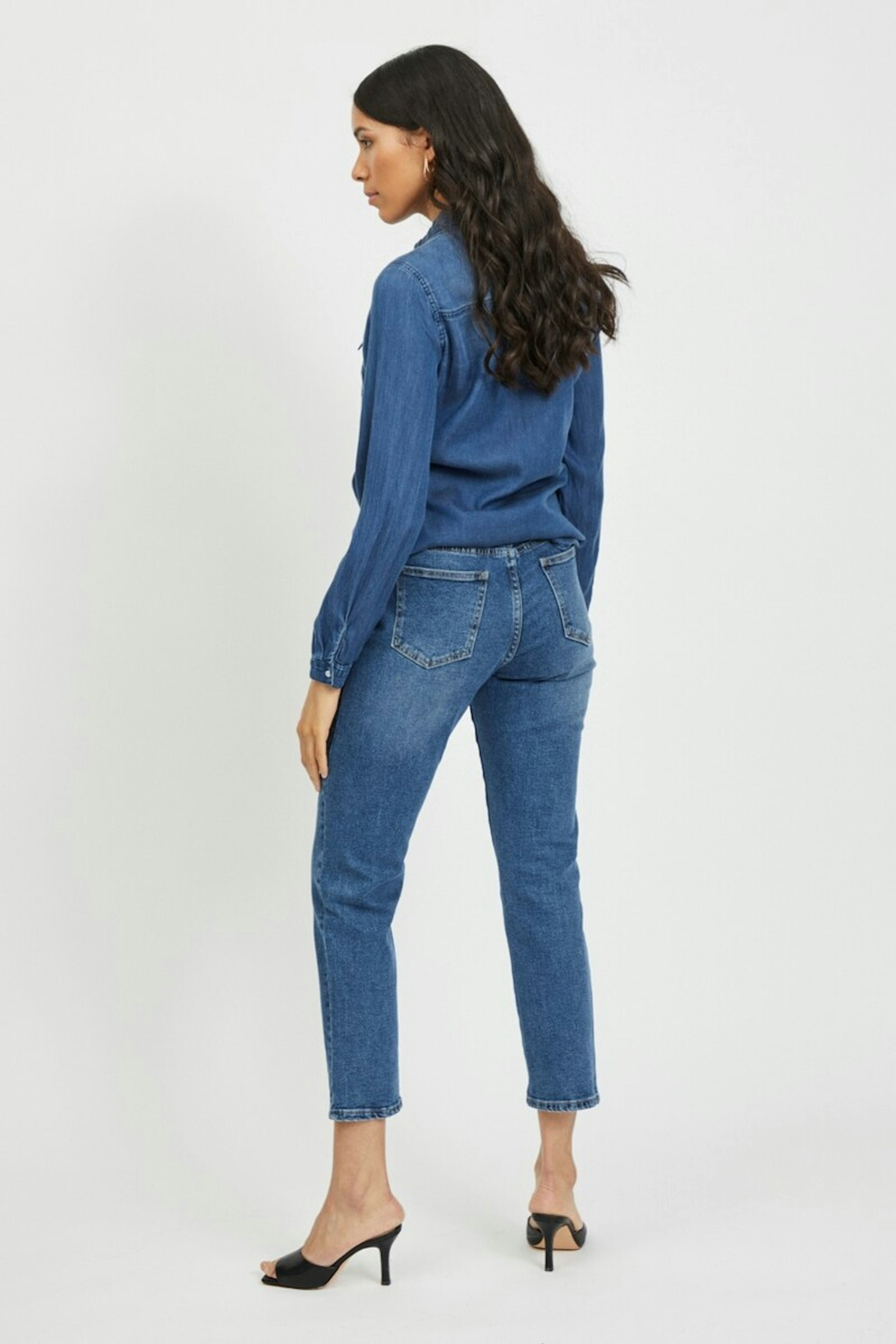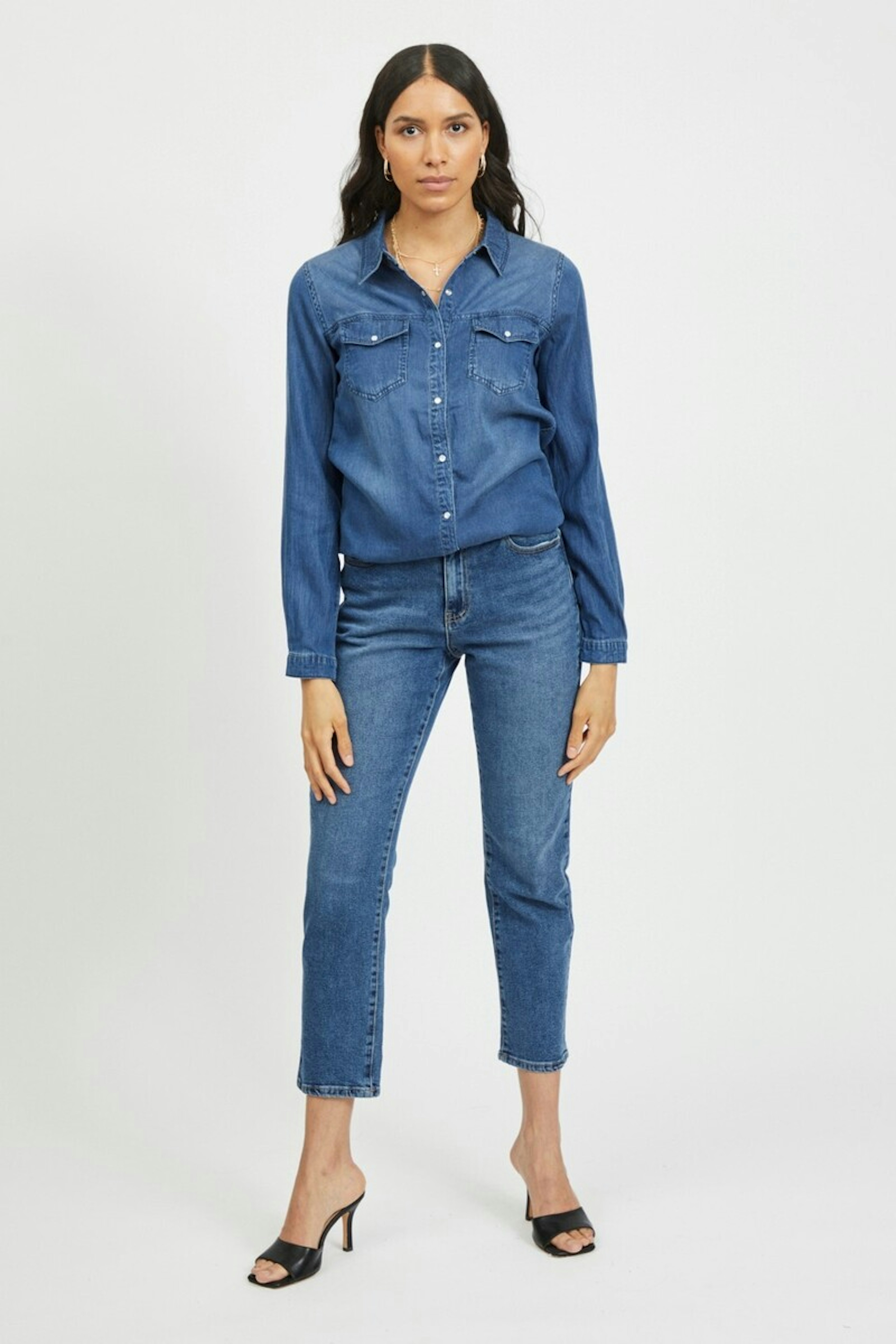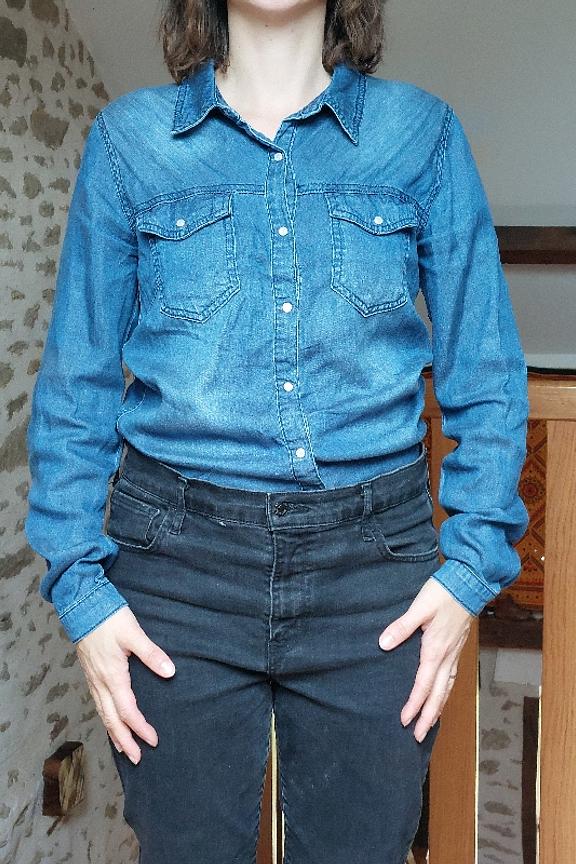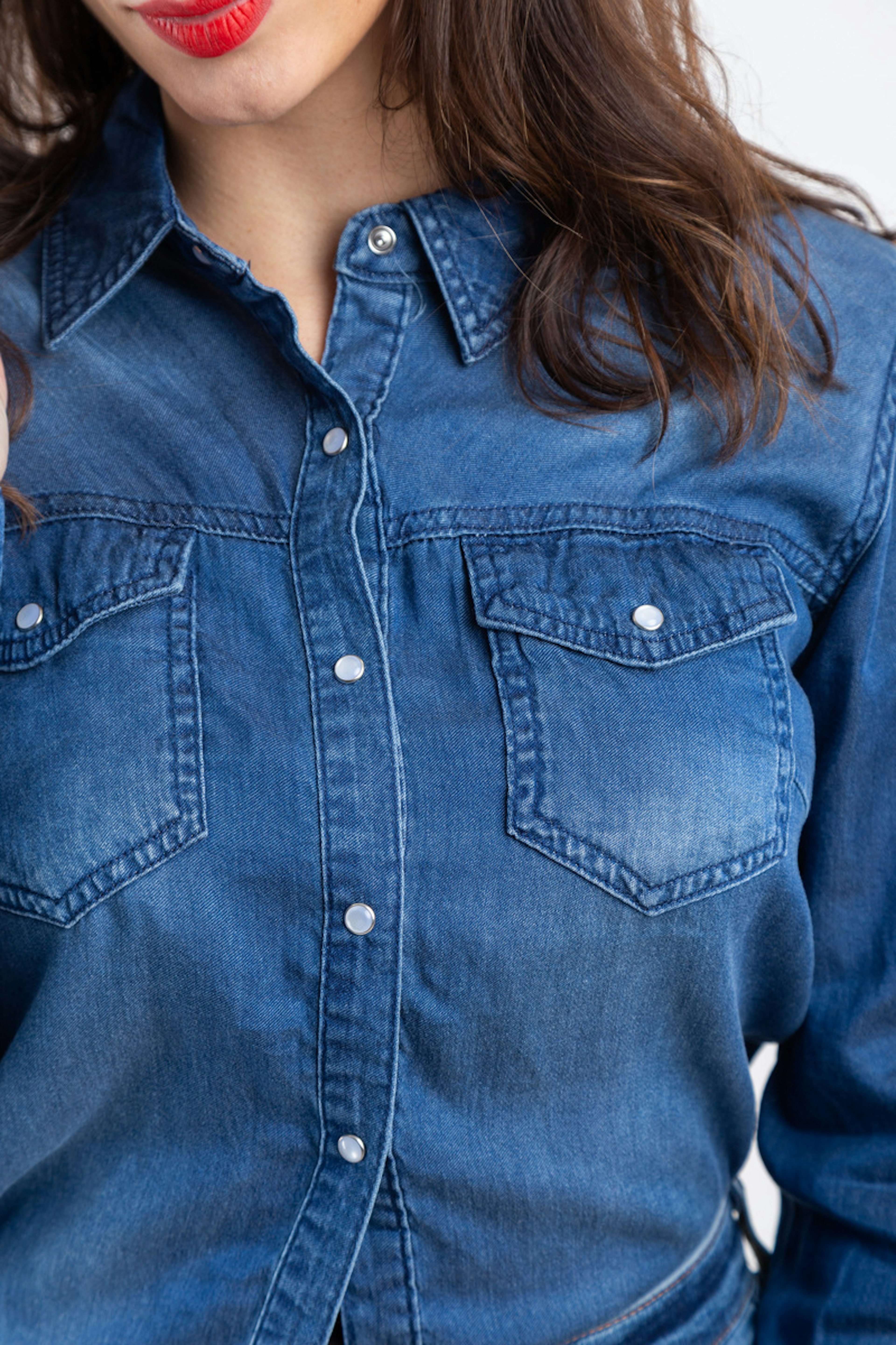 โข Chemisier denim โข Boutons pression โข Poches sur la poitrine โข Manches longues avec bouton en bas