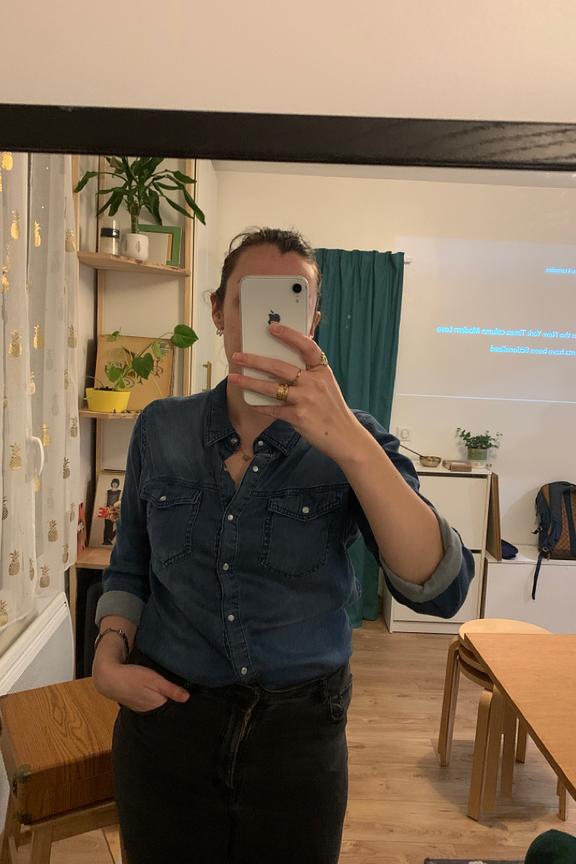 โข Chemisier denim โข Boutons pression โข Poches sur la poitrine โข Manches longues avec bouton en bas