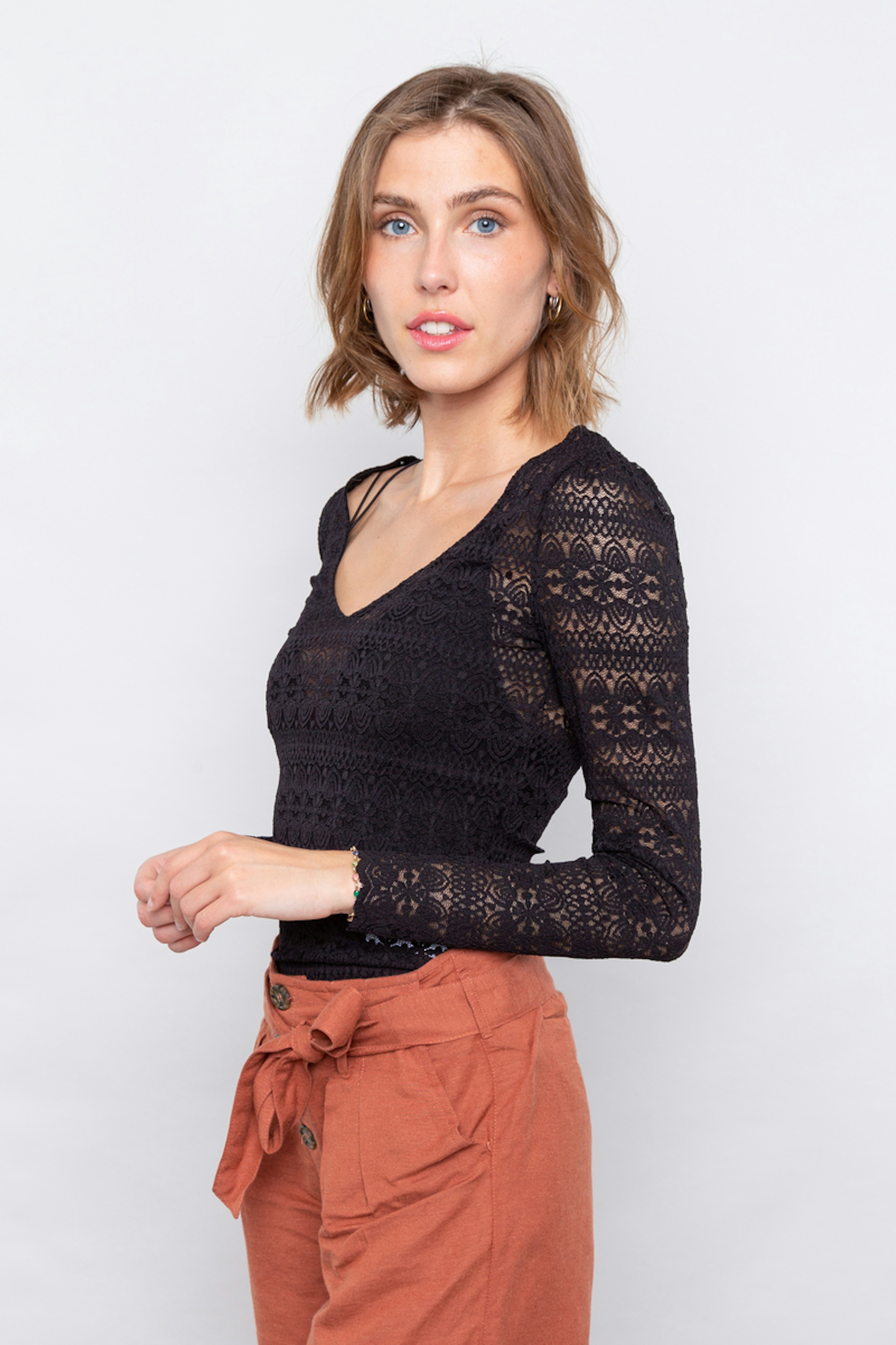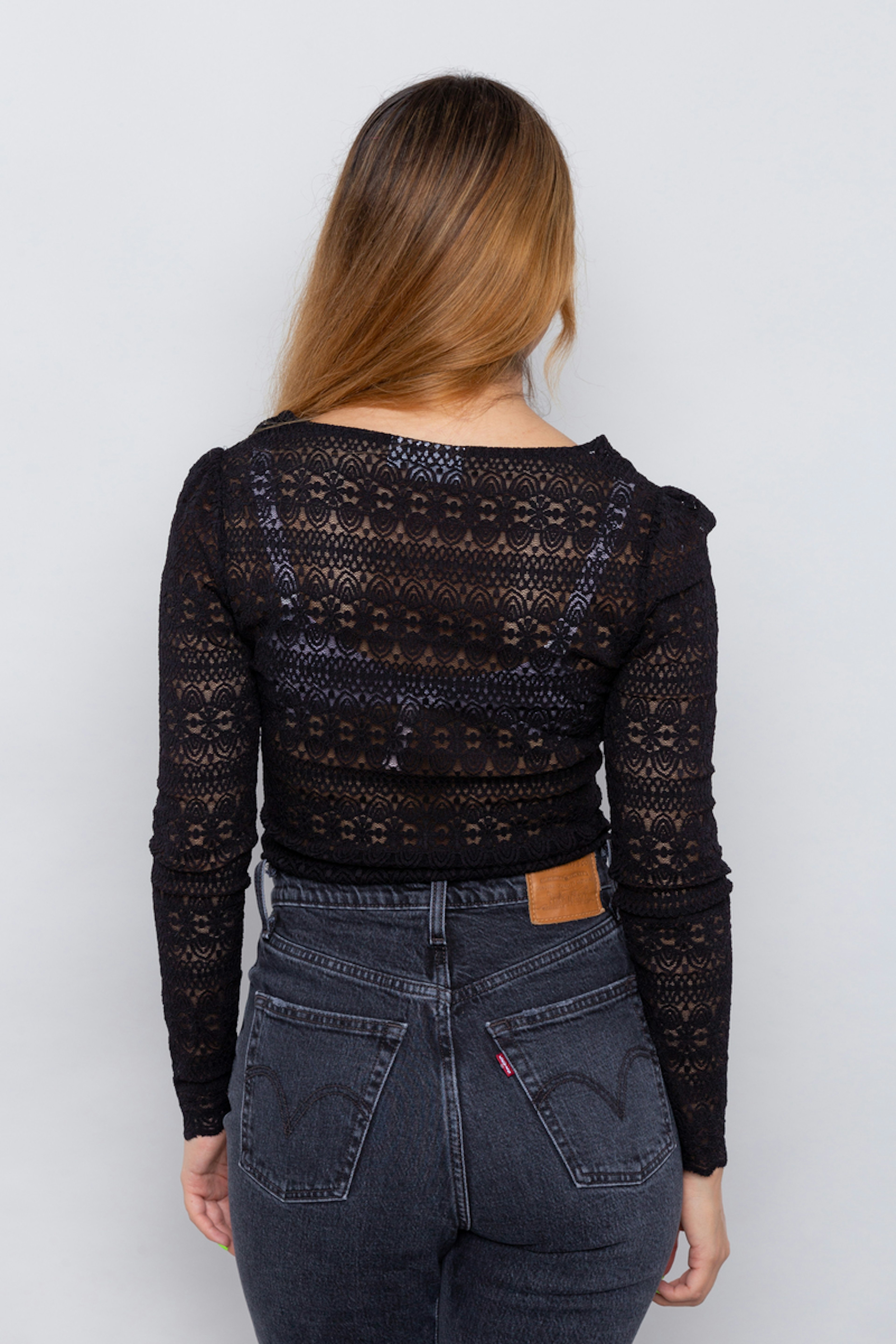 โข Haut noir รฉlรฉgant en dentelle โข Encolure en V โข Se porte prรจs du corps โข Transparent, il se porte avec un soutien-gorge, une brassiรจre ou un dรฉbardeur en-dessous
