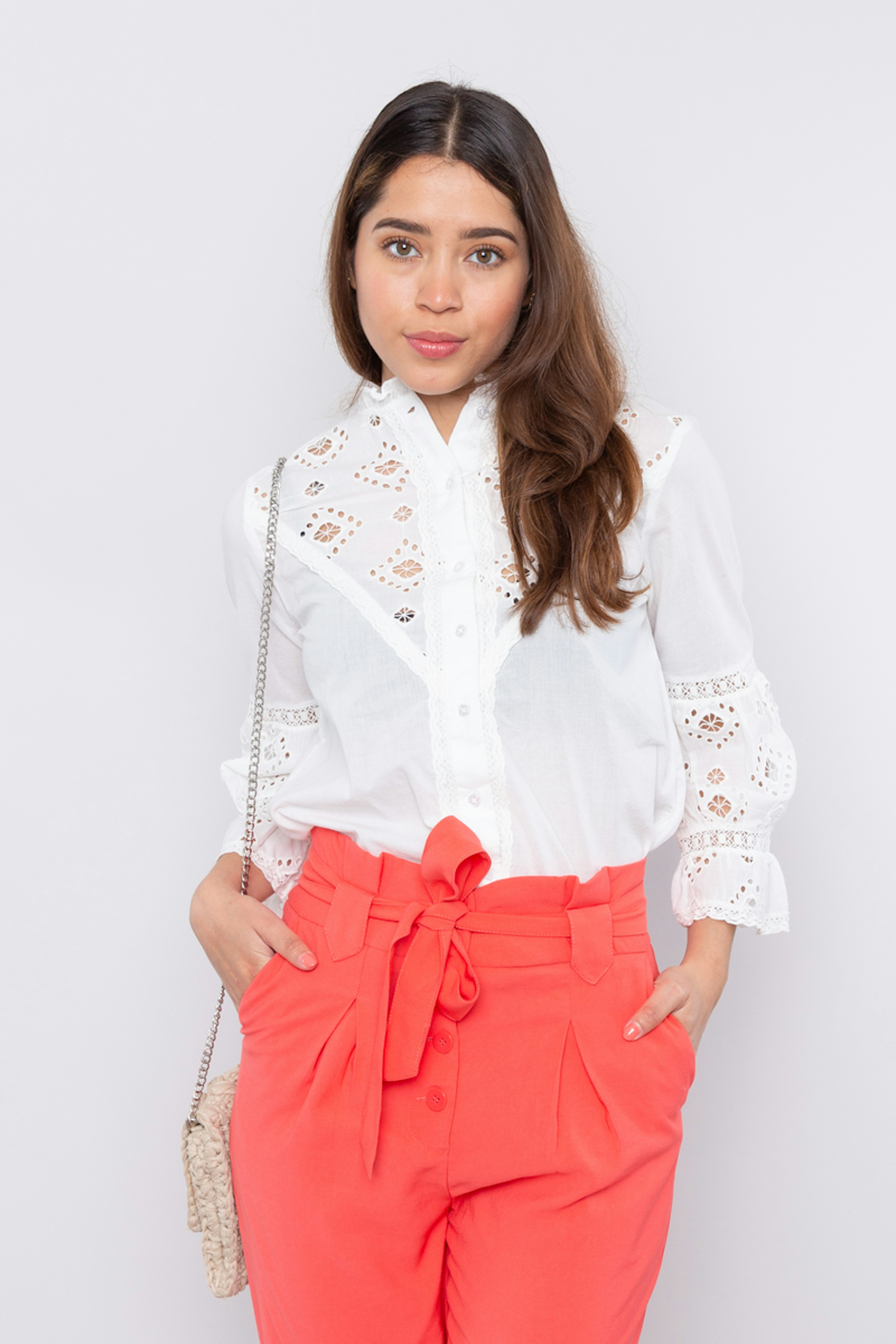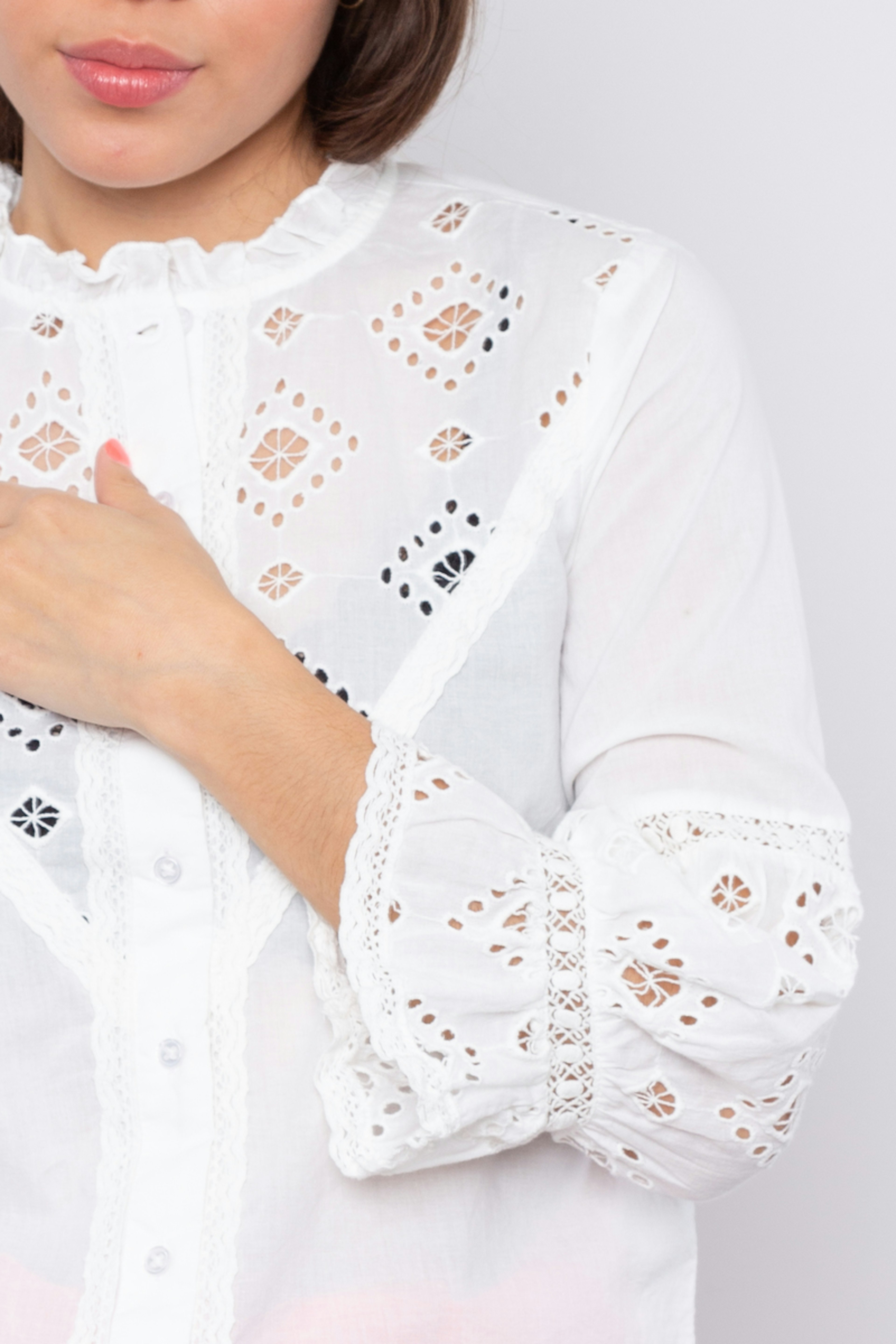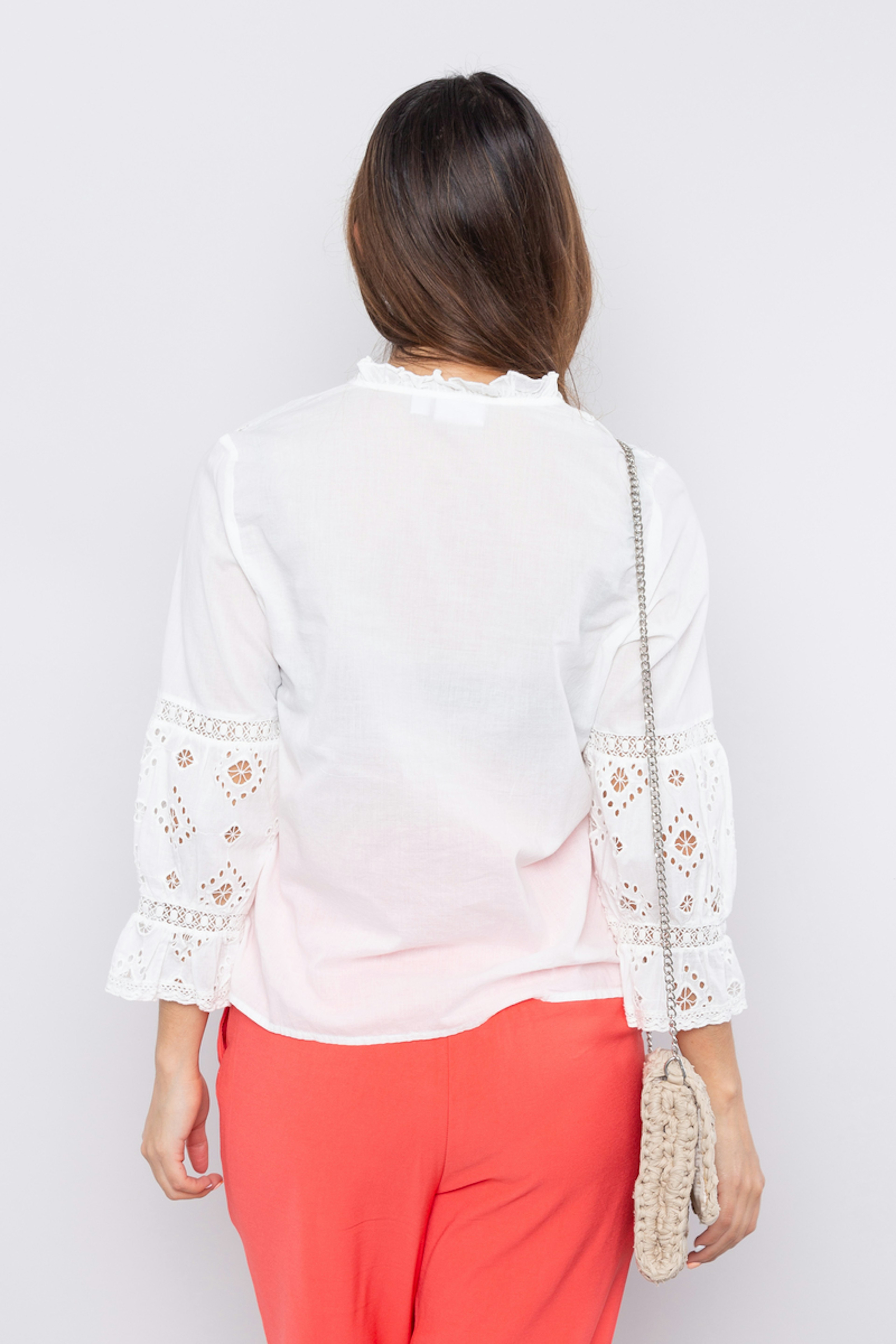 โข Chemise manches 3/4 โข Coloris รฉcru โข Dรฉtails de broderie anglaise โข Col ras-du-cou