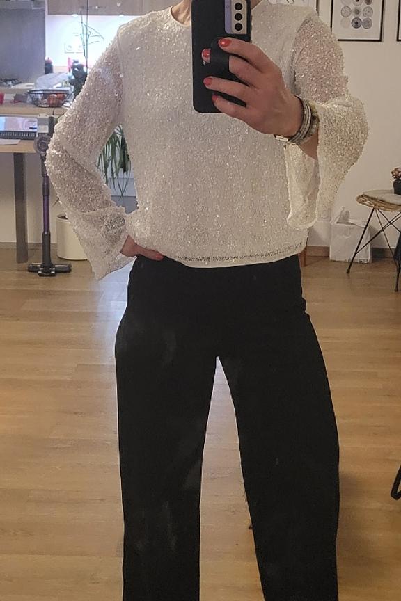 “Agréable à porter et ma coupe est flatteuse. Attention cependant car les fils brillants s'accrochent aux perles”