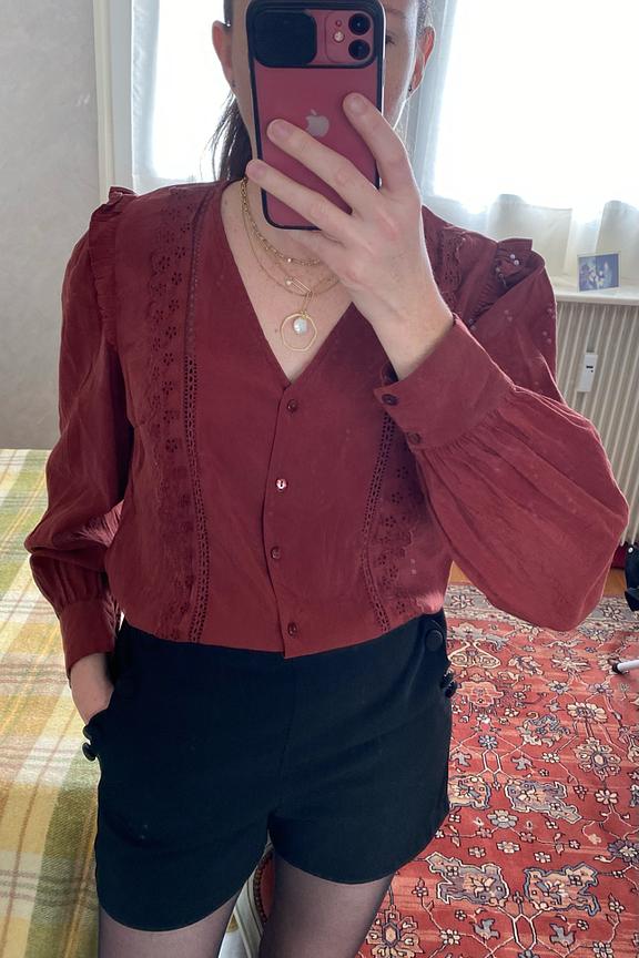 โข Blouse ร manches longues brique โข Dรฉtails de broderie โข Col V โข Boutons devant โข Viscose ecovero
