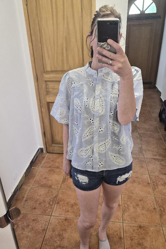Associez ce haut à un short taille haute pour une allure estivale décontractée et chic. • Chemise à manches courtes • Col Mao élégant • Manches amples • Design broderie anglaise • Motif paisley