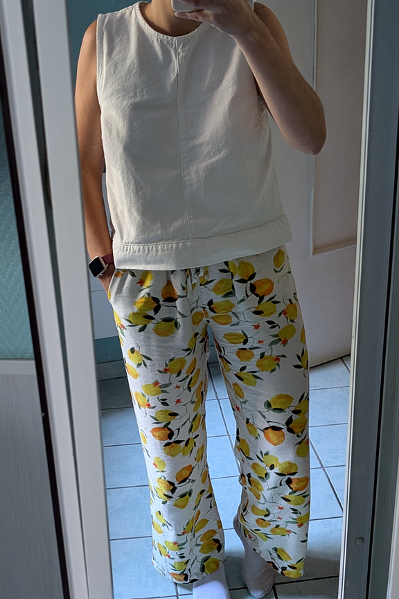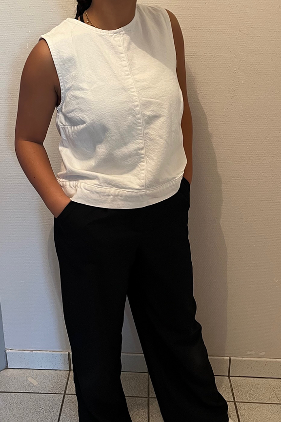 Associez ce haut blanc avec un pantalon fluide et des sandales colorรฉes pour un look estival et รฉlรฉgant. โข Haut sans manches โข Coupe ample โข Encolure ronde โข Ourlet droit โข Tissu en coton รฉcologique