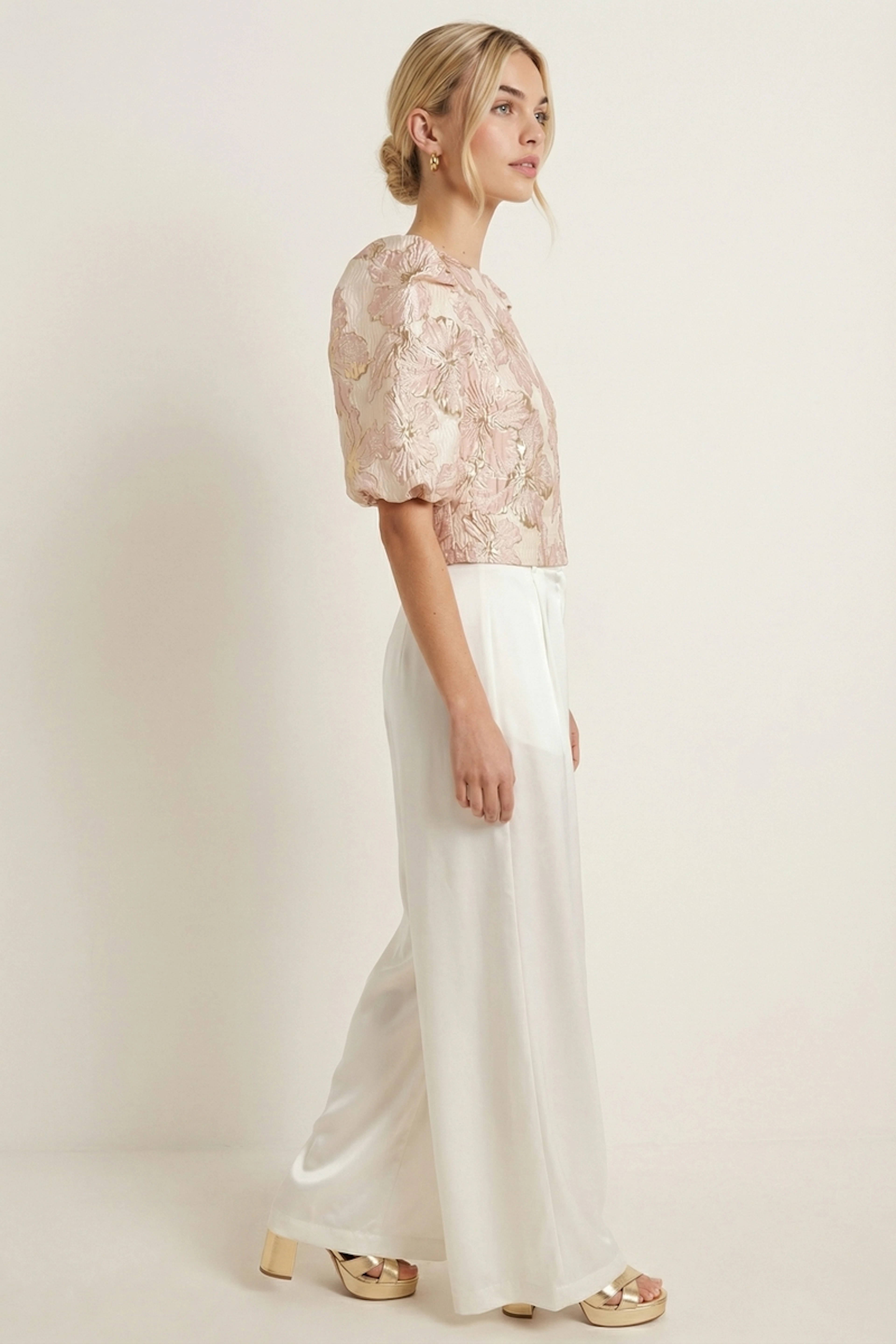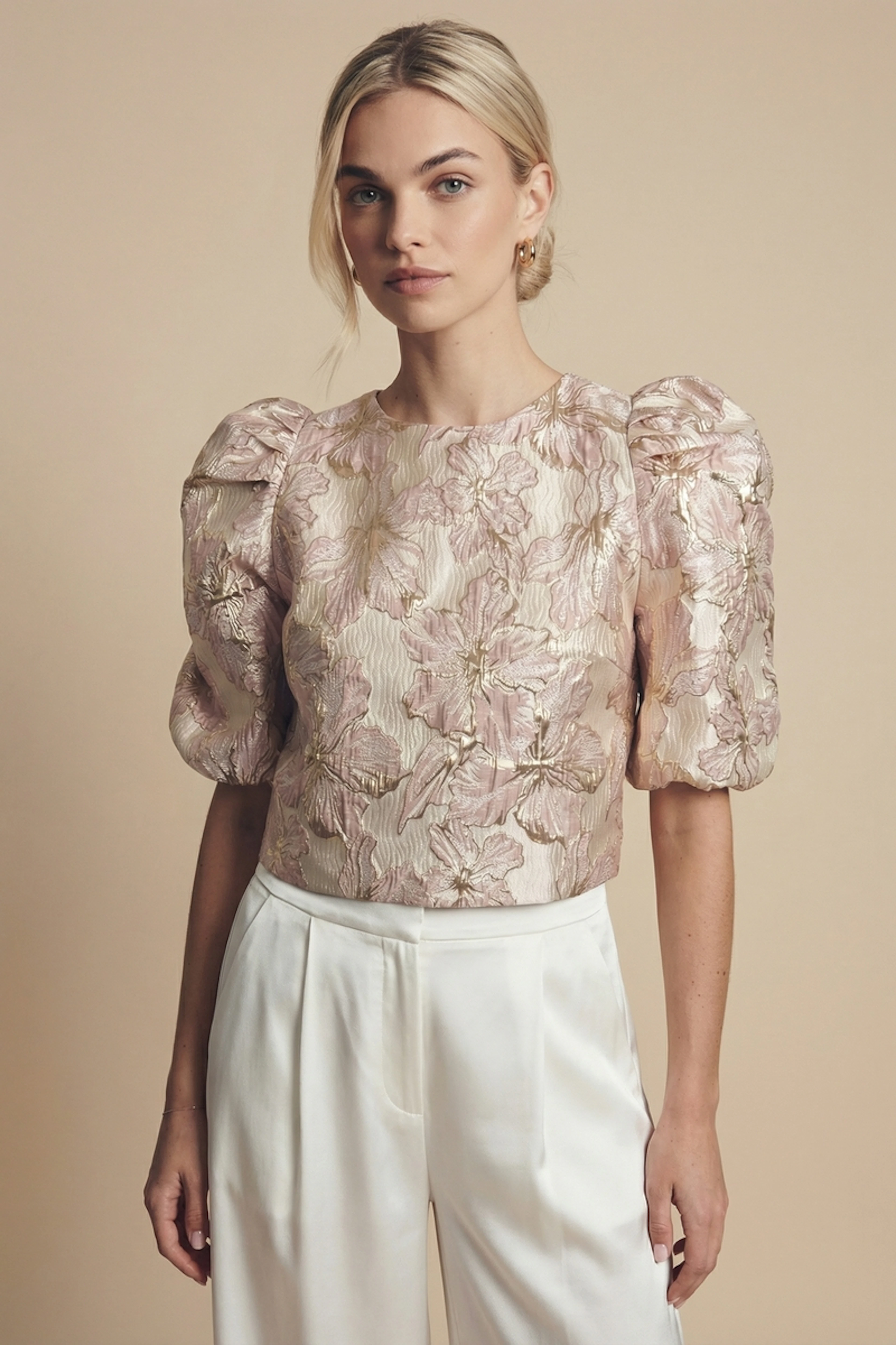 Associez ce haut à une jupe fluide pour une allure estivale chic. Ajoutez des sandales dorées et des boucles d'oreilles délicates pour un look élégant. • Haut élégant • Manches bouffantes • Coupe ajustée • Col rond • Motif floral