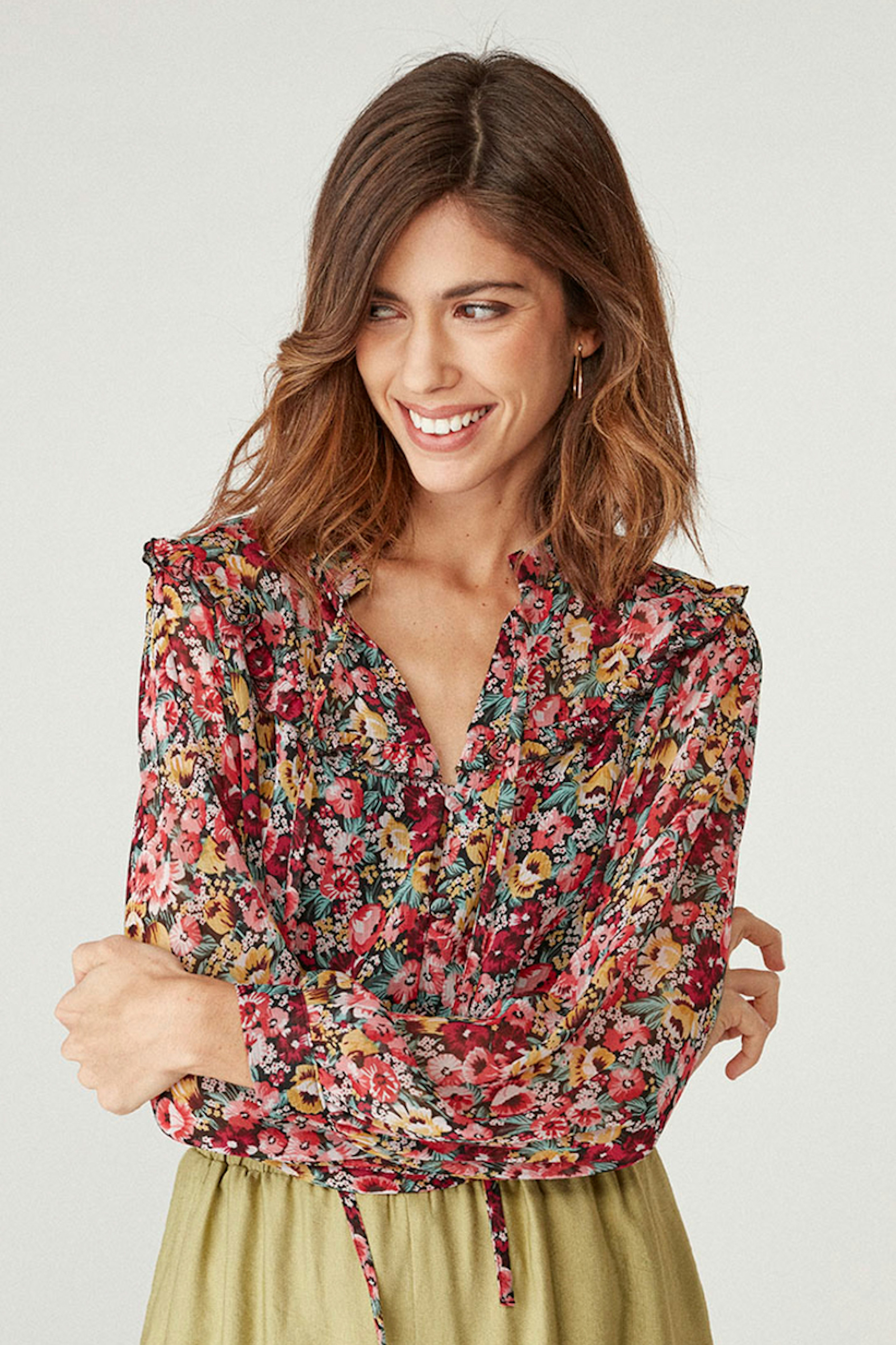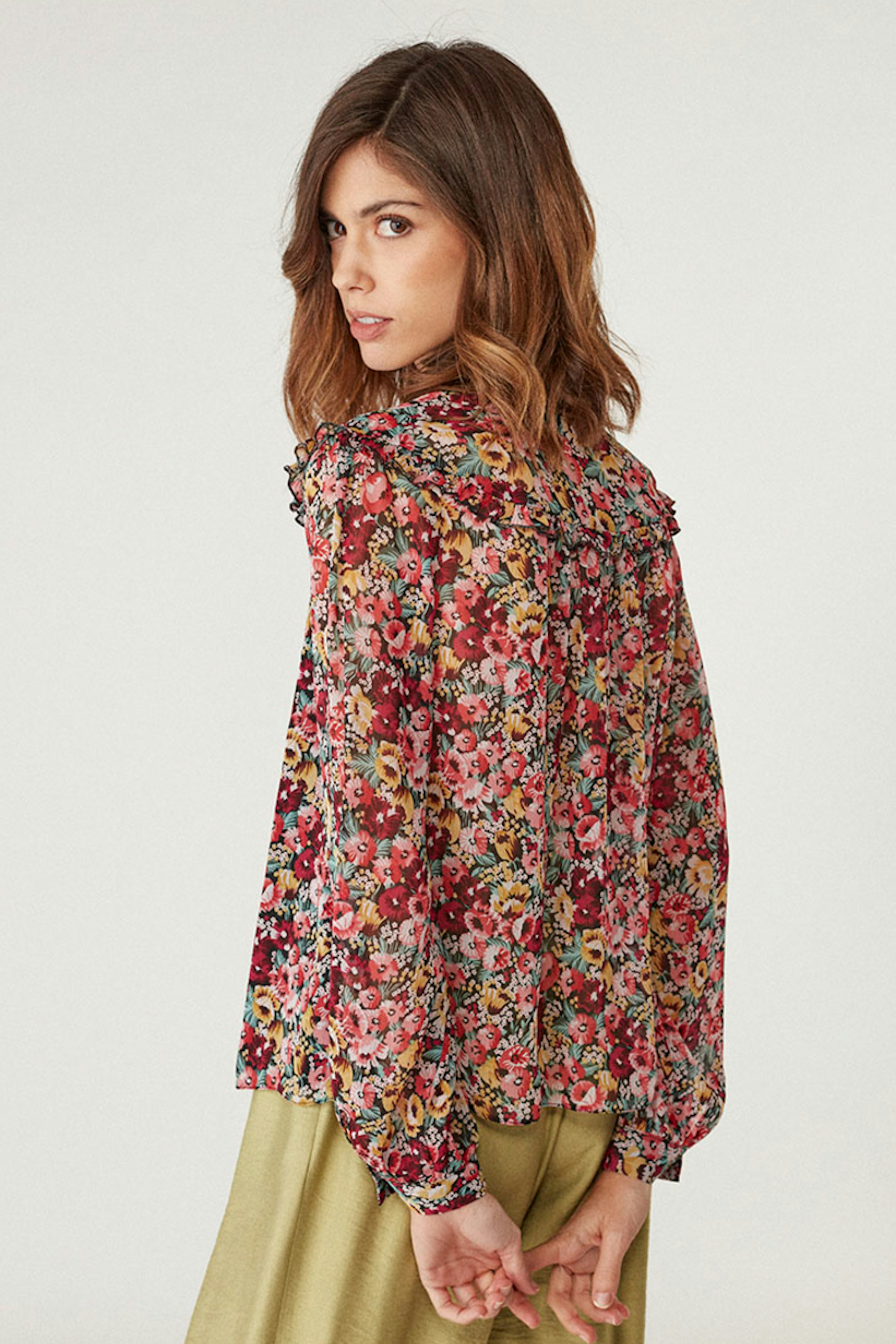 โข Blouse ample โข Motif fleuri โข Dรฉtail volant โข Manches longues fermรฉes par un bouton effet goutte d'eau โข Cinq boutons รฉlastiquรฉs ร l'avant โข Cordon ร nouer au niveau du col โข Dos et manches transparentes โข Doublรฉe ร l'avant
