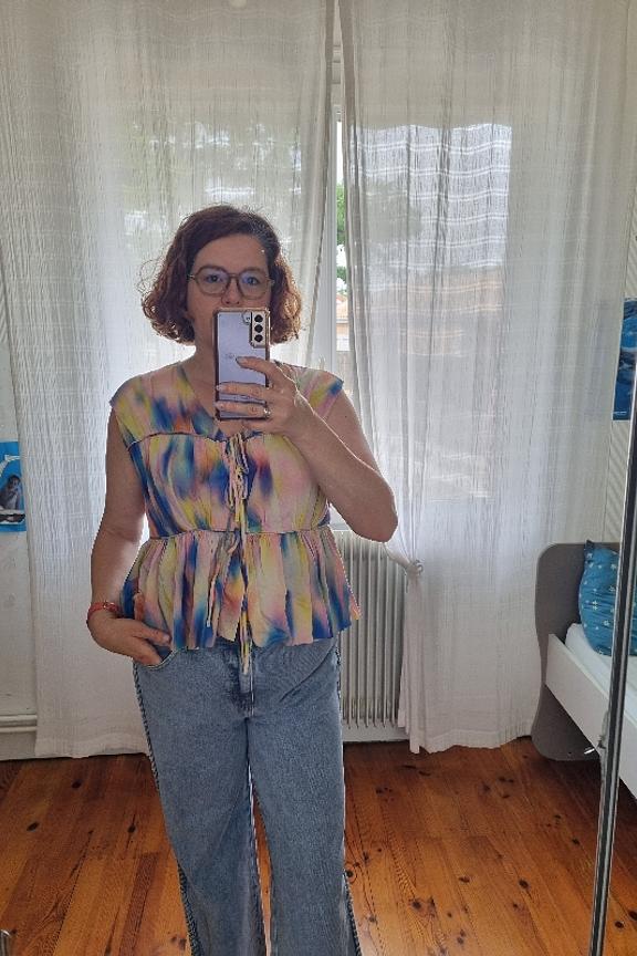 Ce haut coloré s'harmonise merveilleusement bien avec un pantalon en lin beige et des sandales en cuir pour un look estival et léger. • Haut à motifs colorés • Coupe sans manches • Liens à nouer à l'avant • Basque évasée • Imprimé dynamique