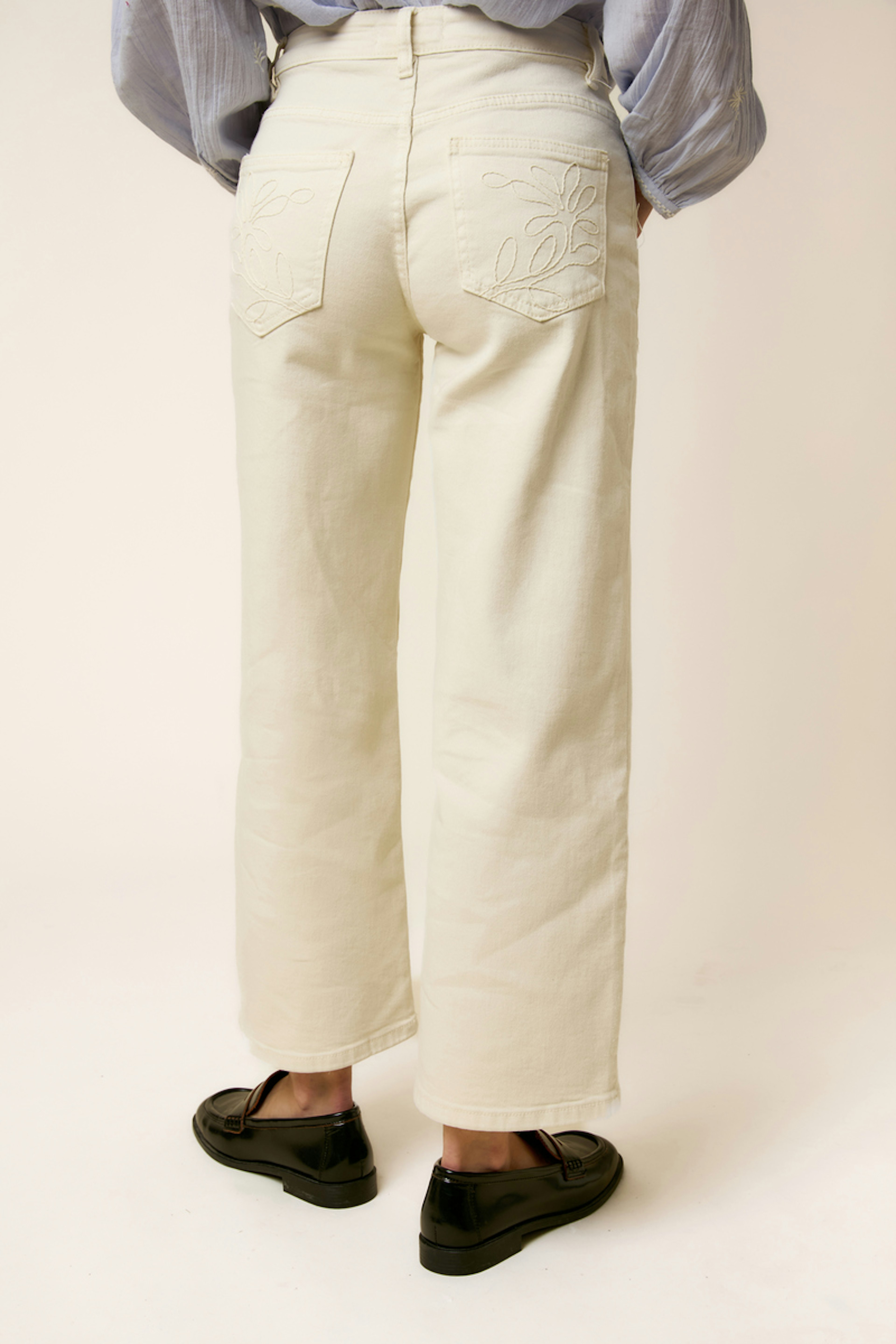 Associe ce jean à une blouse légère et des mocassins pour une élégance décontractée. • Jean coupe droite • Taille haute flatteuse • Jambes larges et amples • Longueur cheville • Motif imprimé subtil