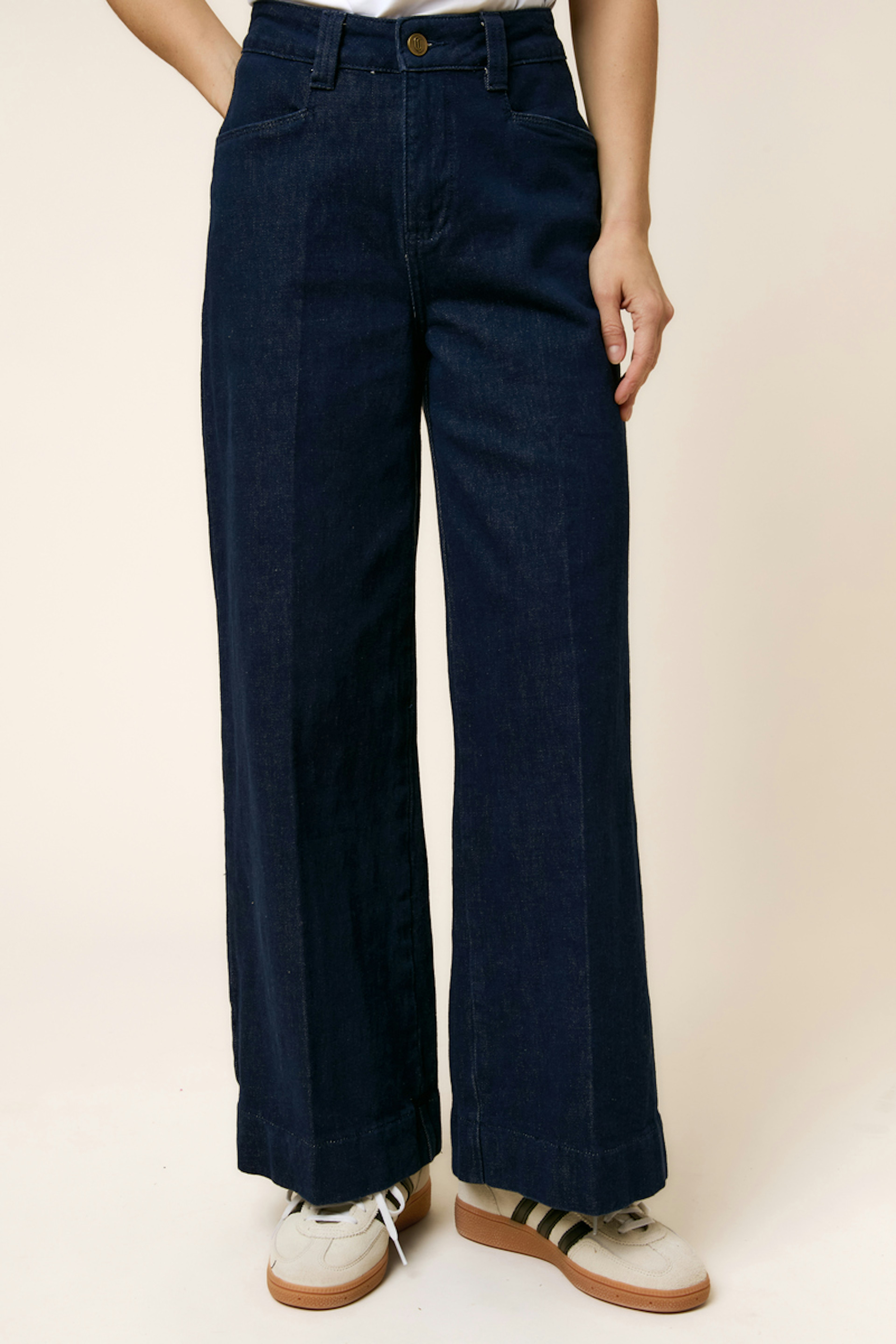 Associez ce jean avec une blouse en soie et des bottines pour une touche chic. Parfait pour les journées printanières ou automnales. • Jean large • Coupe ample • Taille haute • Jambes longues et fluides • Tissu bleu en coton doux