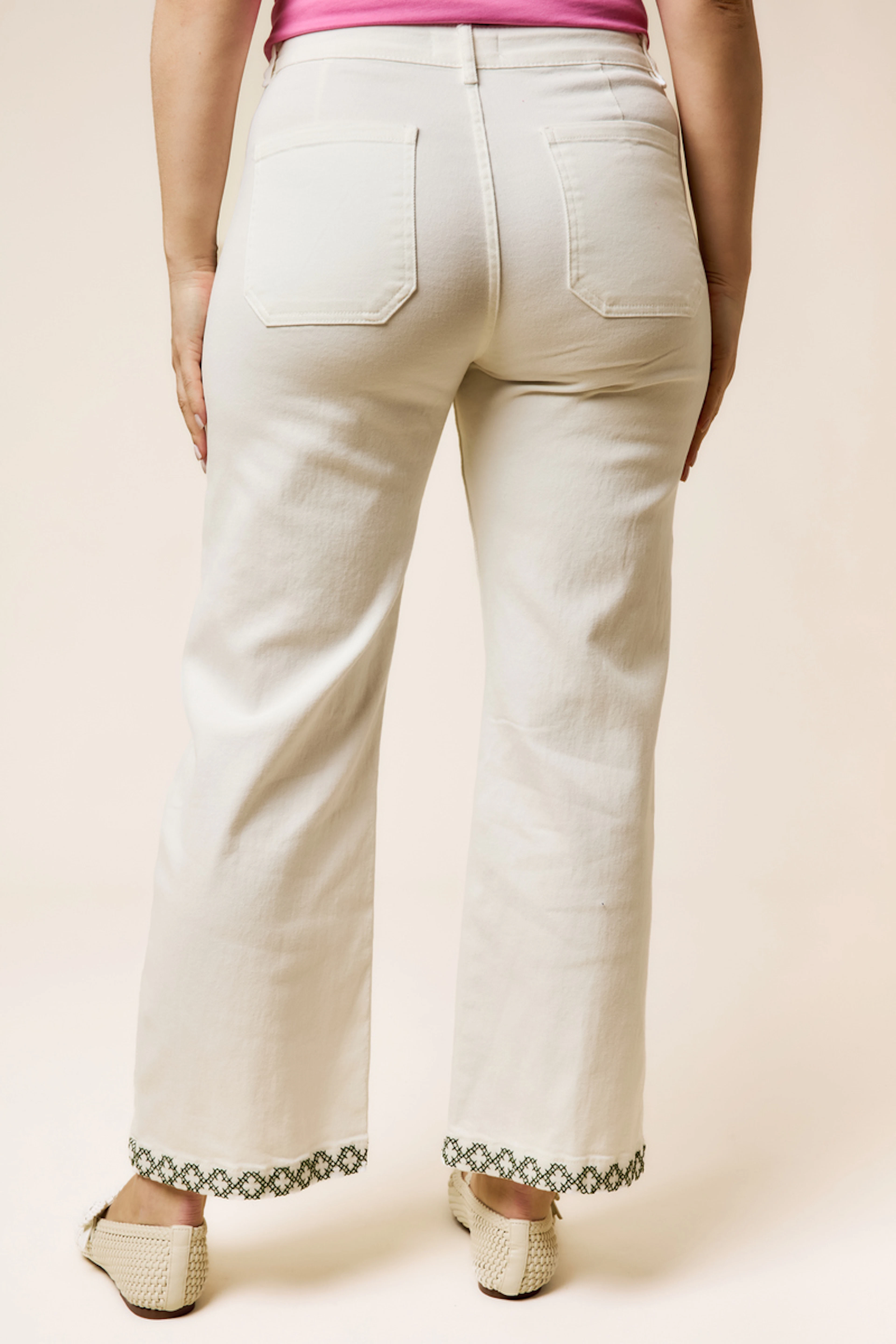 Portez ce jean avec un débardeur léger et des sandales décontractées pour les journées estivales. Parfait pour les promenades ensoleillées. • Jean droit en coton • Taille haute flatteuse • Détails brodés aux poches • Coupe droite • Ourlet brodé original