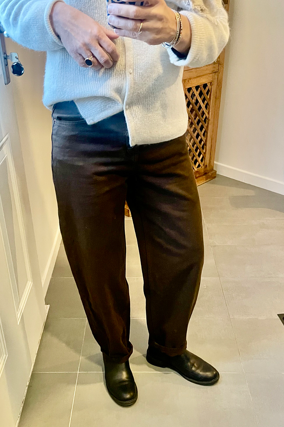 “Un peu long pour moi malgré mon 1m70. Sinon coupe sympa. Couleur marron foncée très facilement accordable et change du jean bleu ou noir.”