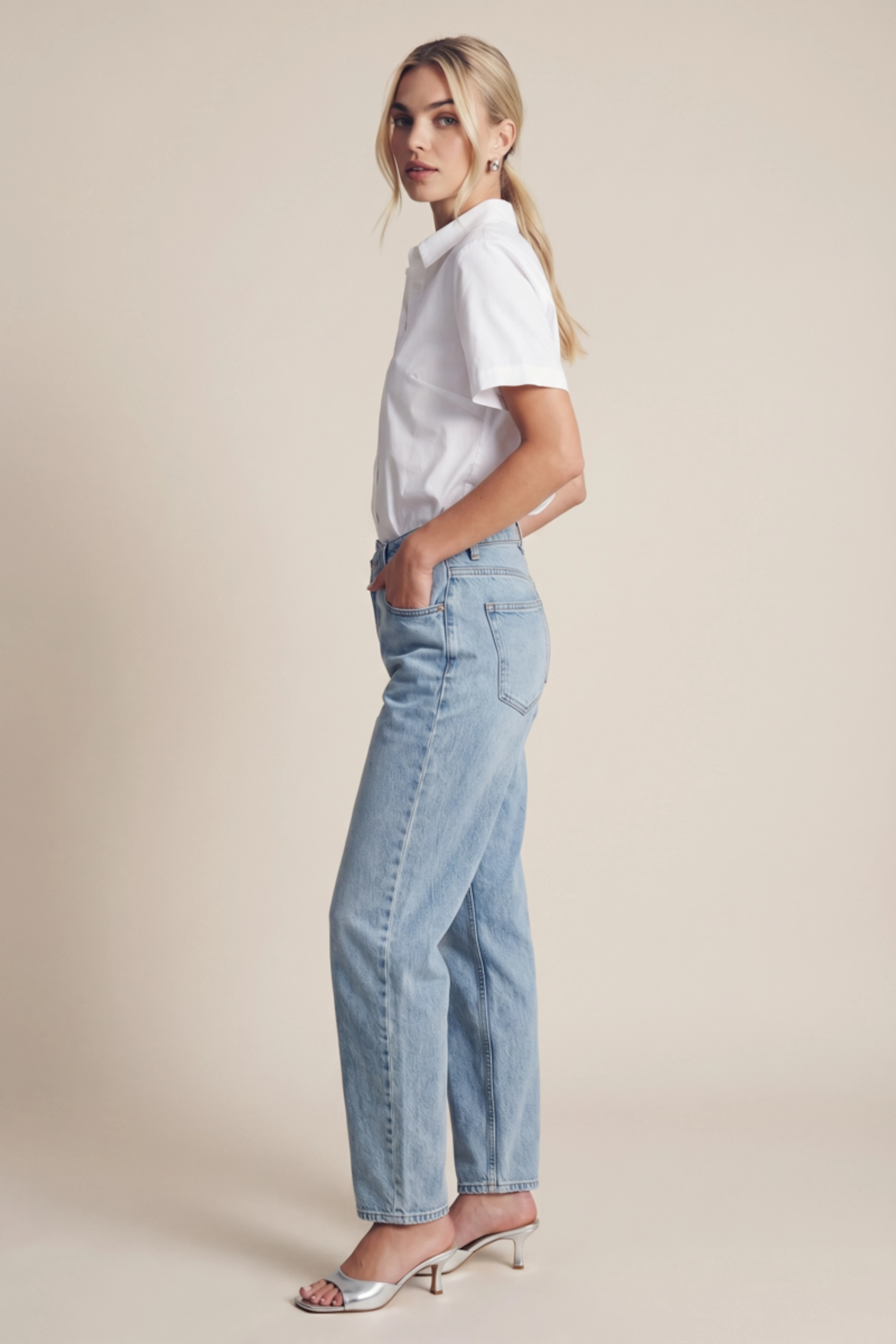 Associez ce jean intemporel à des chemisiers fluides et des mocassins pour une allure décontractée et élégante. Parfait en toute saison. • Jean coupe droite • Taille mi-haute • Finition classique • Longueur jusqu'à la cheville • Délavage léger