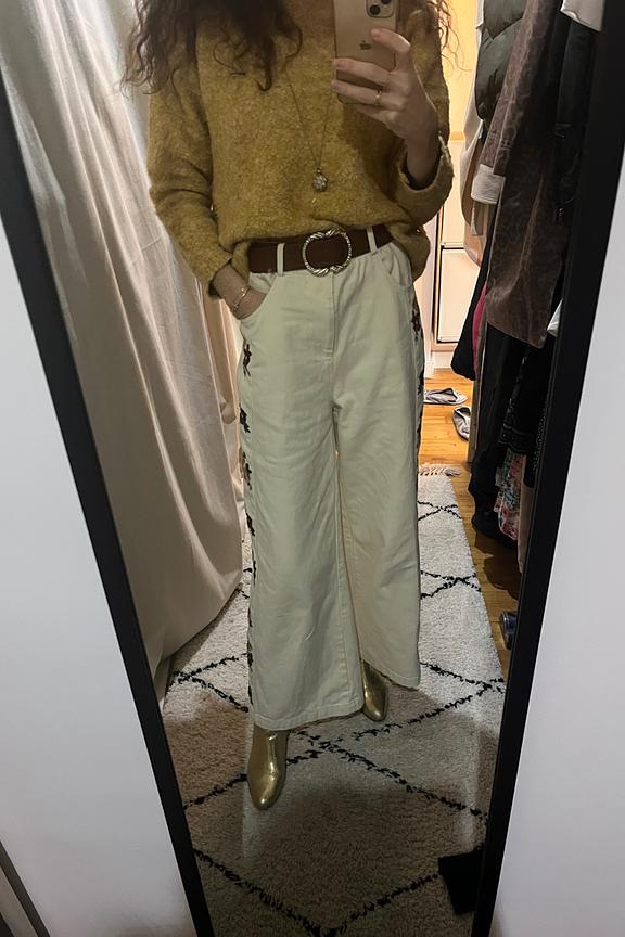 Optez pour un look bohรจme en associant ce jean avec un haut en dentelle et des accessoires en cuir. Parfait pour un style dรฉcontractรฉ-chic toute l'annรฉe. โข Jean ample โข Taille haute โข Broderies florales โข Coupe large โข 100% coton