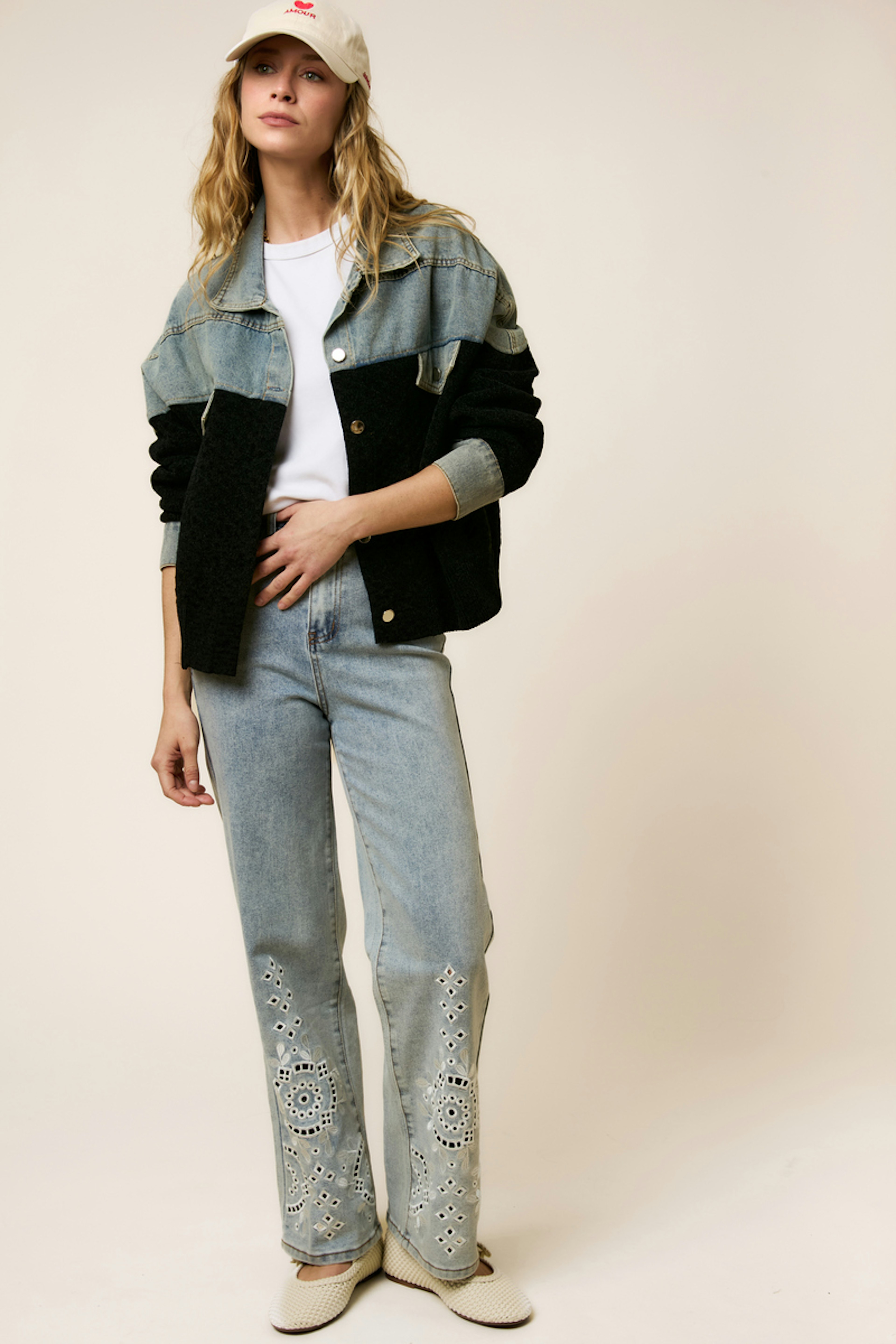 Ce jean orné de motifs s'accorde parfaitement avec une blouse fluide et des bottines en cuir noir pour un chic raffiné. Parfait en toute saison. • Coupe droite • Taille haute flatteuse • Longueur élégante • Détails brodés distinctifs • Denim bleu classique