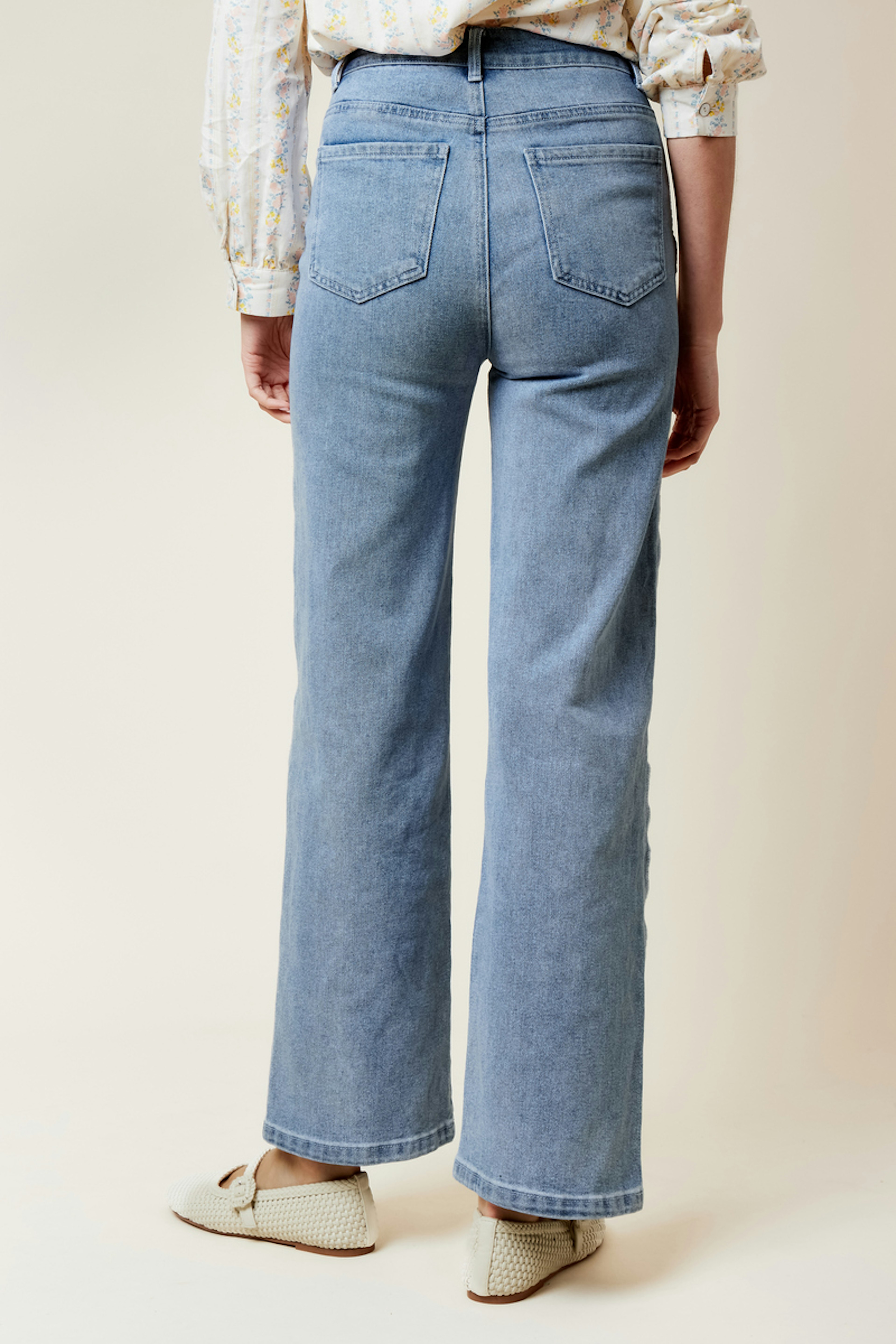 Associez ce jean bleu avec un chemisier léger et des bottines beige pour un look chic en toute occasion. • Jean coupe droite • Taille classique • Détail ondulé sur les côtés • Bleu clair intemporel • Élasthanne pour plus de confort
