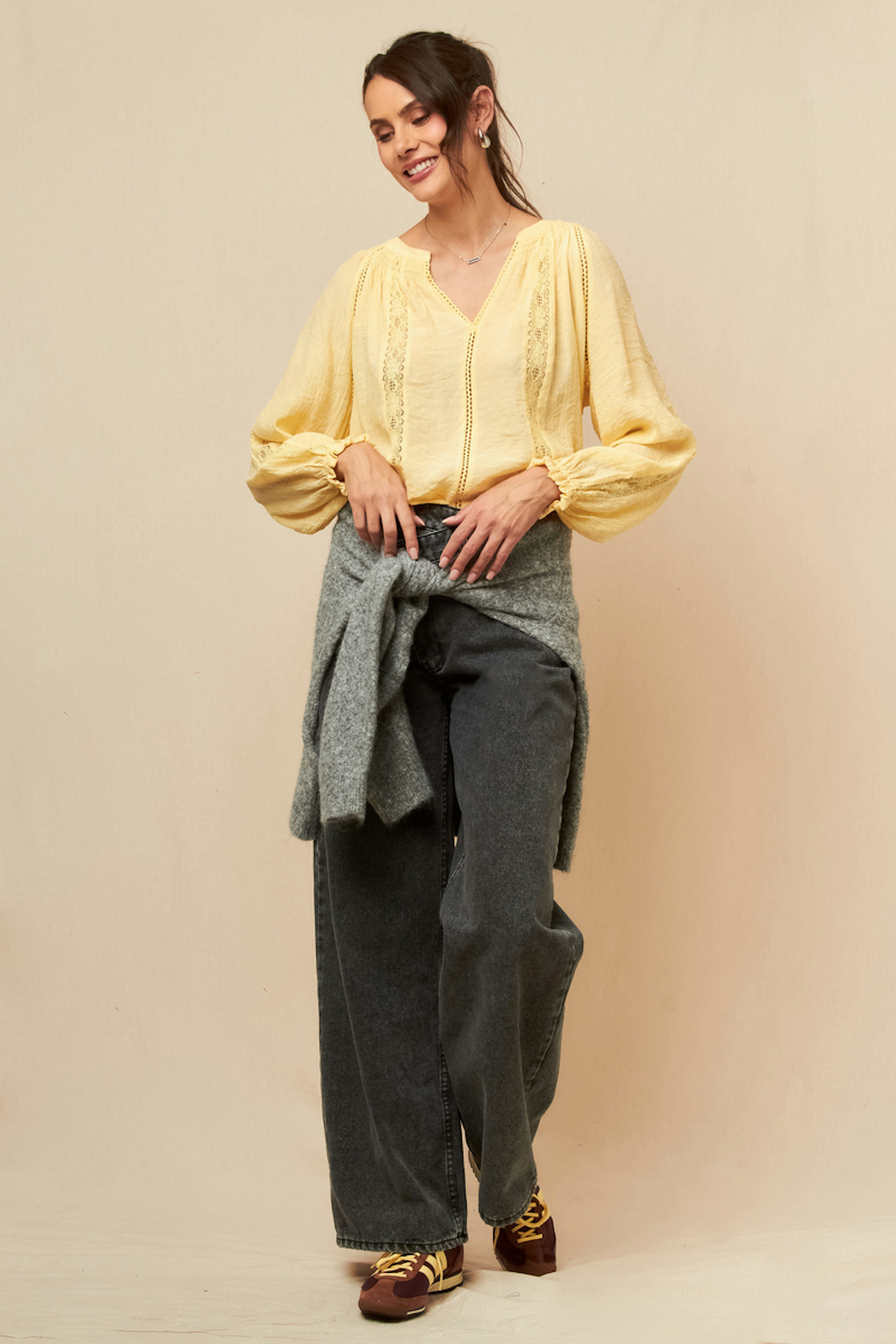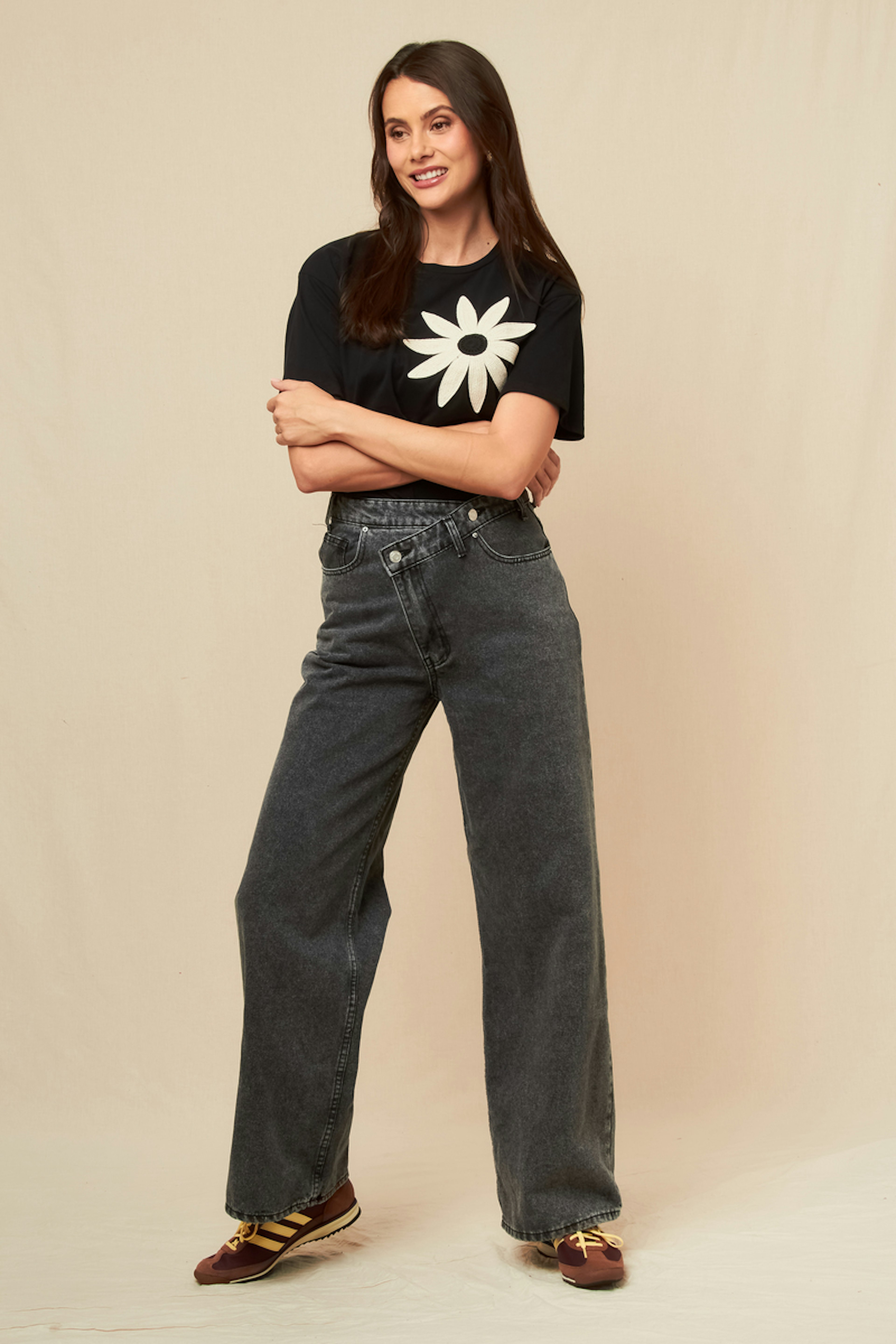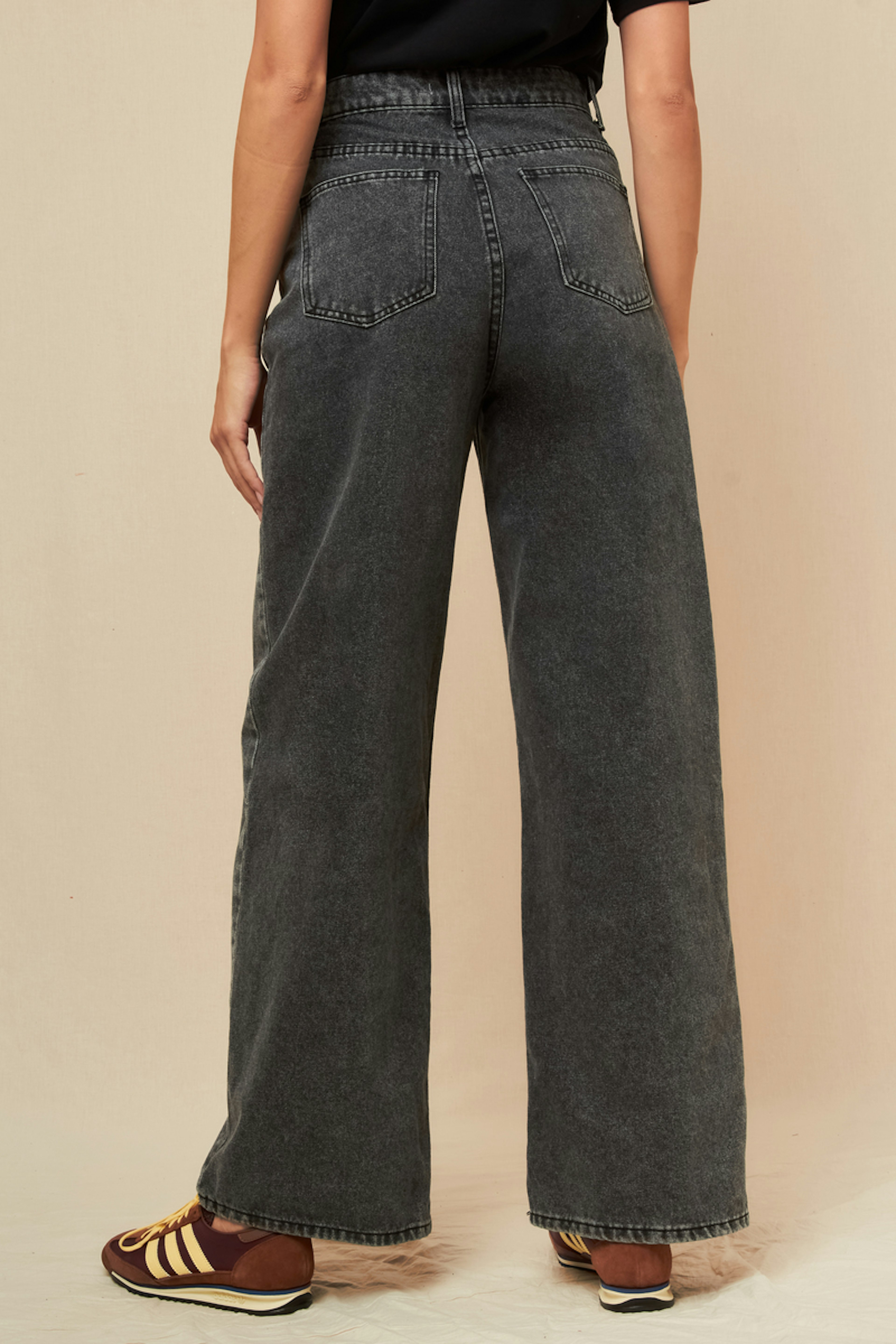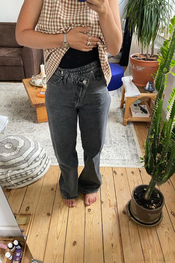 Associez ce jean gris à un chemisier fluide et des escarpins pour une allure chic et décontractée. Parfait en toute saison. • Jean coupe large • Taille haute flatteuse • Longueur au sol • Style décontracté • Effet délavé moderne